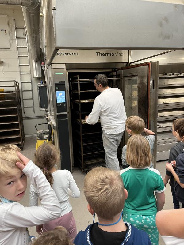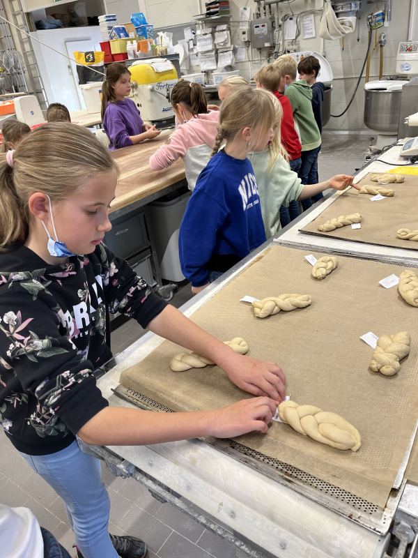 Die Kinder konnten die riesigen Knetmaschinen bestaunen, damit einen Hefeteig herstellen und später einen eigenen Hefezopf flechten. Dieser wurde am nächsten Tag nach Merfeld geliefert und jeder konnte sein eigenes Meisterwerk probieren.