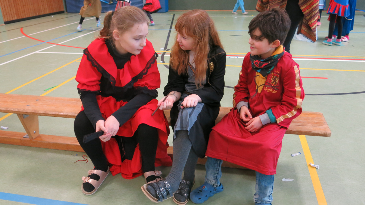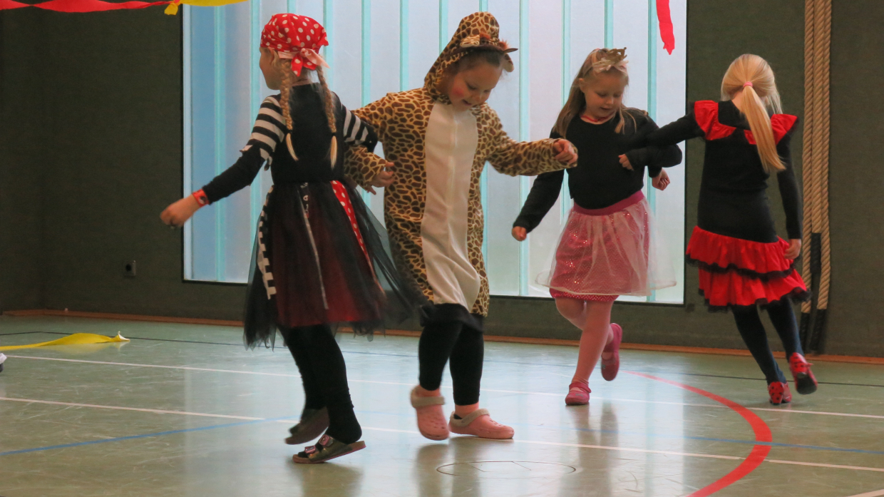 In den Tagen zuvor war die Schule mit selbstgebastelten Luftschlangen, Girlanden und vielen lustigen Clowns bunt geschmückt worden. Aus allen Klassen kamen tolle Ideen zusammen und die ein oder andere Idee der Nachbarklasse wurde gerne nachgebastelt. Bunt kostümiert wurde am Freitag zunächst in den Klassen gefeiert. Nach Spielen wie Stopptanz, Zeitungstanz oder Reise nach Jerusalem konnten sich alle an leckeren Buffets stärken. Im Anschluss an die Klassenfeier gab es eine lange Polonaise durch alle Klasse in die Turnhalle. Hier wurde Einiges geboten! Die Kinder der 4m hatten extra für diesen Tag einen Rap eingeübt, den sie uns vorstellten. Das Publikum war begeistert! Auch die Klasse 1m führte einen tollen Tanz vor – wir duften alle zugucken, abgucken und mitmachen. Natürliche durfte auch das Fliegerlied nicht fehlen und alle sangen und tanzten laut mit.