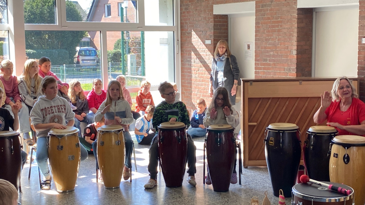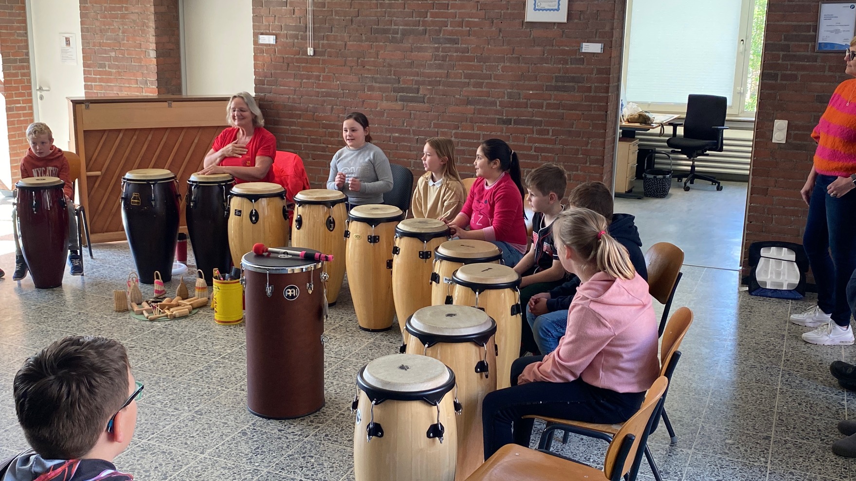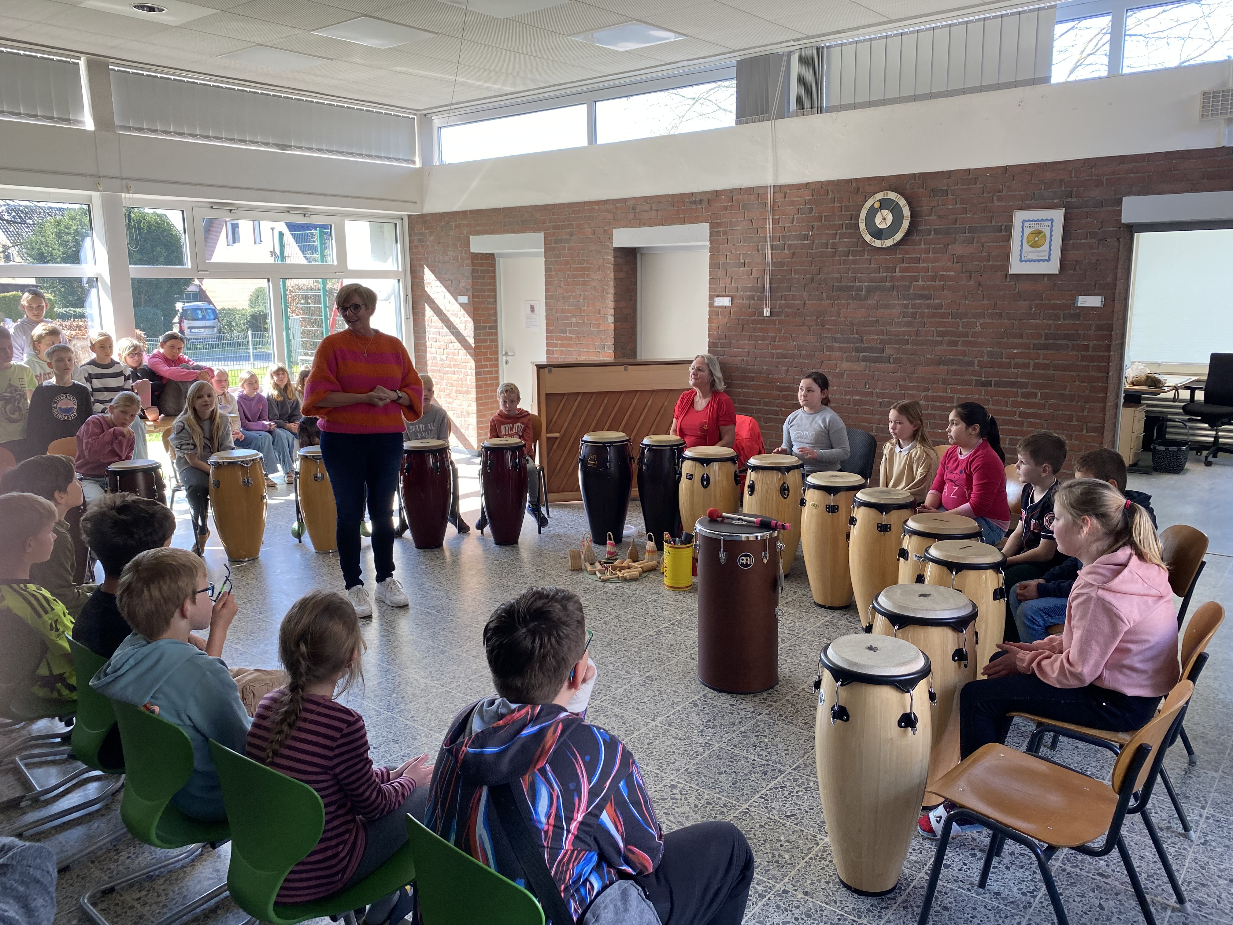 Seit einigen Jahren schon arbeitet die Musikerin und Trommel-Lehrerin aus Münster-Wolbeck regelmäßig mit unseren SchülerInnen und bereichert damit das musikalische Angebot unserer Schule. Finanziert wird das Projekt mit Mitteln aus dem NRW Landesprogramm Kultur und Schule.
