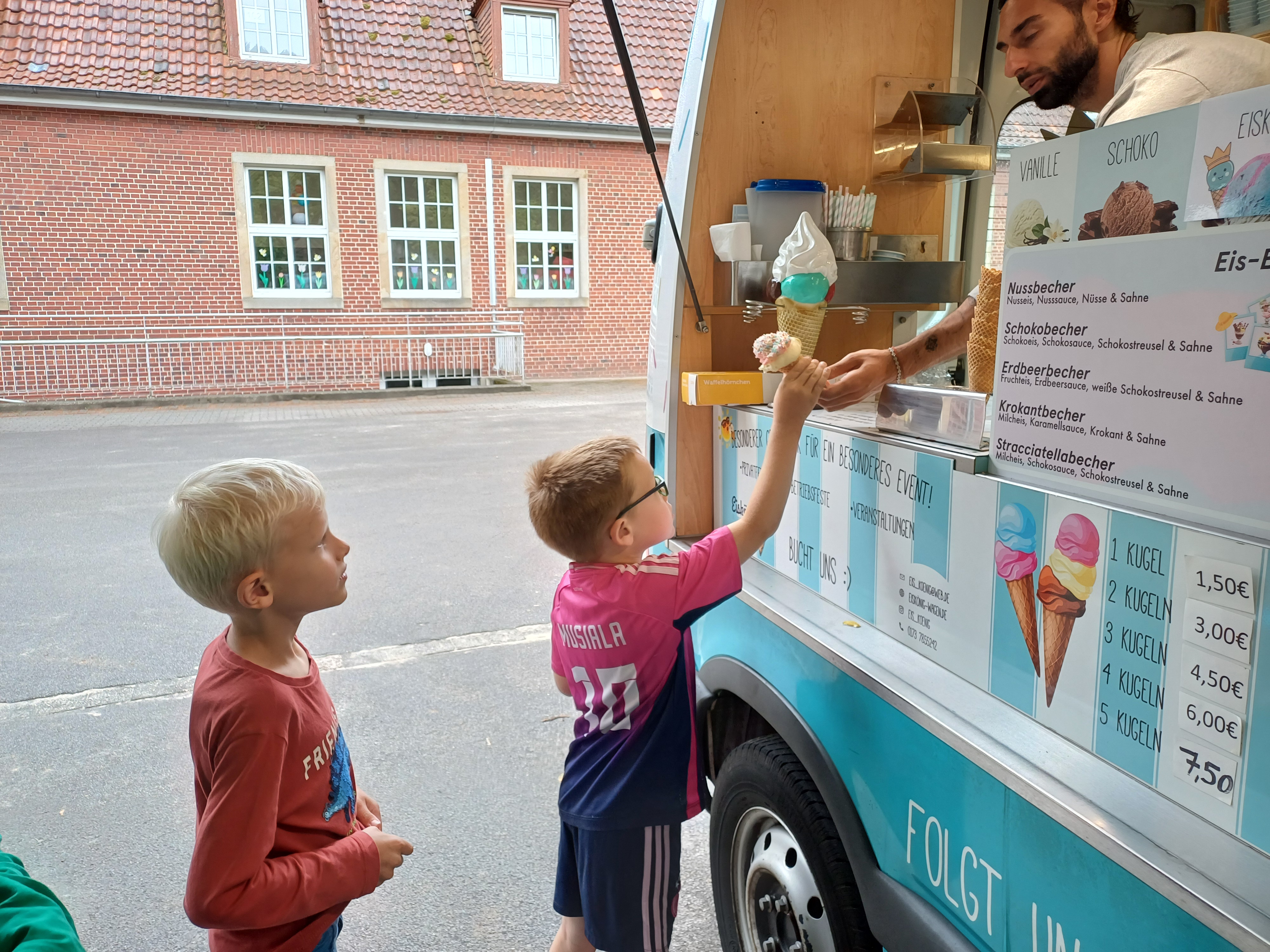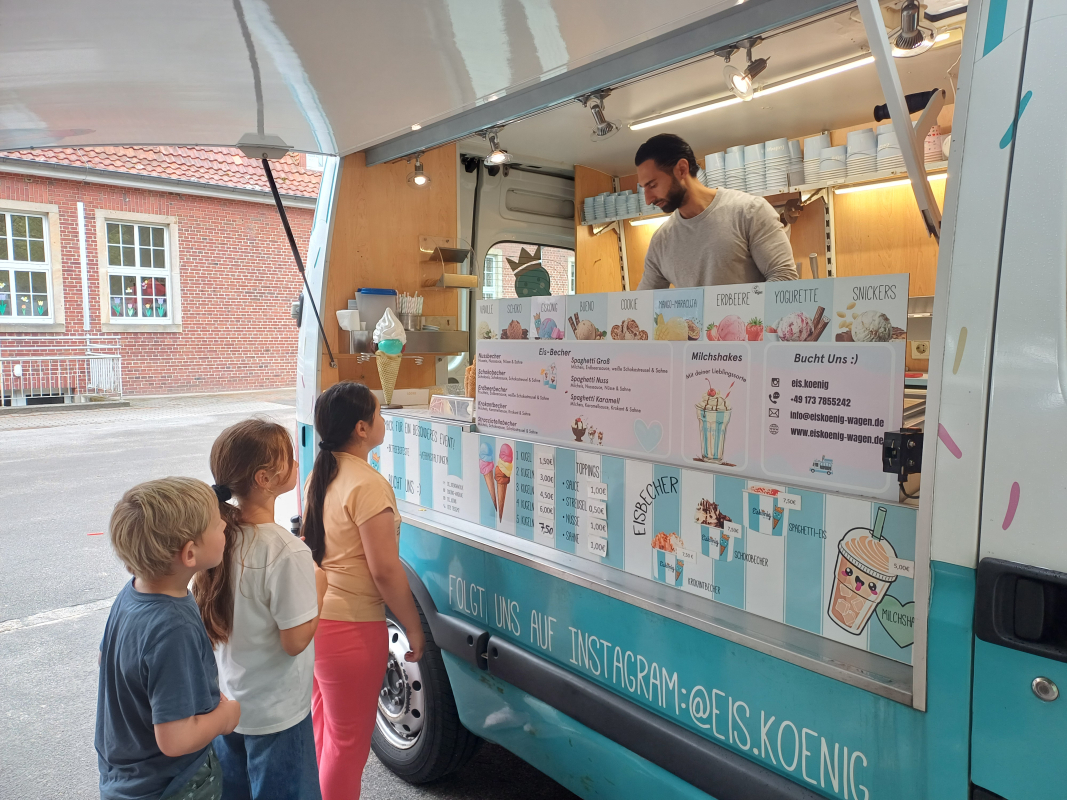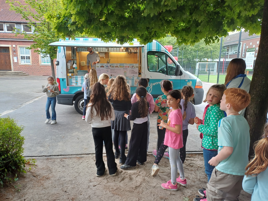 Das Schuljahr neigt sich dem Ende zu und die Sommerferien stehen vor der Tür. Zum krönenden Abschluss wurde den Kindern der Offenen Ganztagsschule (OGS) eine besondere Freude bereitet: Der Eiswagen des „Eiskönigs“ kam auf unseren Schulhof und verteilte kostenlos Eis an alle OGS-Kinder.