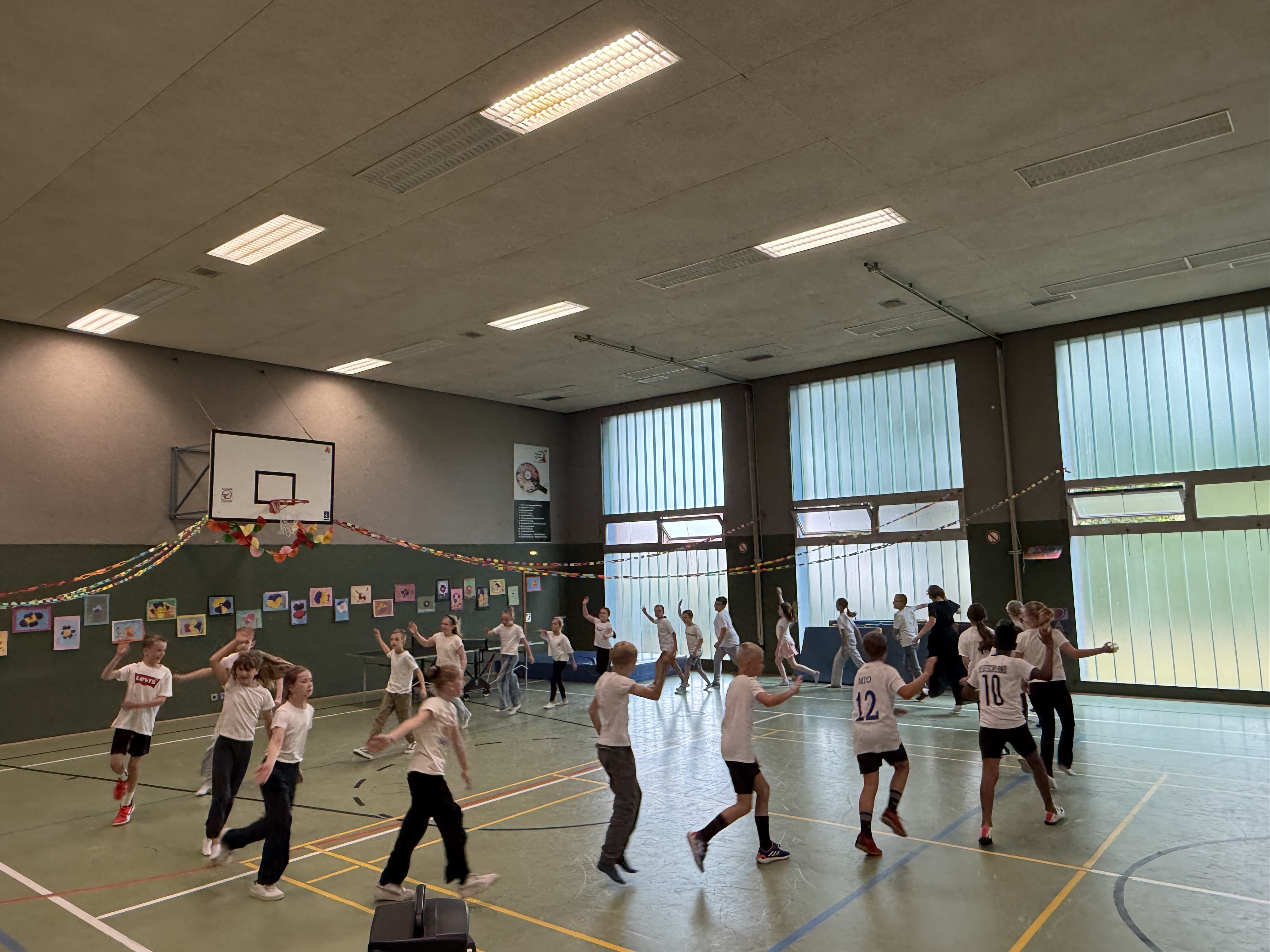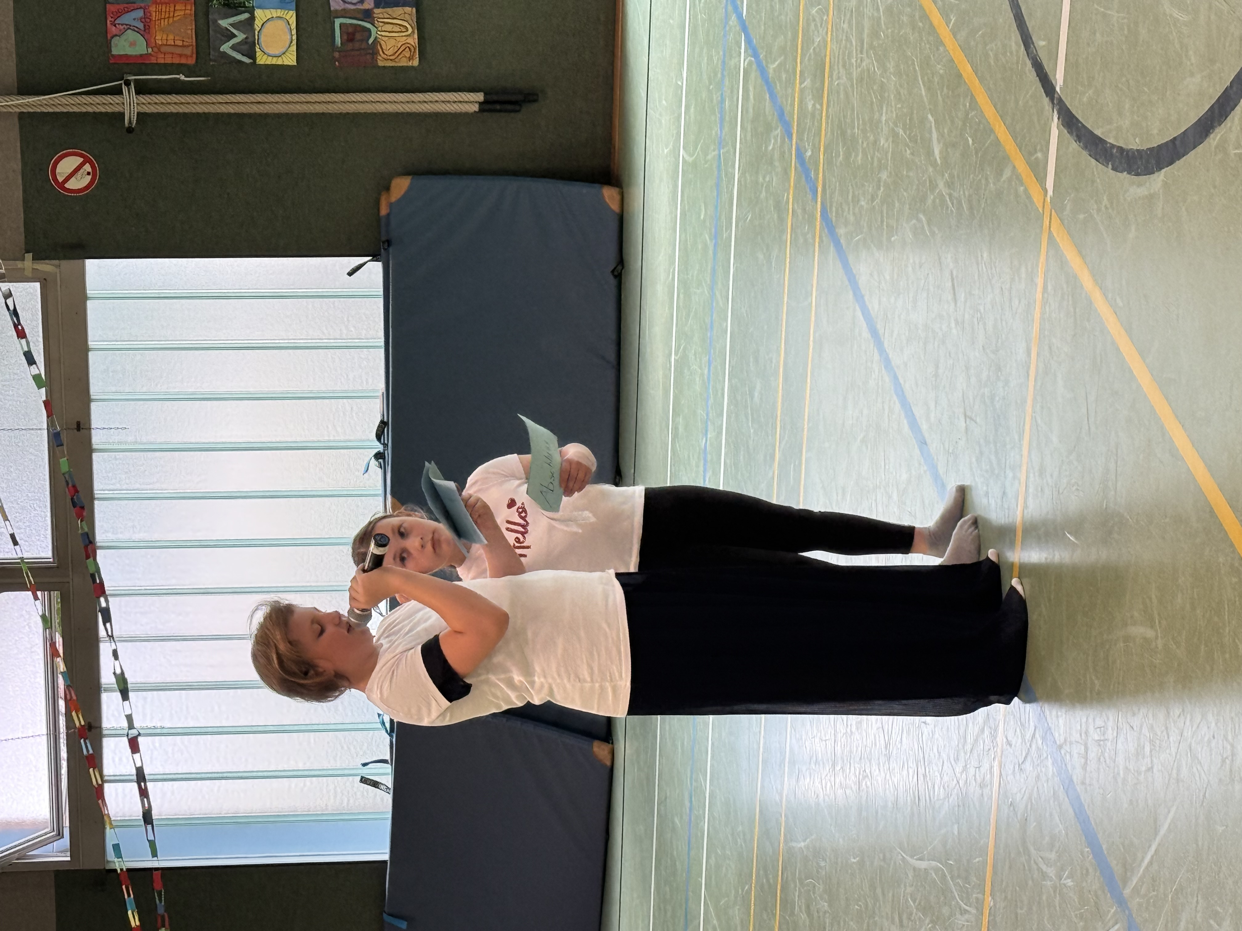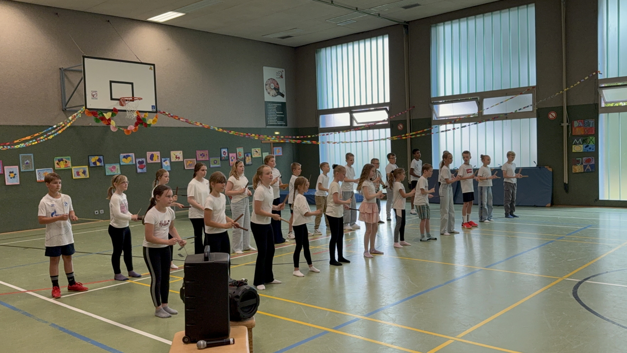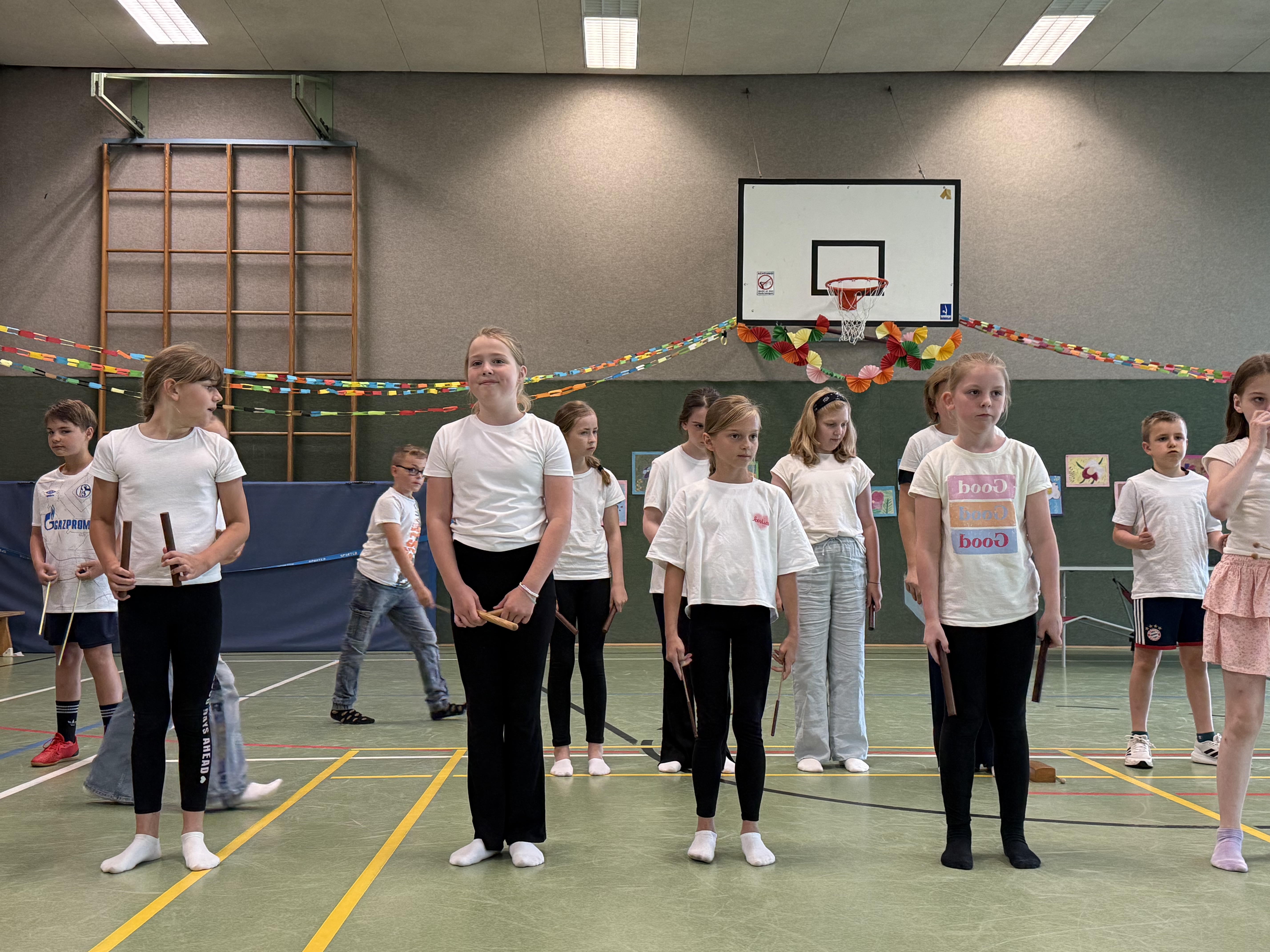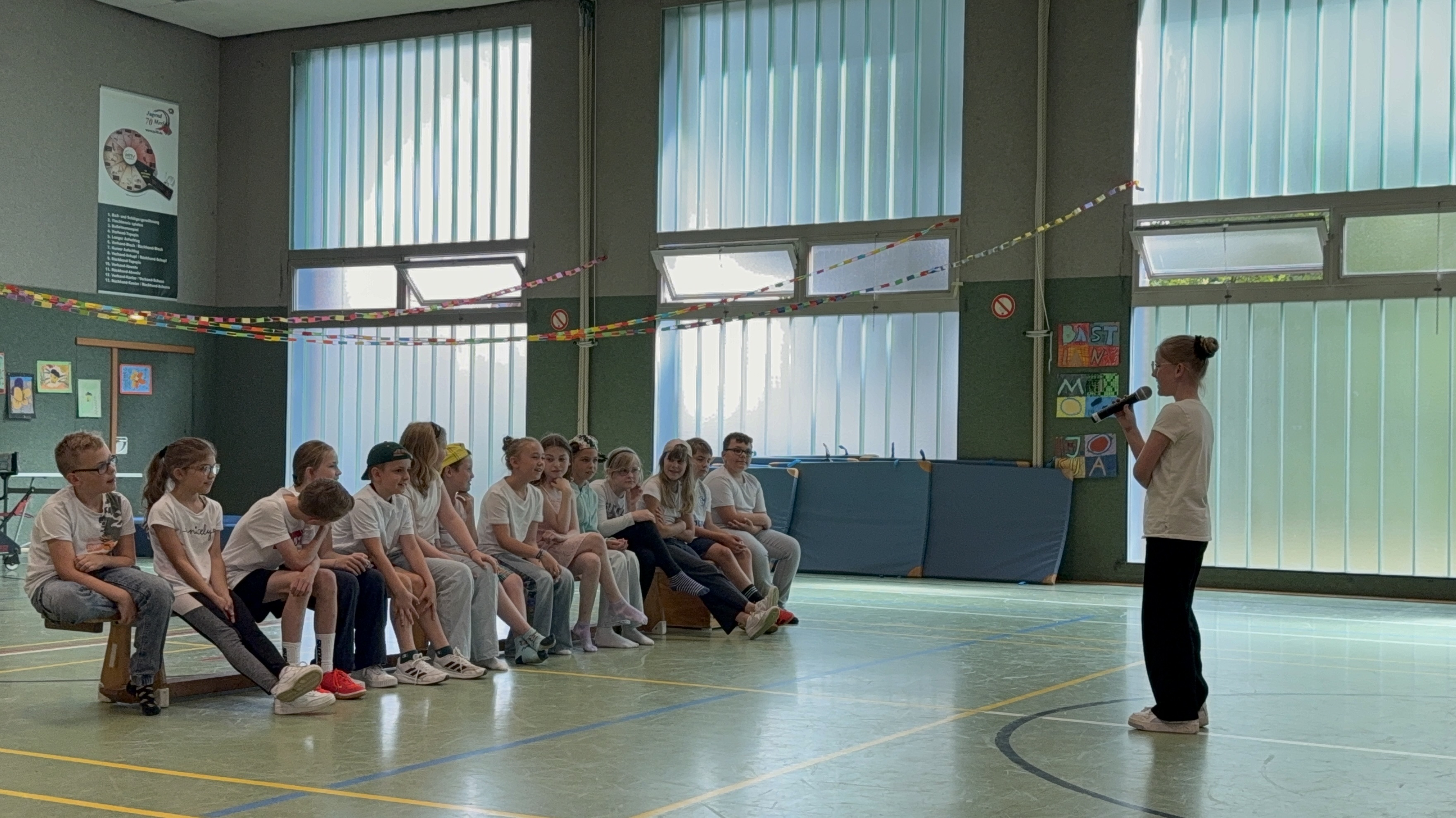 Mit einem bunten und fröhlichen Programm verabschiedete sich die Klasse 4m in der vergangenen Woche von ihrer Grundschulzeit. Gemeinsam mit ihrer Klassenlehrerin Frau Leuchten hatten die Kinder ein vielseitiges Programm auf die Beine gestellt. Mit Musik, Tanz, sportlichen Einlagen und humorvollen Beiträgen sorgten die Kinder für beste Unterhaltung und bewegten so manches Herz im Publikum.