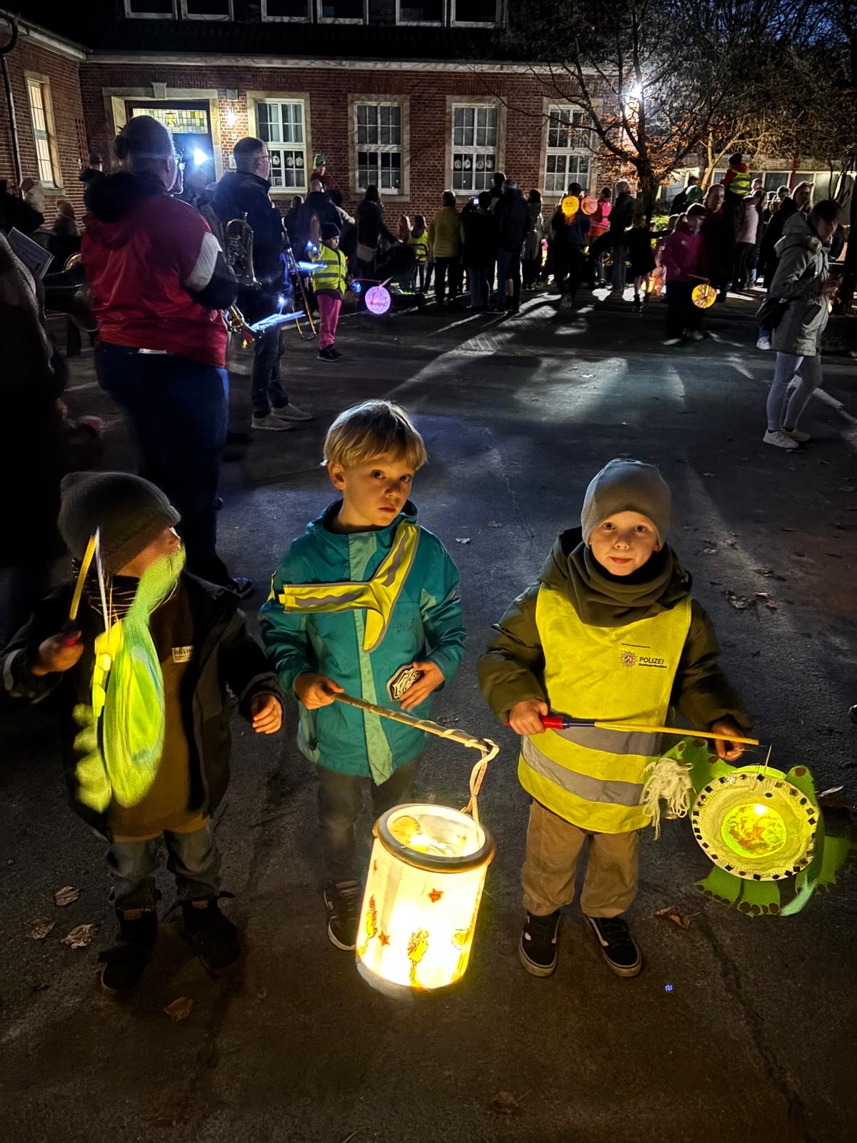 Ein herzlicher Dank gilt allen Helferinnen und Helfern, der Feuerwehr Merfeld und der Kreispolizei für die Absicherung des Zuges, der Schulpflegschaft für die Bewirtung, dem Förderverein sowie allen Eltern und Lehrkräften, die beim Basteln der Laternen und bei der Organisation tatkräftig unterstützt haben.