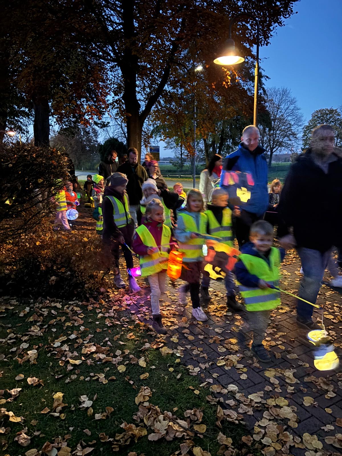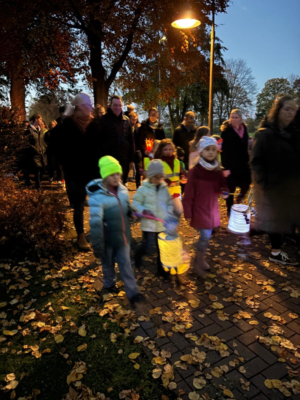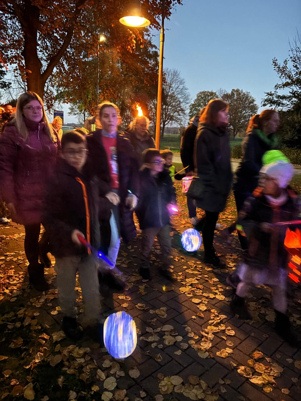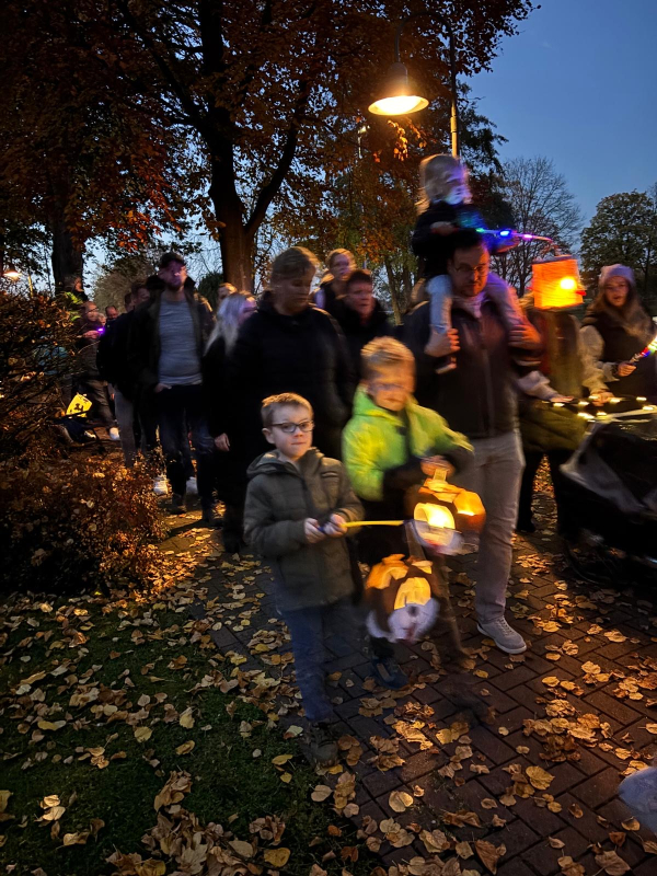 Angeführt wurde der Zug – wie in jedem Jahr – von Sankt Martin hoch zu Ross, der mit seinem leuchtend roten Mantel und Schwert die Geschichte vom Teilen und Helfen lebendig werden ließ. Für die musikalische Begleitung sorgte eine Bläsergruppe unter der Leitung von Werner Dillhage, die mit bekannten Laternenliedern für festliche Stimmung sorgte.