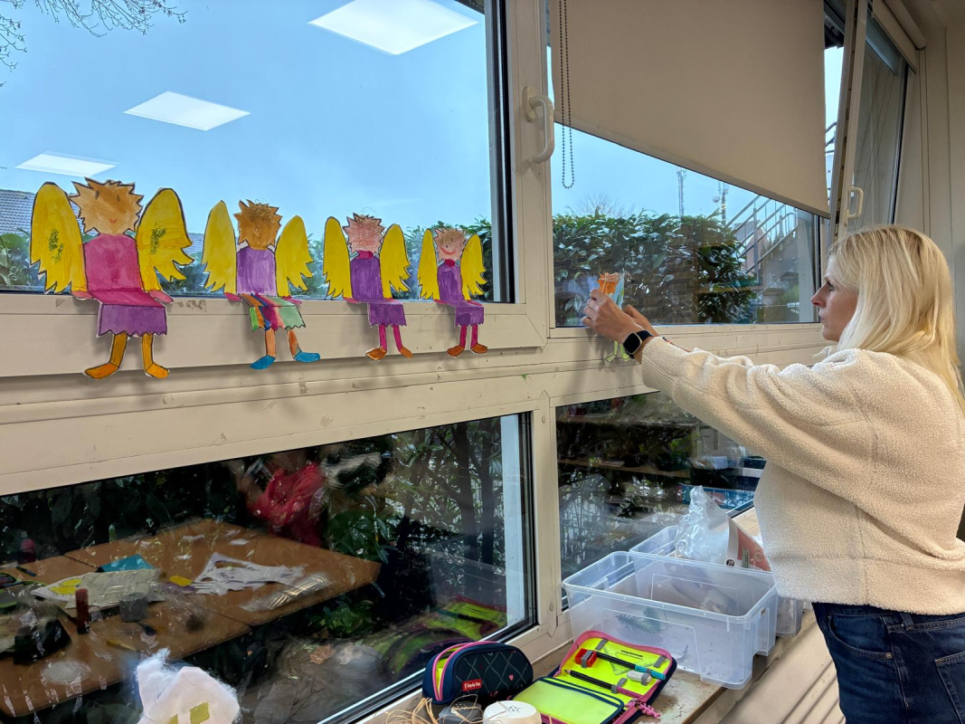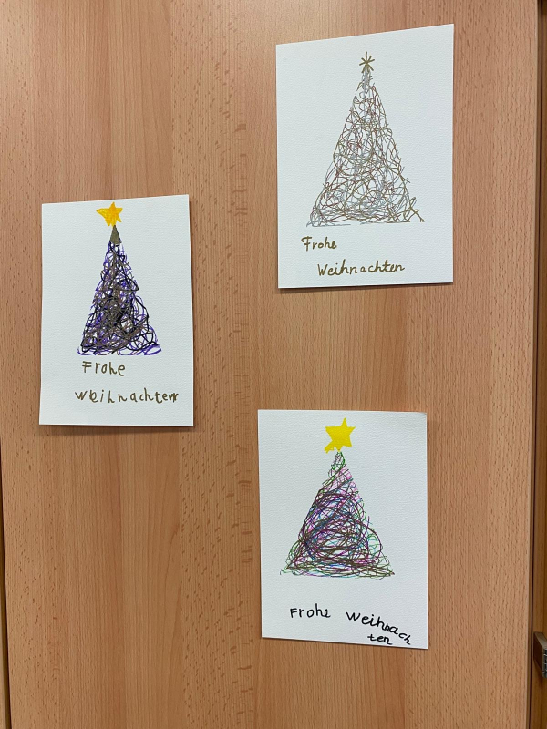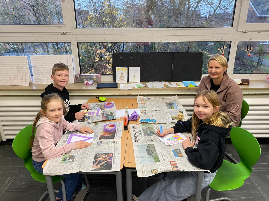 Danach startete das Basteln in allen Klassen. Überall wurde geklebt, geschnitten, gemalt und gelacht. Aus Papier wurden Sterne und Weihnachtsbäume, aus Glitzer entstanden glänzende Karten und kleine Anhänger für Zuhause oder den Klassenraum. Alle Gruppen hatten Weihnachtsmusik an und überall fühlte es sich gemütlich und weihnachtlich an.