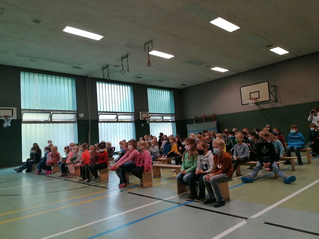 Und die Herzen der Kinder gewonnen! Was war das für ein Spaß und musikalischer Genuss. Natürlich wurde nach einer Zugabe gerufen. Den Wunsch erfüllten die Musiker und Schauspieler den Kindern gern. Und gemeinsam schmetterte die ganze Turnhalle das Europa-Kennzeichen-Lied.