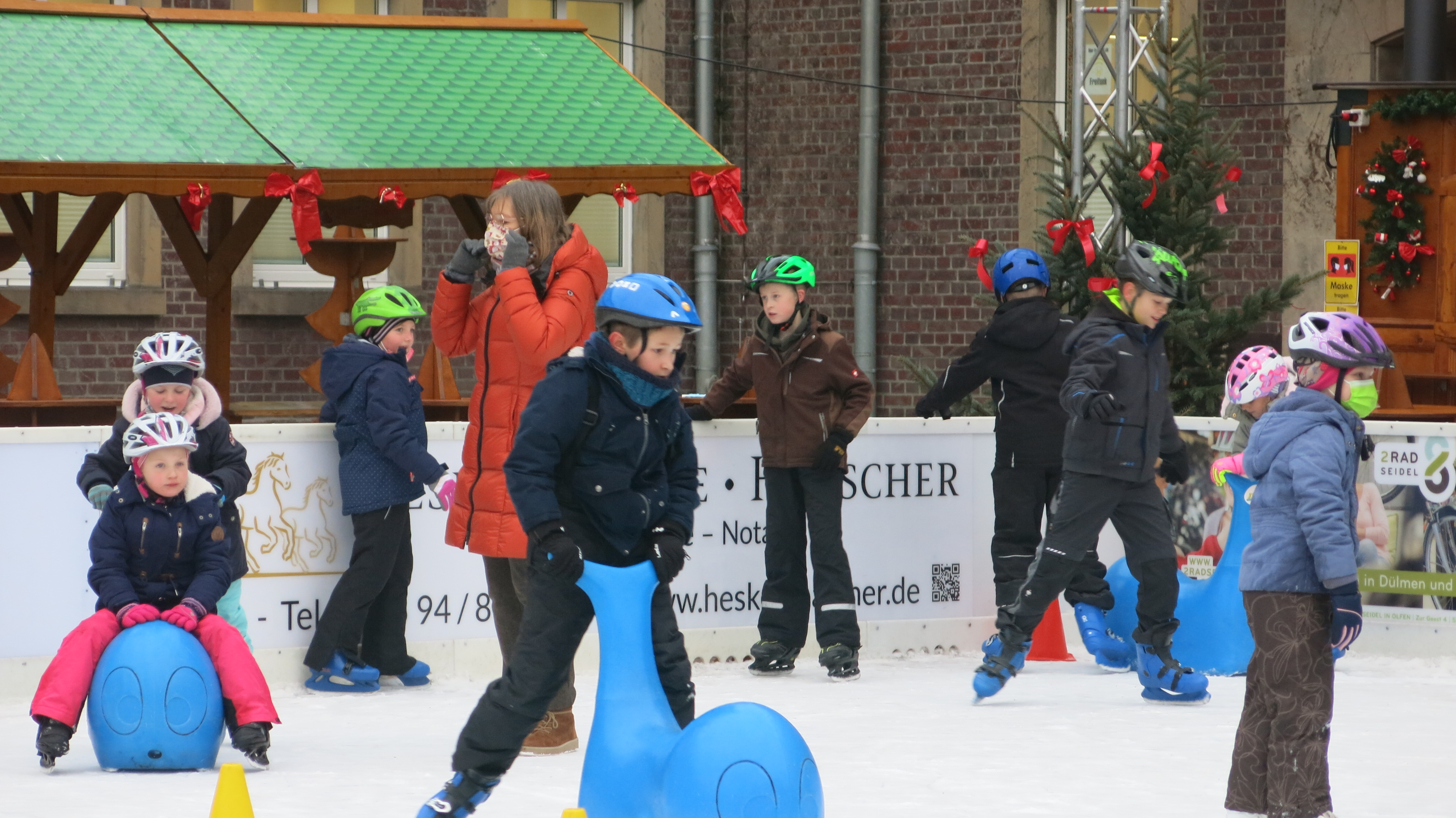 Anfang Dezember konnten sich die Kinder der Klassen 1m und 4m sowie der Klassen 2m und 3m jeweils eine Stunde auf der Eisbahn beim Schlittschuhlaufen ausprobieren und austoben. Die Eisbahn auf dem Dülmener Marktplatz ist mittlerweile fester Bestandteil des „Dülmener Winters“ mit dem Weihnachtsmarkt und der Rodelhütte sowie zahlreichen Veranstaltungen.