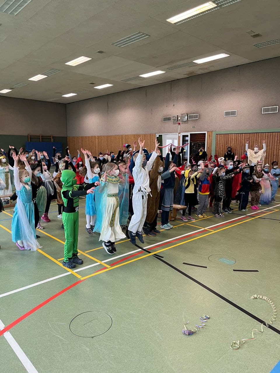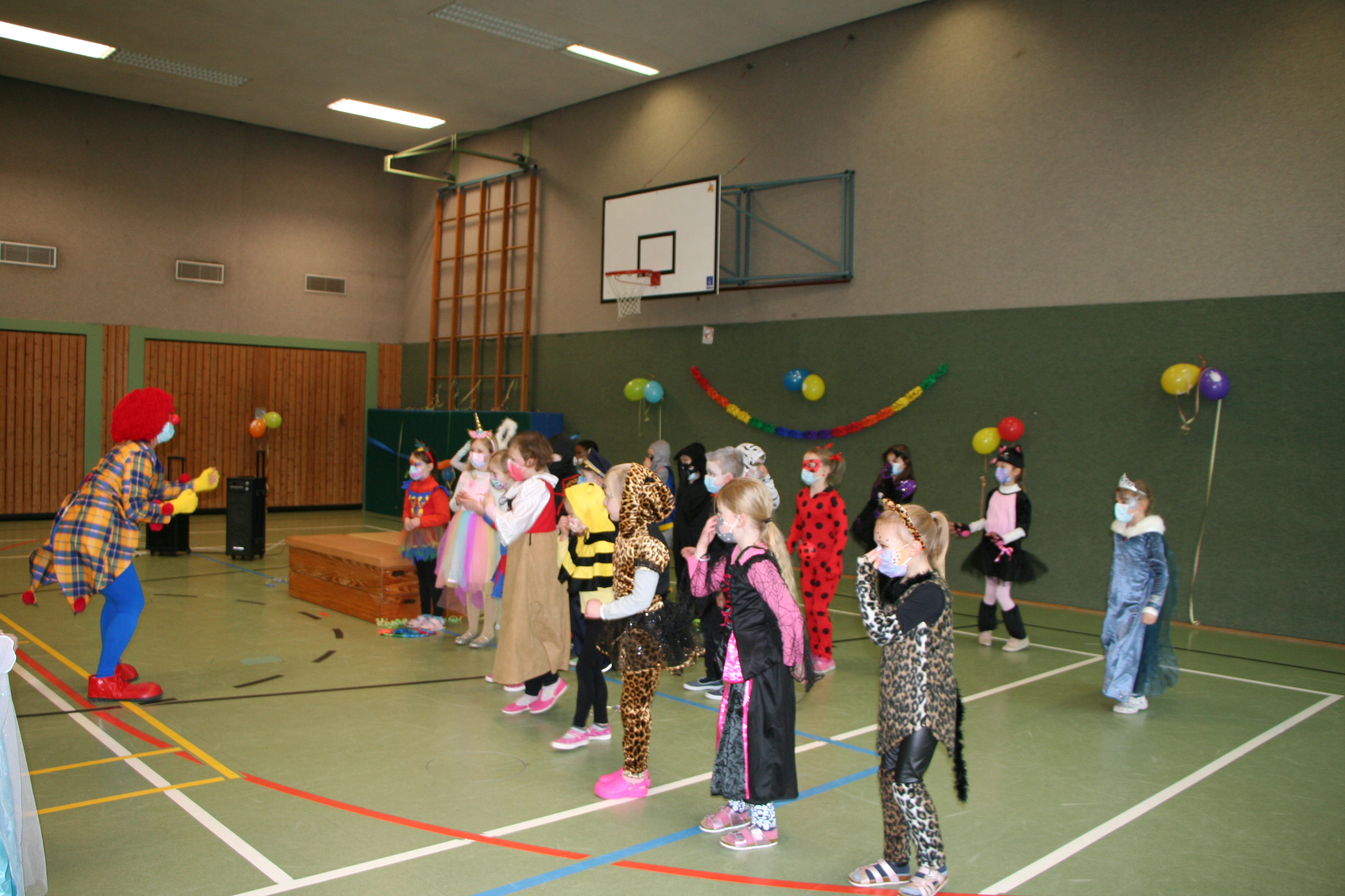 Am Freitag vor Rosenmontag feiern wir zunächst im Klassenverband, später in der Aula ein lustiges Karnevalsfest. Dazu kommen Lehrer und Kinder verkleidet in die Schule. In der Klasse werden Spiele gespielt, es wird getanzt und gemeinsam gefrühstückt. In der Aula kommen dann alle zusammen und jede Klasse trägt mit einem Beitrag zur Gestaltung des farbenfrohen Programms bei. Der große Abschluss der Feier ist dann die Polonaise durch Schule und Kindergarten.