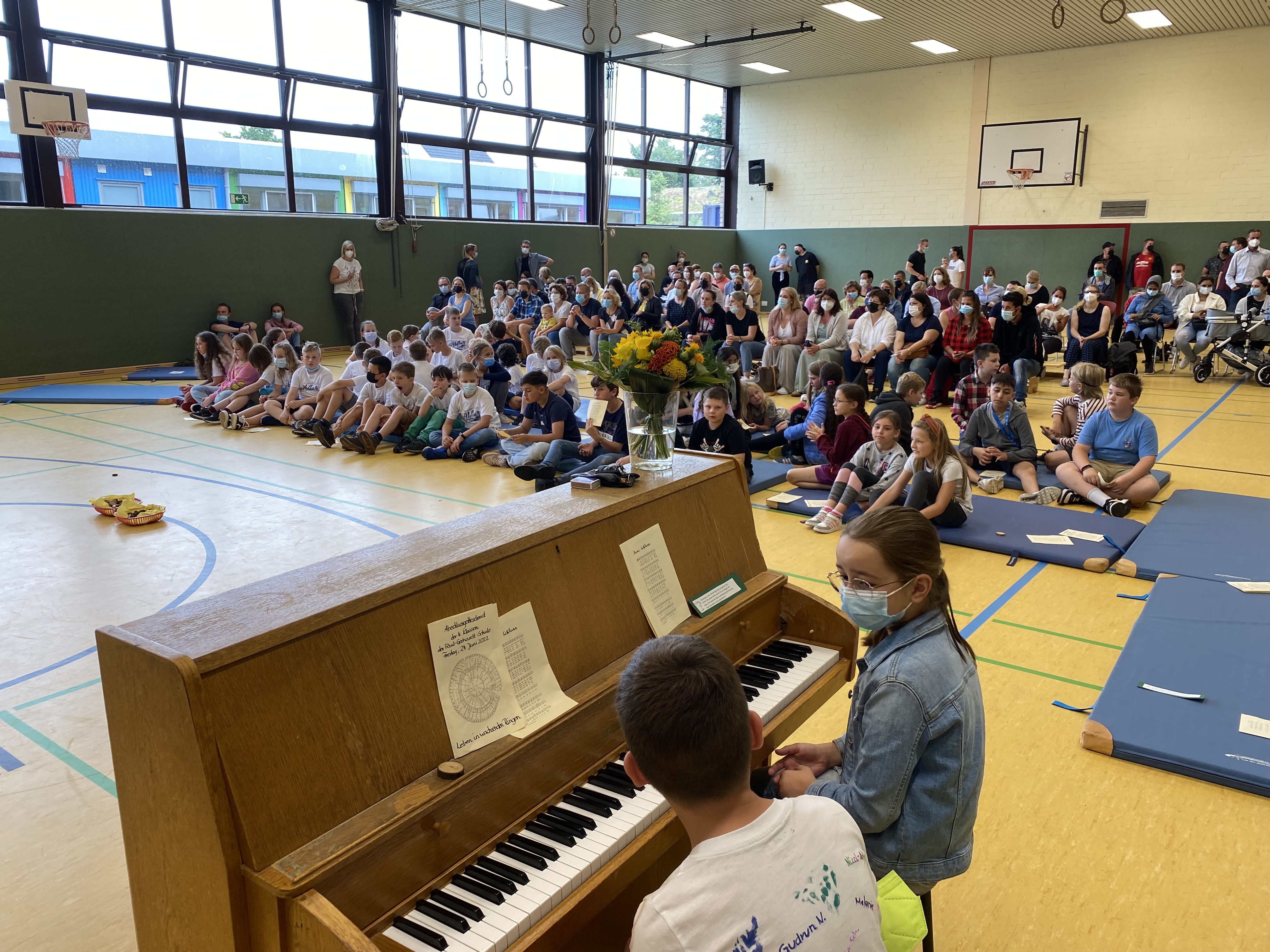 Freitag, der 24.06.22 war ein besonderer Tag für unsere Viertklässler – der letzte Schultag an unserer Schule! Im Gegensatz zu den beiden Vorjahren war in diesem Jahr immer klar, dass wir eine gemeinsame Verabschiedung werden feiern können. Da wir aufgrund des Wetters in die Turnhalle ausweichen mussten, bestand allerdings Maskenpflicht für alle. Das tat der festlichen Stimmung aber keinen Abbruch.