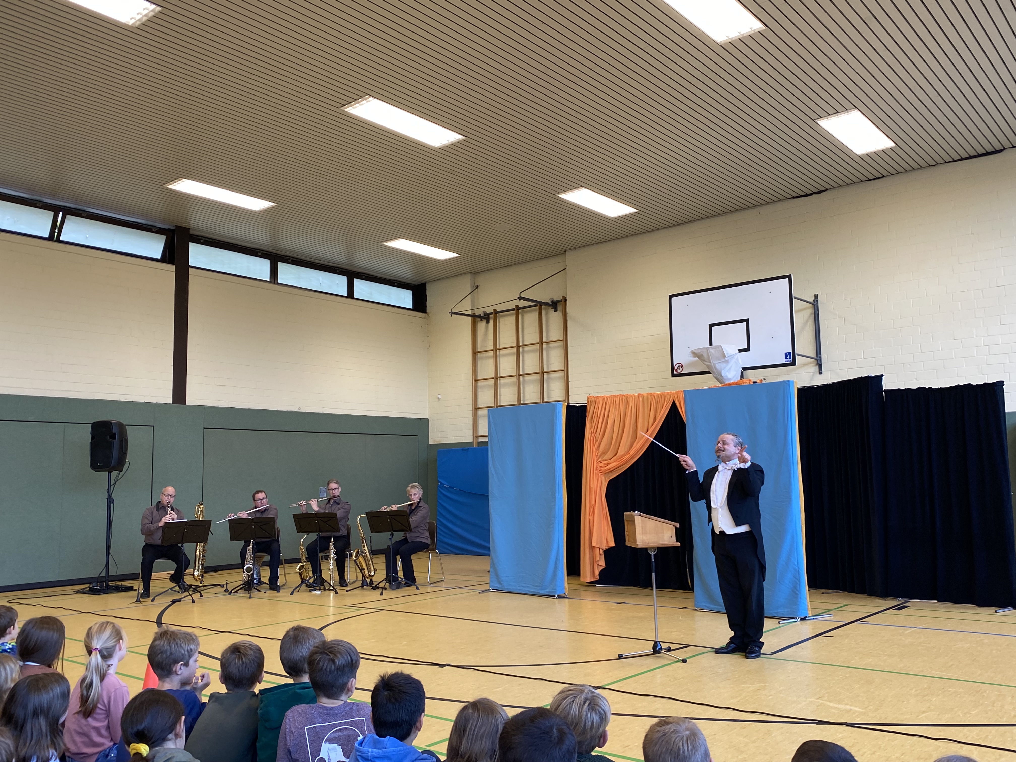 Am Freitag, 4. November 2022, gab es endlich wieder ein Klassik-für-Kids-Konzert am Grundschulverbund PGS/KvG. Mit einer tollen Geschichte - dem Stück „Alla Turca“ oder „Der Dirigent und sein Flaschengeist“ - spielten sich das glänzend aufgelegte Ensemble des Pindakaas Saxophon Quartetts sowie die Schauspieler Frank Dukowski und Marcell Kaiser in die Herzen der Kinder und LehrerInnen.
