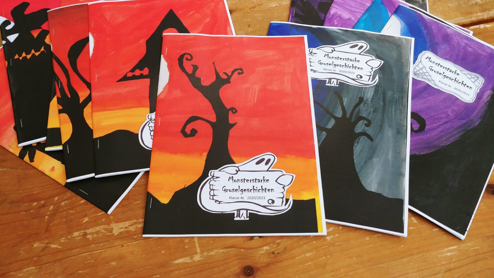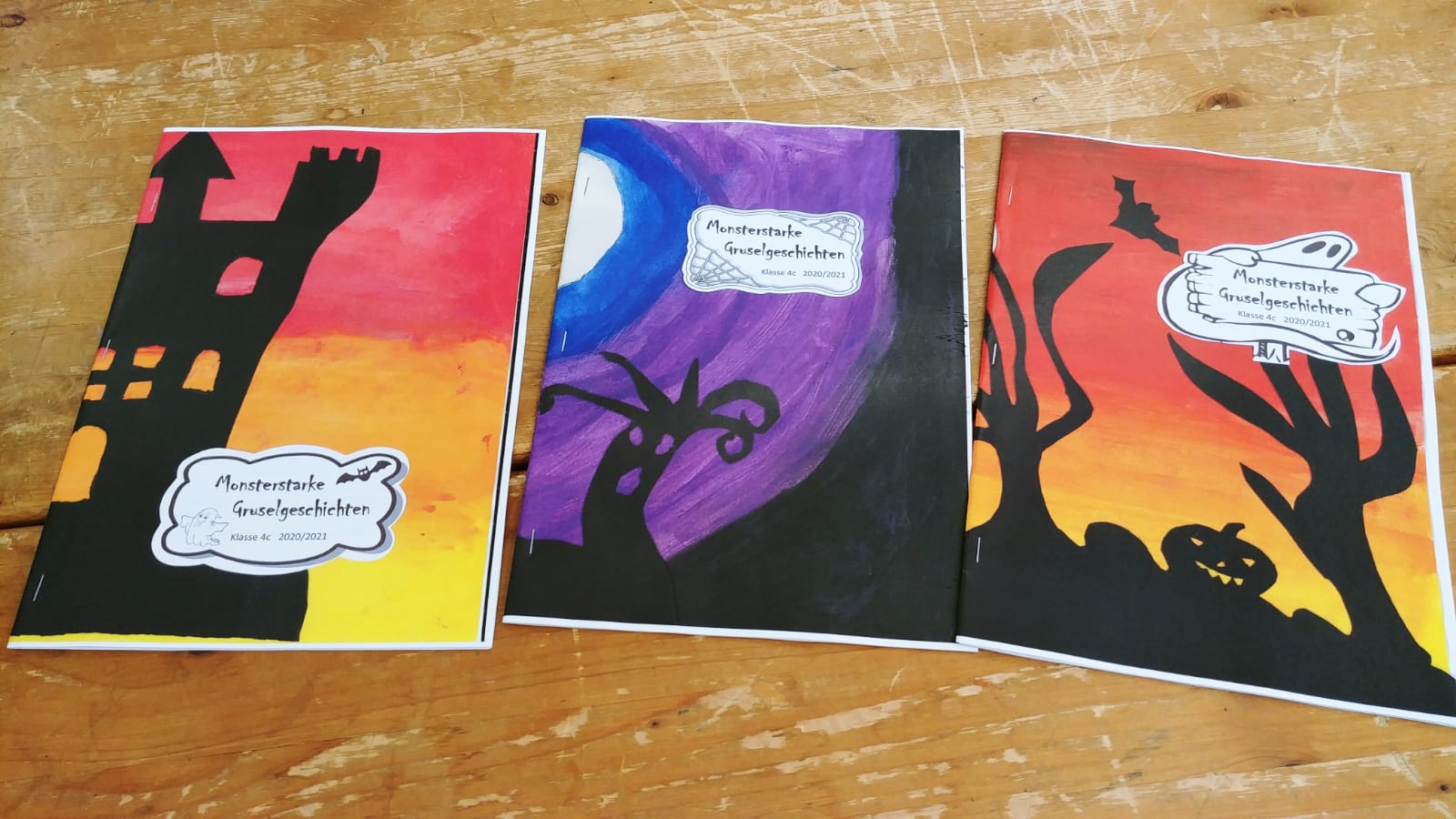 Die Kinder der Klasse 4c haben ihre besten Gruselgeschichten in einem eigenen Buch zusammengefasst. Im Deutschunterricht haben die Schülerinnen und Schüler des 4. Jahrgangs zum Thema Gruselgeschichten gearbeitet und wochenlang geübt, wie man diese Texte spannend und wortgewandt schreibt. Im Kunstunterricht haben die Kinder Collagen aus einem Wasserfarbenhintergrund mit Mond und einem Silhouettenschnitt eines Gruselortes aus schwarzem Tonkarton gestaltet. Darüber hinaus haben sie Entwürfe für den Titel des späteren Buches und das Titelbild gemacht. Diese hat Frau Schwarz am Computer umgesetzt. Am Kopierer entstand so für jedes Kind ein individueller Buchumschlag aus dem jeweils eigenen Kunstbild sowie einem gewählten Titelbilchen. Zusammen mit den 26 selbst überarbeiteten und abgetippten Geschichten der Kinder sind eindrucksvolle Gruselbücher entstanden!!!