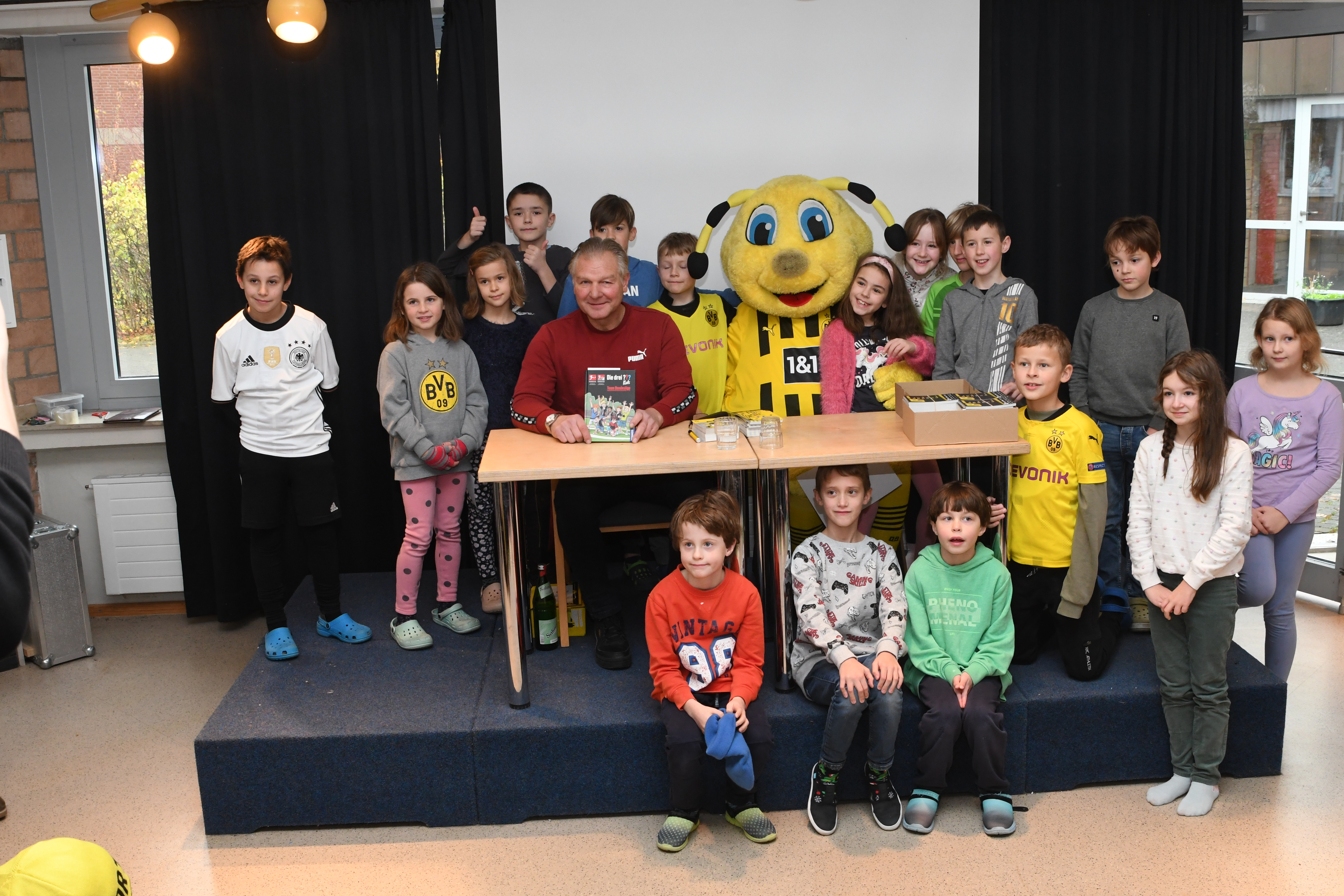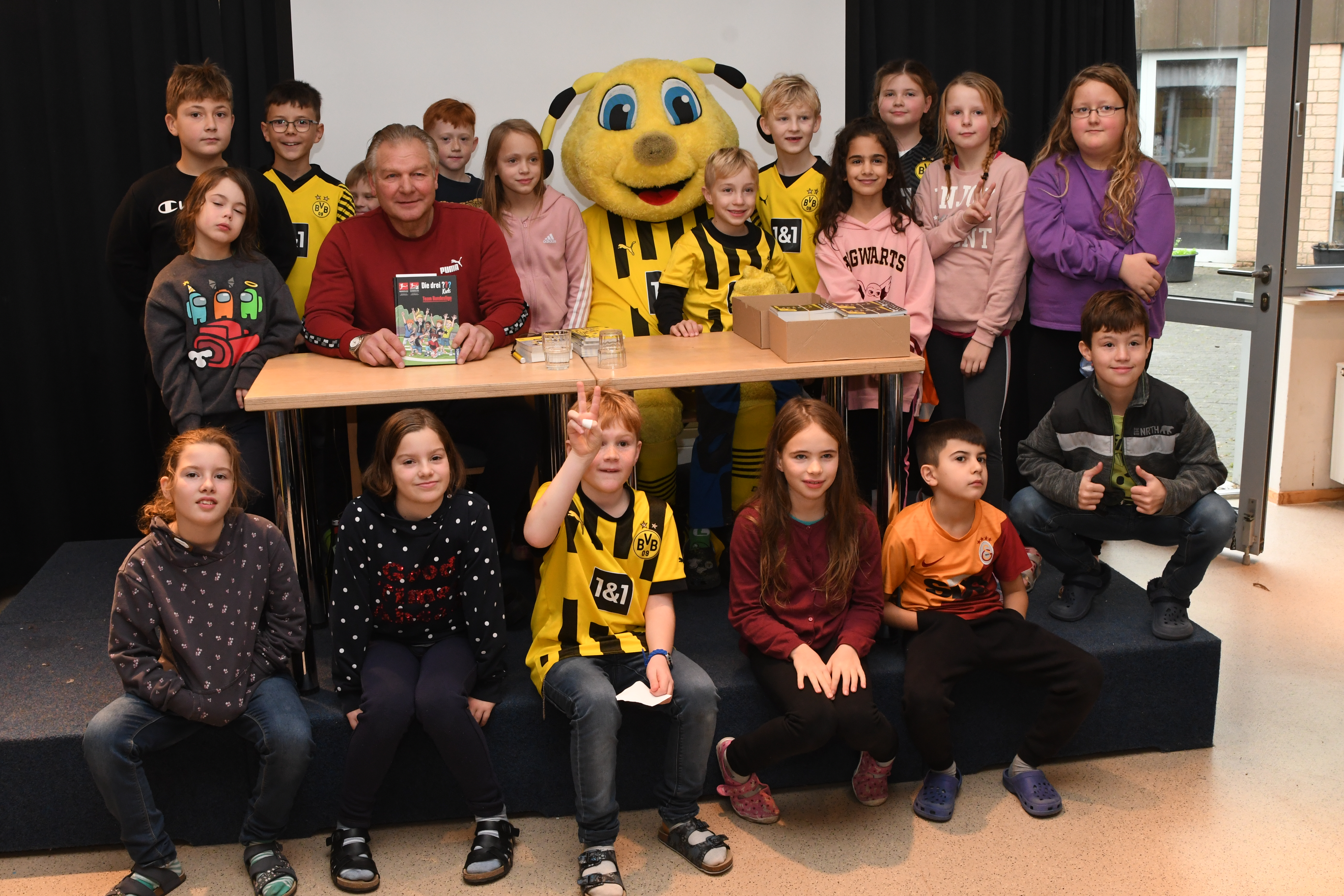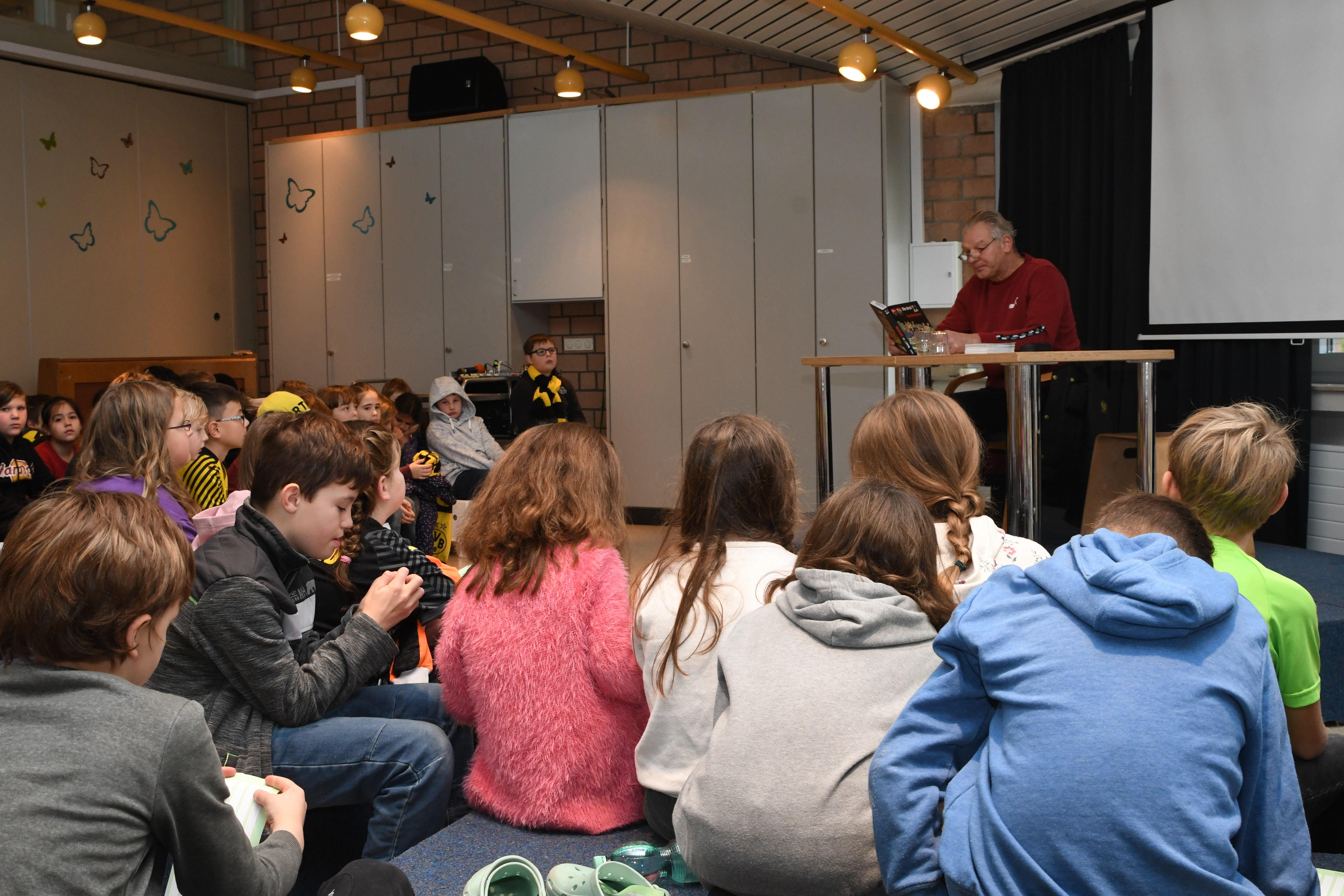 Am deutschlandweiten Vorlesetag begrüßte die PGS in den Klassen 4 die ehemaligen Schulleiterin Birgit Lorson und in den Klassen 3 den ehemaligen BVB Profi Teddy de Beer zum Vorlesen. Gebannt hörten die Kinder der Klassen 3 dem ehemaligen Torwart zu als er Geschichten aus dem Buch "Die drei Fragezeichen: Team Bundesliga" vorlas. Darunter auch die lustige Anekdote von seinem Mitspieler Dede, der beim BVB damals seinen ersten Winter erlebte. "Trainer, ich kann nicht zum Training kommen. Die Windschutzscheibe ist kaputt." Der Fahrdient des Klubs kam und erkannte schnell, dass die Scheibe nicht kaputt, sondern zugefroren war. Eis und Schnee kannte Dede aus Braslien nicht. Nach der Vorlesestunde, gab es noch Mannschaftsfotos und AUtogramme für alle von dem sehr symphatischen Profi. Birgit Lorson las aus dem Buch "Lukas Undercover - Wie man alles verbockt und doch gewinnt". Auch hier hörten die Kinder begeistert zu, stellten aber auch immer wieder viele Fragen, die Frau Lorson, ganz Lehrerprofi, geduldig beantworte.