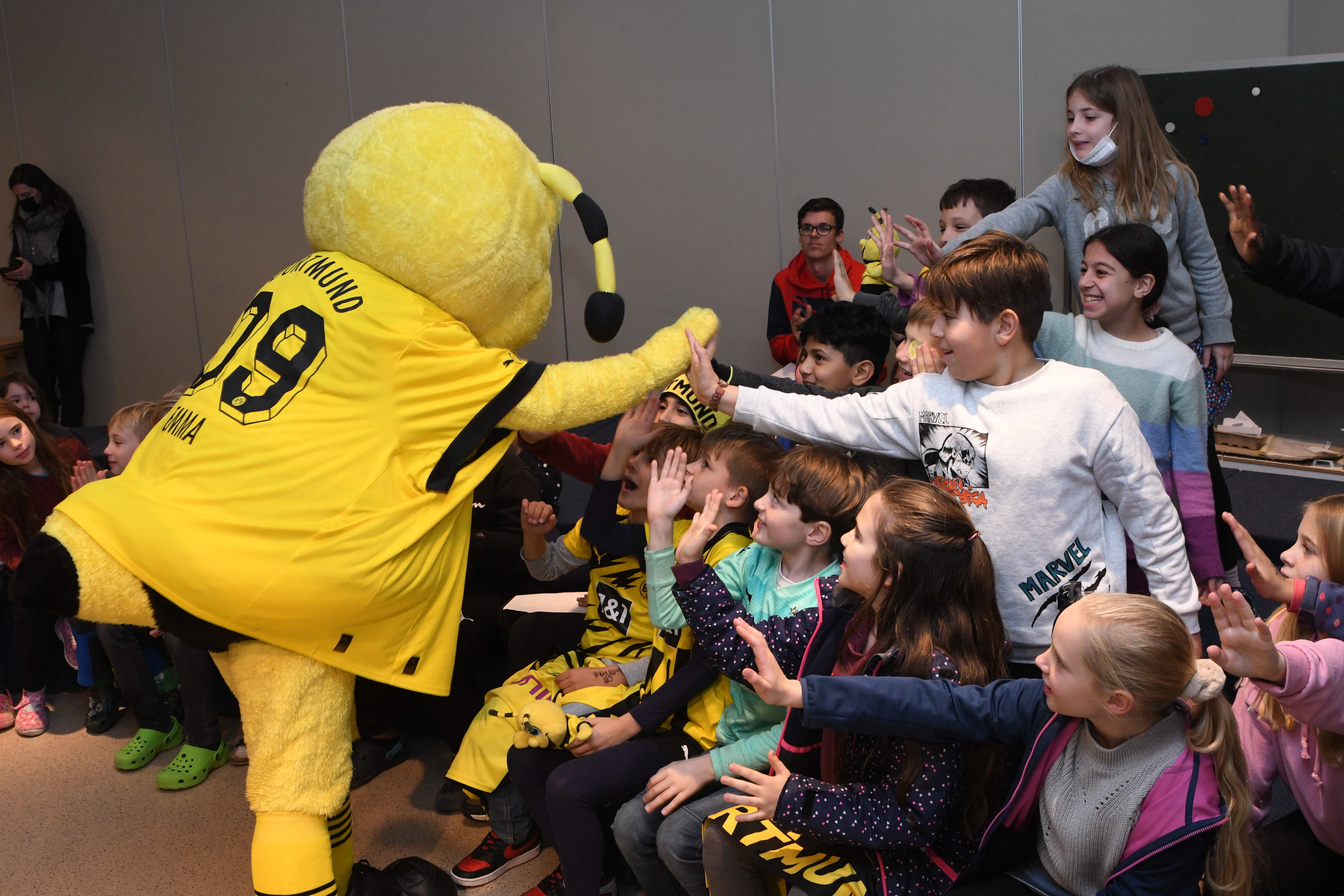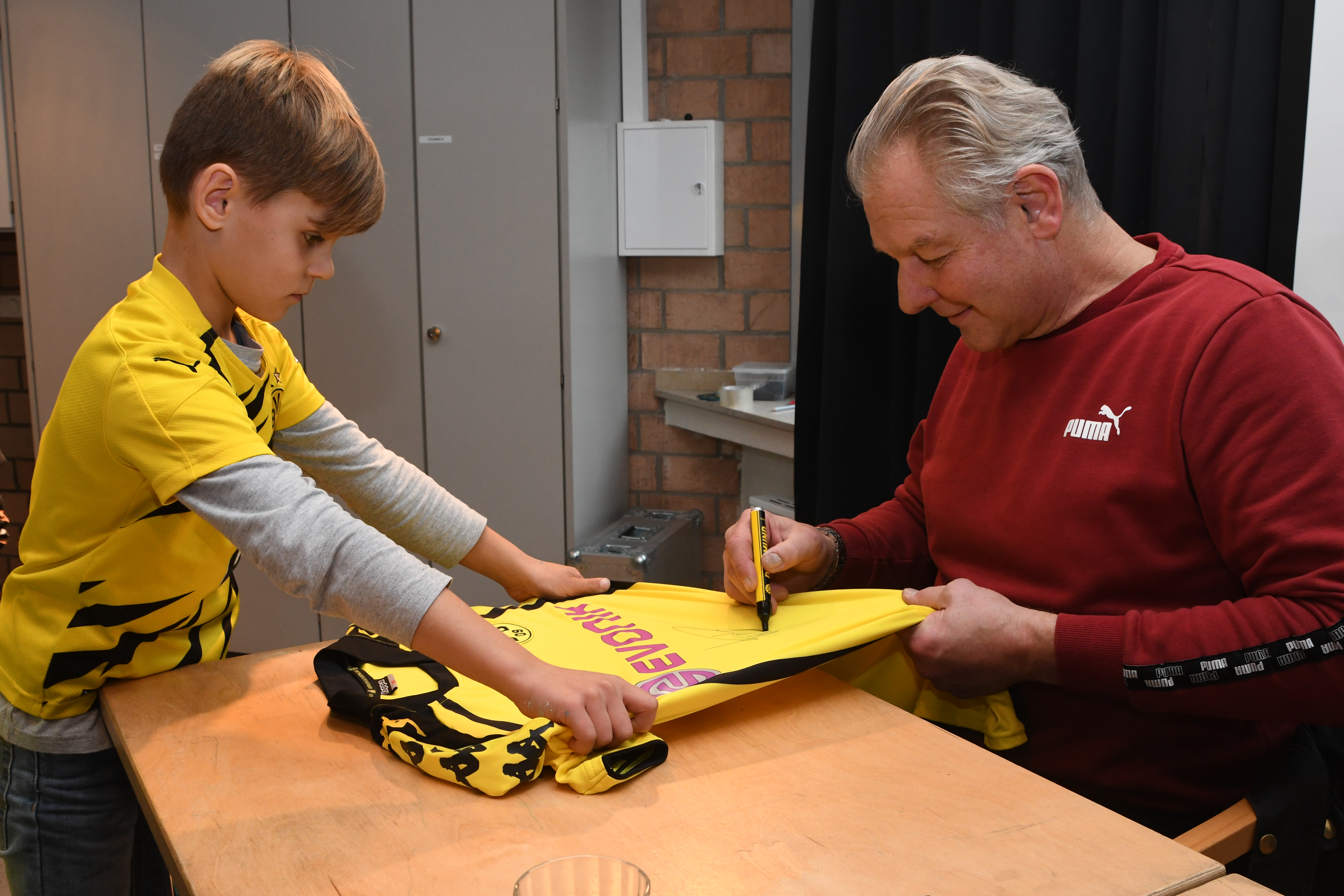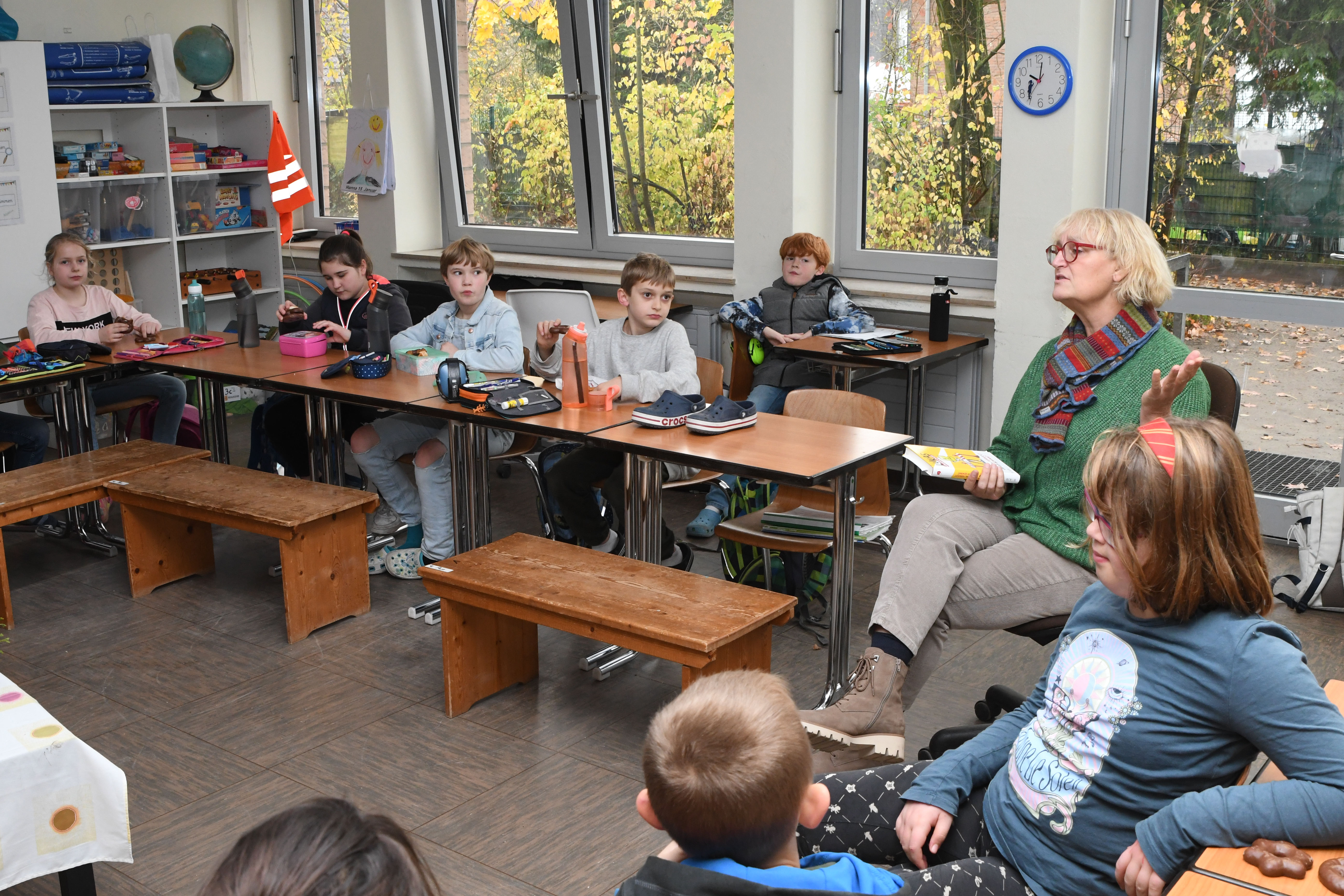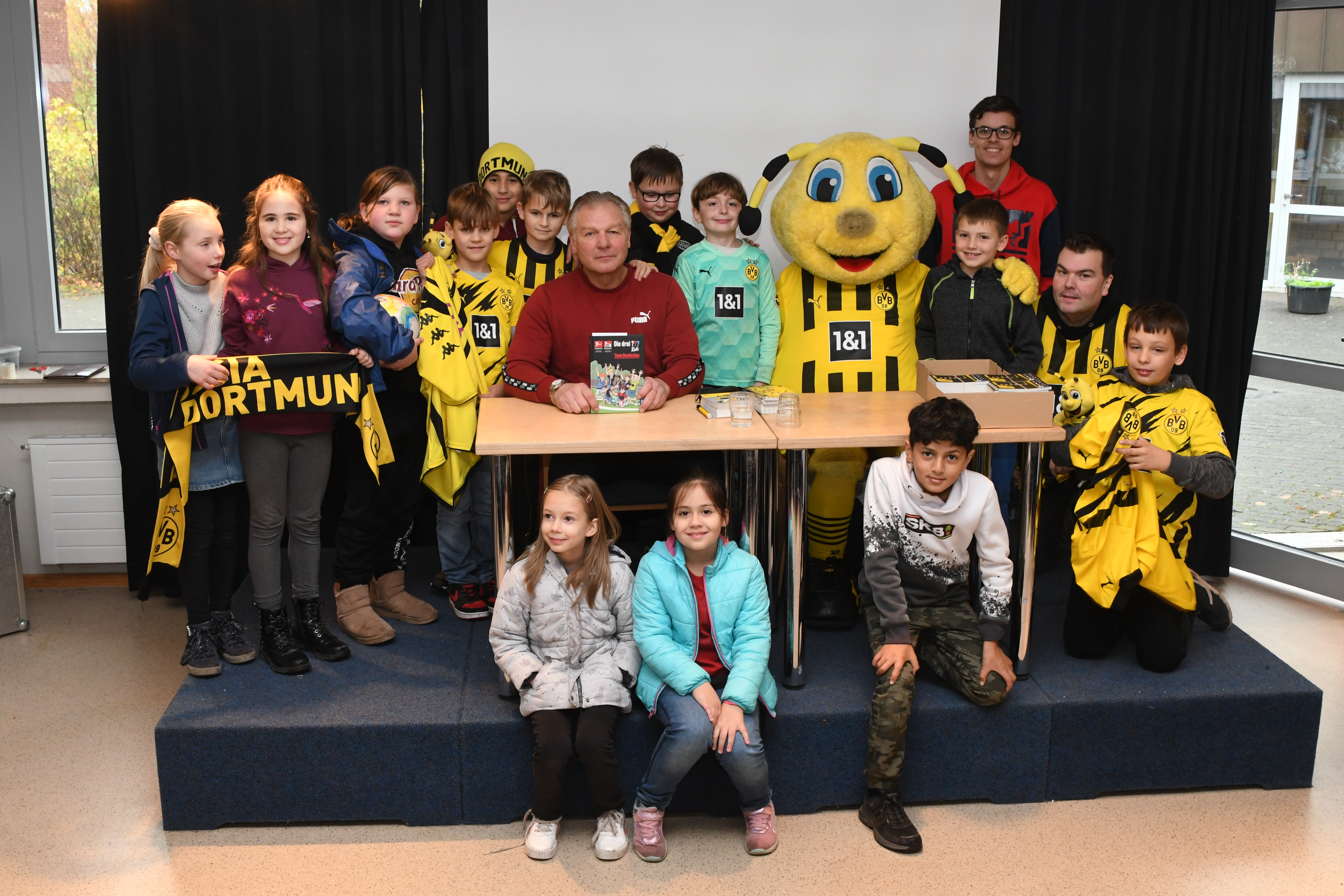 Am deutschlandweiten Vorlesetag begrüßte die PGS in den Klassen 4 die ehemaligen Schulleiterin Birgit Lorson und in den Klassen 3 den ehemaligen BVB Profi Teddy de Beer zum Vorlesen. Gebannt hörten die Kinder der Klassen 3 dem ehemaligen Torwart zu als er Geschichten aus dem Buch "Die drei Fragezeichen: Team Bundesliga" vorlas. Darunter auch die lustige Anekdote von seinem Mitspieler Dede, der beim BVB damals seinen ersten Winter erlebte. "Trainer, ich kann nicht zum Training kommen. Die Windschutzscheibe ist kaputt." Der Fahrdient des Klubs kam und erkannte schnell, dass die Scheibe nicht kaputt, sondern zugefroren war. Eis und Schnee kannte Dede aus Braslien nicht. Nach der Vorlesestunde, gab es noch Mannschaftsfotos und AUtogramme für alle von dem sehr symphatischen Profi. Birgit Lorson las aus dem Buch "Lukas Undercover - Wie man alles verbockt und doch gewinnt". Auch hier hörten die Kinder begeistert zu, stellten aber auch immer wieder viele Fragen, die Frau Lorson, ganz Lehrerprofi, geduldig beantworte.