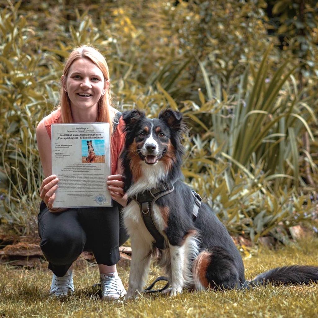 Hallo, ich bin Emma, eine fünfjährige Australian Shepherd Hündin, die 2021 ihre Ausbildung zum Schulhund absolviert hat und seitdem Kinder in der Schule begleitet. Ich sorge für eine ruhige Atmosphäre im Klassenzimmer, Motivation beim Lernen, Kuschelpausen und Spaß am Umgang mit Hunden.