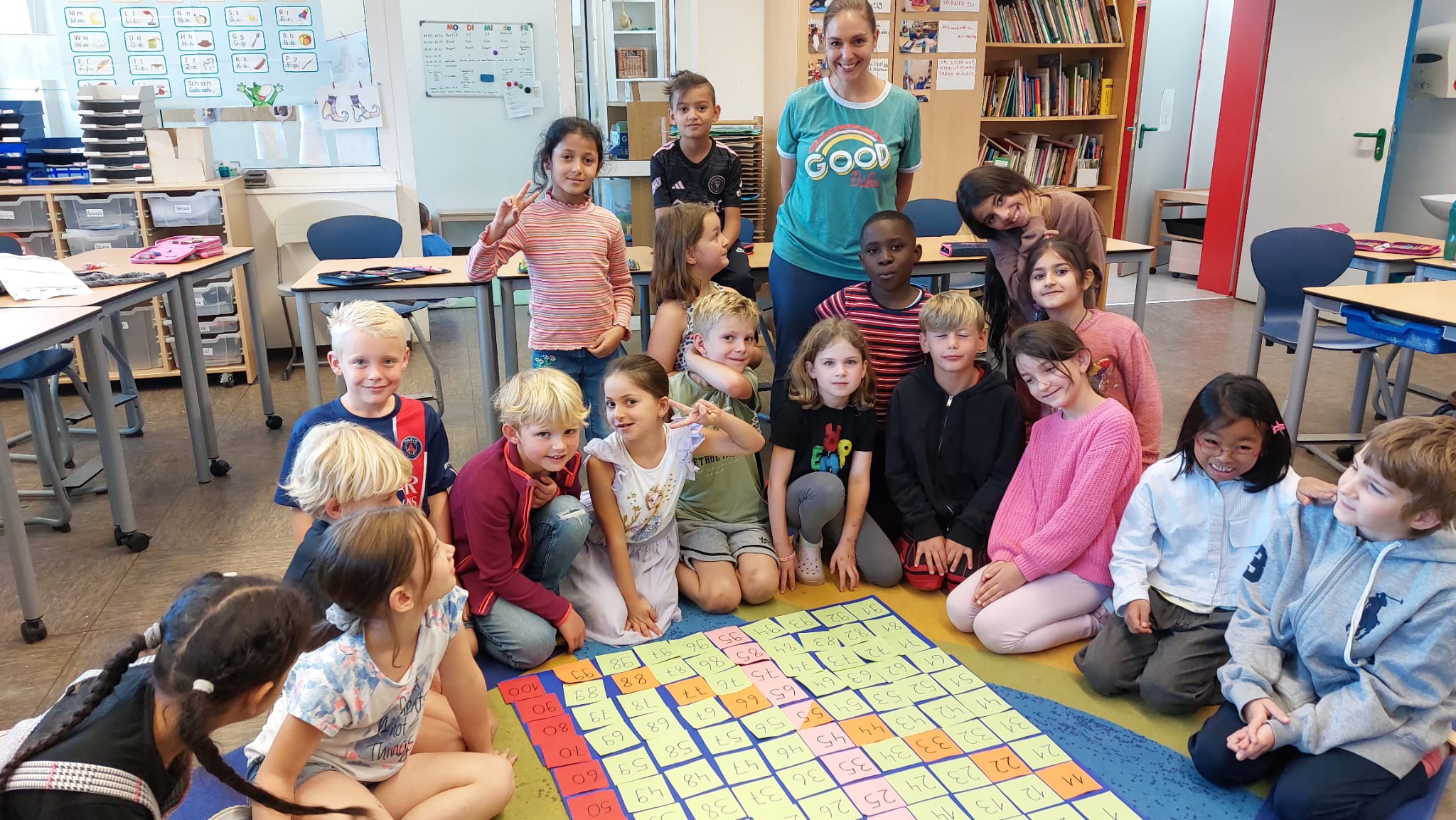 Die Klasse 2a rechnete schon fleißig bis 20. Nun können die Mädchen und Jungen aber auch schon bis 100 zählen und auch schon Vorgänger und Nachfolger benennen. Die ersten kleinen Rechenaufgaben mit Zehnerzahlen macht die Kinder sehr stolz und sie rechnen endlich mit richtig großen Zahlen. Heute haben die Schülerinnen und Schüler das Hunderterfeld entdeckt und erste Beziehungen zwischen den Zahlen kennengelernt. Außerdem konnten die Kinder einzelne Zahlen in das Hunderterfeld kleben. Die Kinder haben trotz der 100 kleinen Zettel super gut mitgearbeitet und die Mathelehrerin Frau Trouet ist super stolz auf die Kinder der 2a.