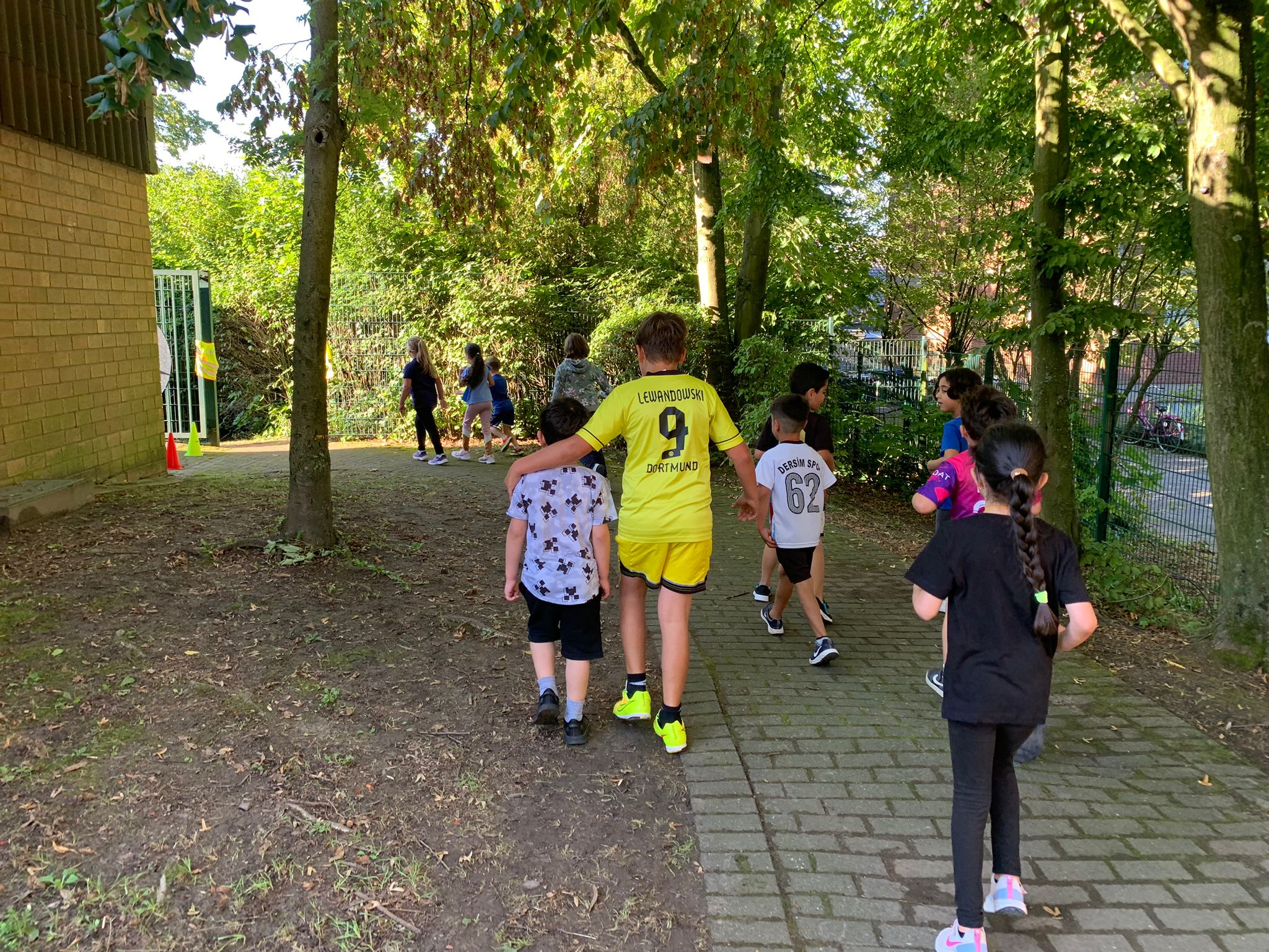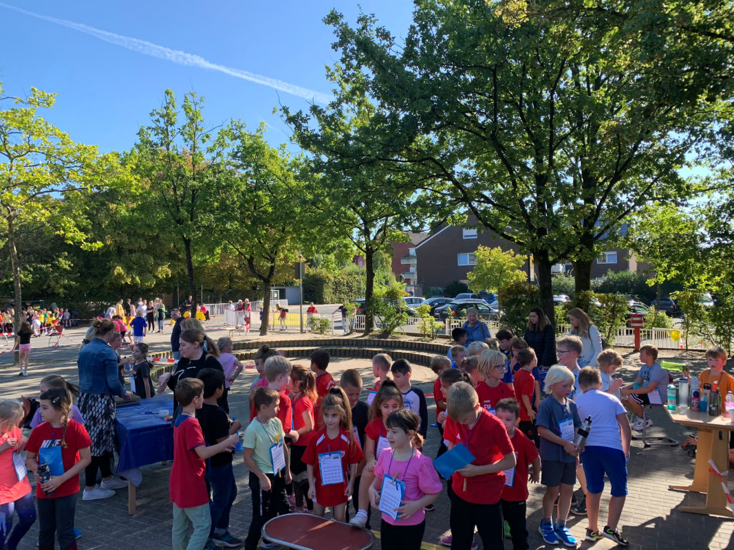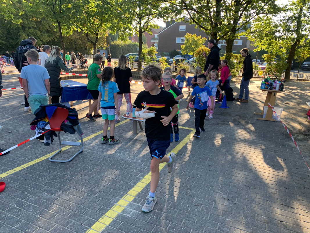 Die Stimmung und die gegenseitige Unterstützung der Mädchen und Jungen waren großartig. Auch viele Eltern und weitere Unterstützer standen an der Strecke und feuerten die Kinder an. Wenn einer/ einem Erstklässler/in die Luft ausging, kam direkt sein großer Pate / seine große Patin aus dem 4. Schuljahr zur Hilfe und unterstütze durch aufmunternde Zurufe oder ging selbst sogar noch einmal mit auf die Laufstrecke. Mit einem (großen) Begleiter/in an der Hand läuft es sich einfach besser. Diese Erfahrung der gegenseitigen Fürsorge ist neben dem großen Spaß und dem Stolz über die gesammelten Spendengelder wohl die schönste Erfahrung diesen Tages.
