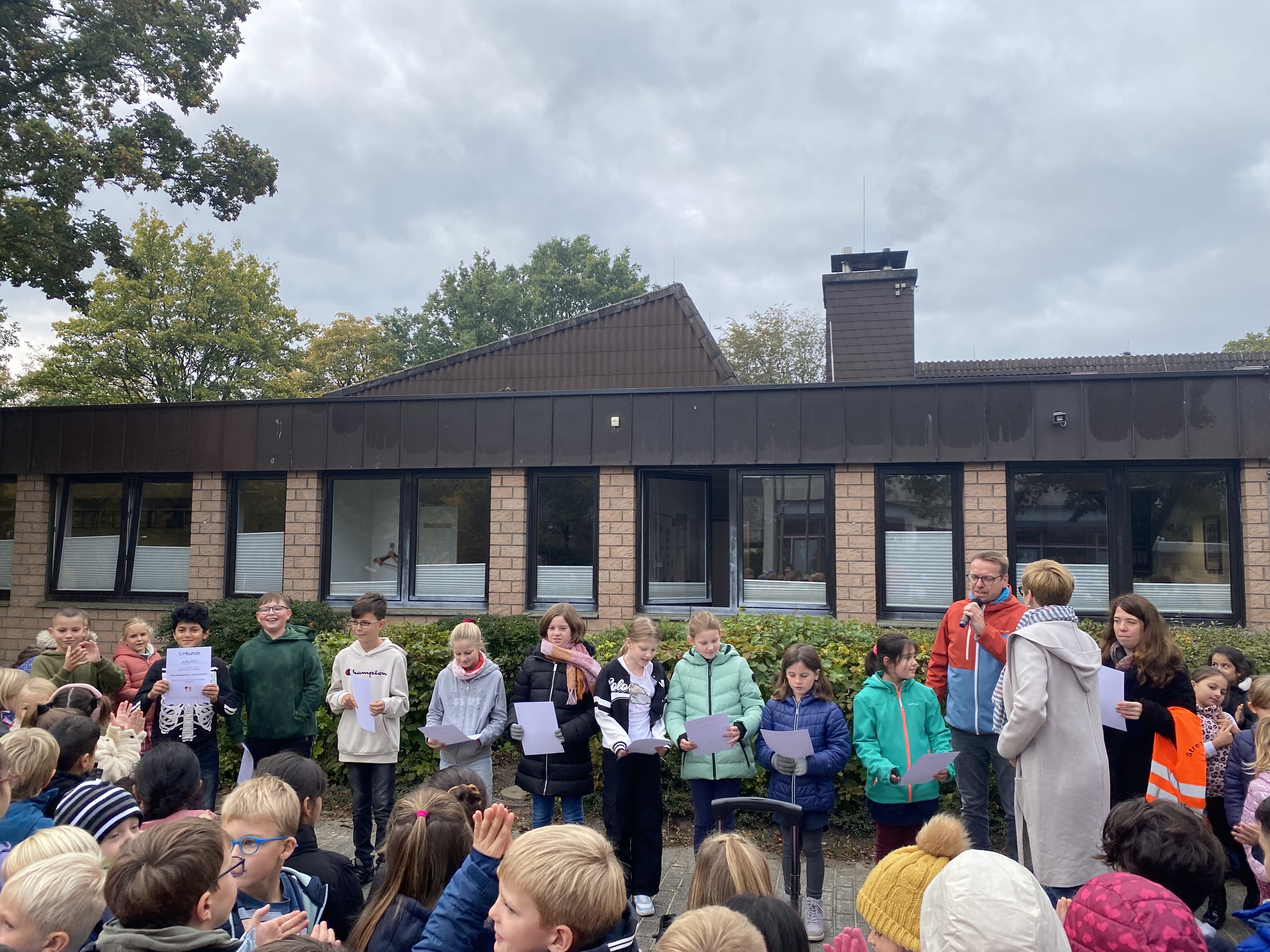 Deswegen gab es nun die wohlverdienten Urkunden von der Schulleiterin Frau Sawicki überreicht. Im Beisein aller Schülerinnen und Schüler gab es lobende Worte und einen großen Applaus!