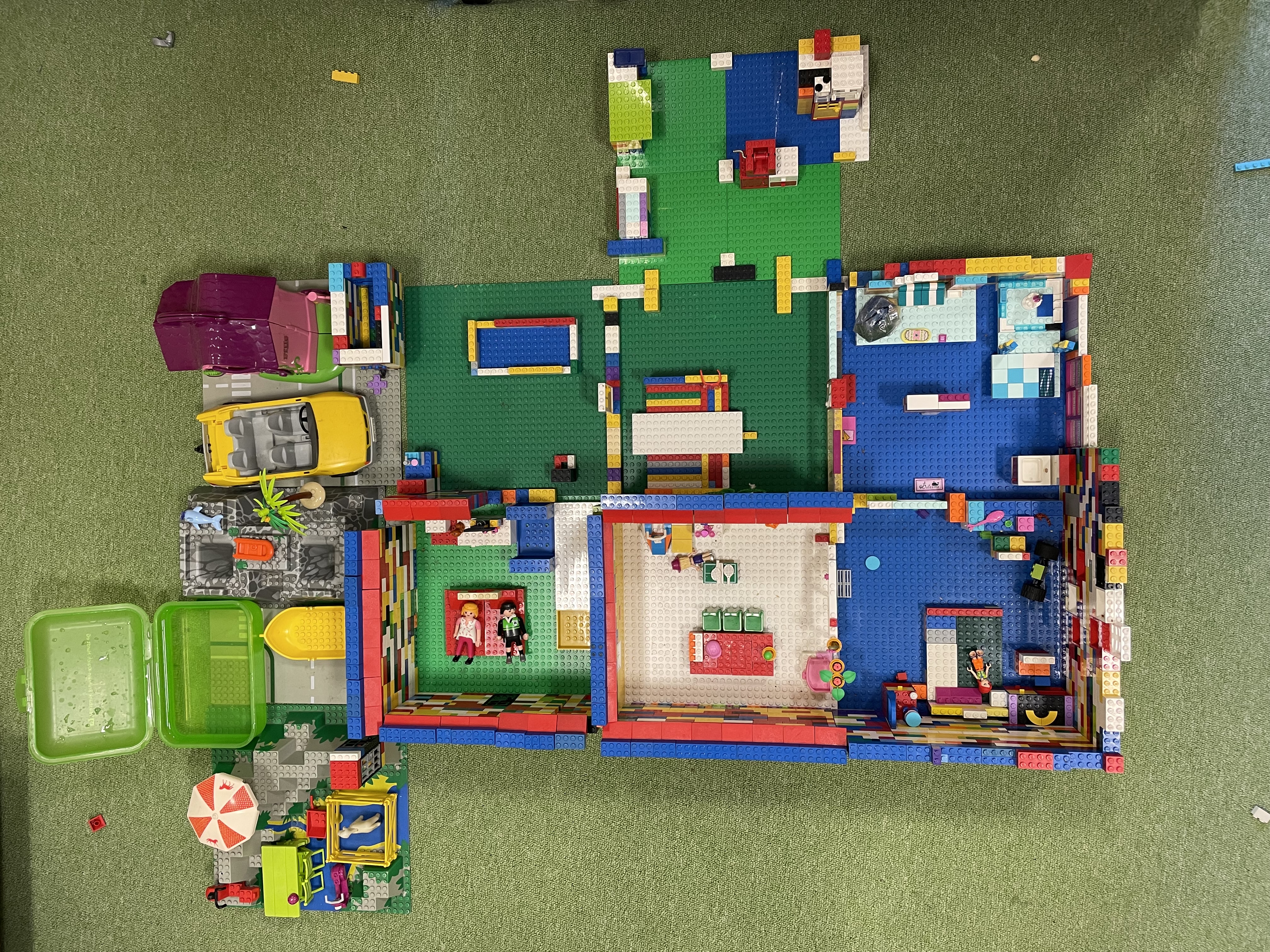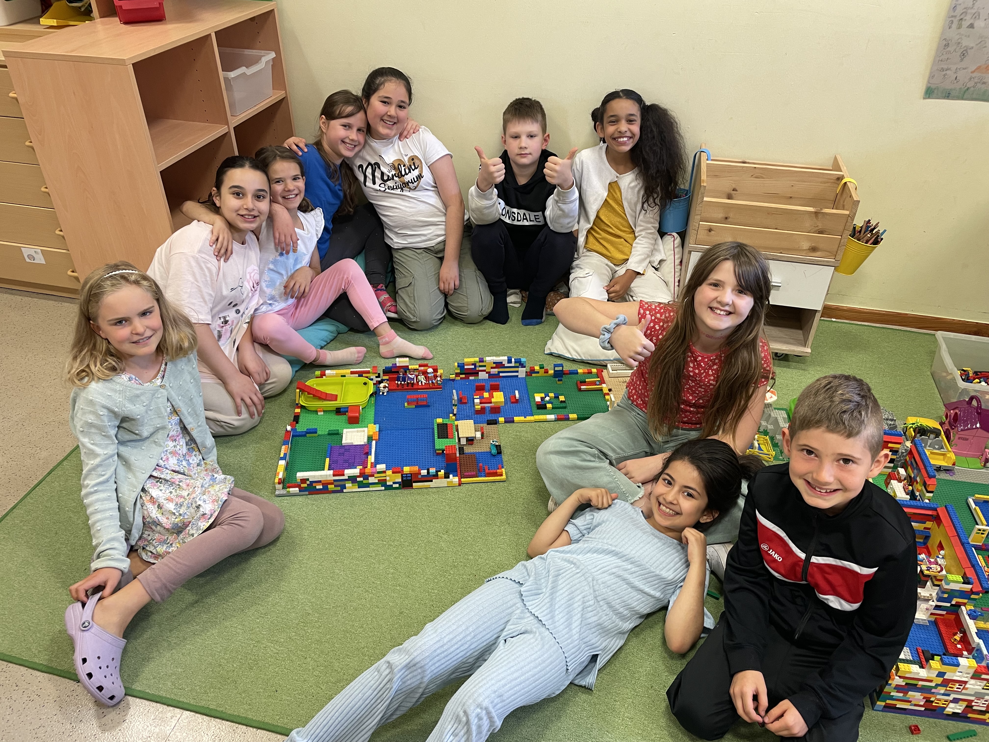 Seit mehreren Wochen bauen Kinder der Klasse 3a im Ganztag begeistert an ihren selbst ausgedachten Legohäusern. Mit großem Ideenreichtum und Kreativität ist dabei eine tolle Wohnlandschaft mit verschiedenen Räumen wie verschiedene Schlafzimmer, Kinderzimmer oder einem Spielzimmer mit Tischtennisplatte entstanden. Auch die Außenanlage wurde dabei nicht vergessen und so befinden sich vor den Häusern Gärten mit Pool und Parkplätze für Autos oder Motorräder.