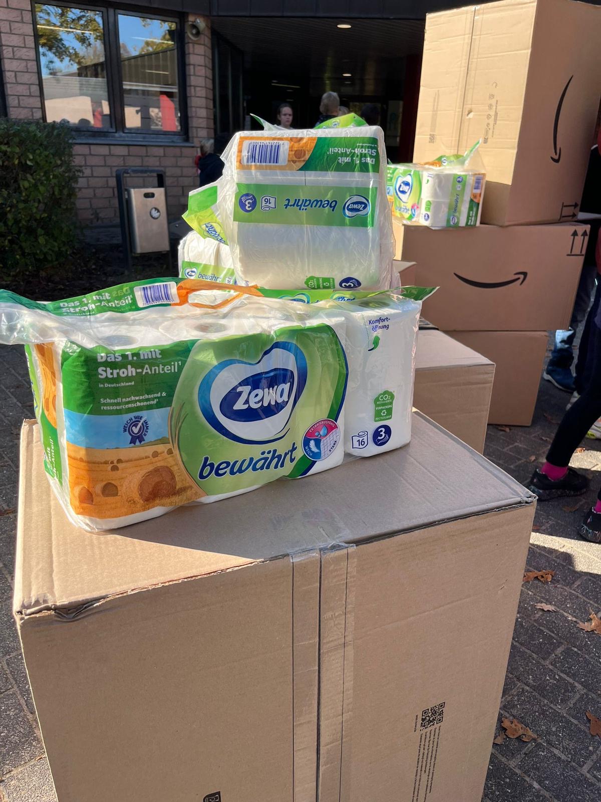 Dieser Brief hatte durchschlagenen Erfolg! Die Schüler der 4d hatten einen Brief an Bürgermeister Carsten Hövekamp geschrieben und sich über zu dünnes WC-Papier beschwert. Der besuchte unsere Schule und sagte zu, dass die Schüler bei der nächsten Ausschreibung in dieser Sache mitentscheiden dürften. Neues Toilettenpapier hatte er jedoch noch nicht im Gepäck. Das Radio Kiepenkerl Morgenteam berichtete über die Angelegenheit und sagte direkt hochwertiges Klopapier für die PGS zu. Nun wurden 1000 Rollen Toilettenpapier zur großen Freude der Kinder geliefert.