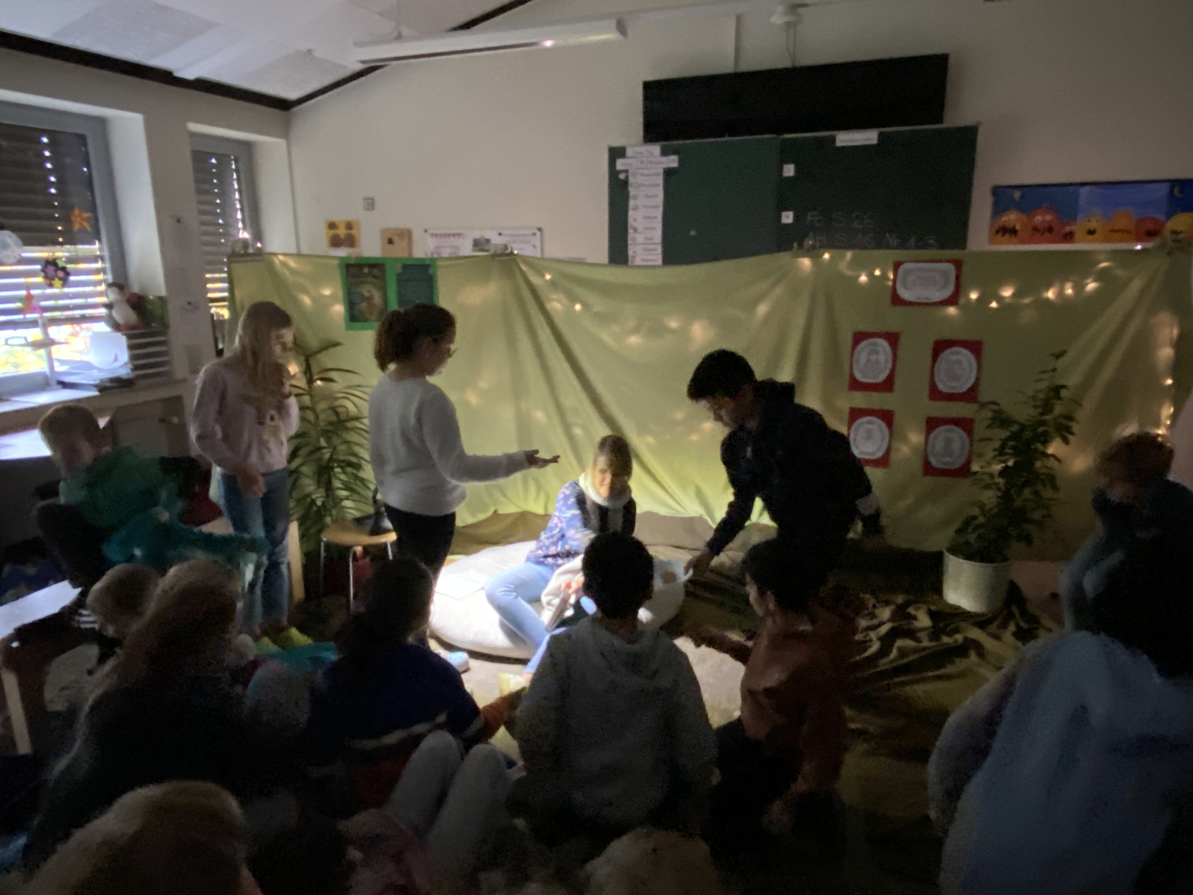 Am 15. November war es dann soweit: auf dem Schulhof wurde sich in vielen kleinen Gruppen versammelt und von dort ging es dann in die einzelnen Leseräume, von denen einige auch gar nicht mehr wie ein Klassenzimmer wirkten, sondern eher wie ein Zauberwald oder eine Einhornhöhle. Die Kinder hörten gut zu und folgten gespannt der Handlung aus Büchern wie „Vorsicht bissig“, „Zippel“, den „Gespensterjägern“, den „Kindern vom Möwenweg“ oder „Lehrer Franz“.