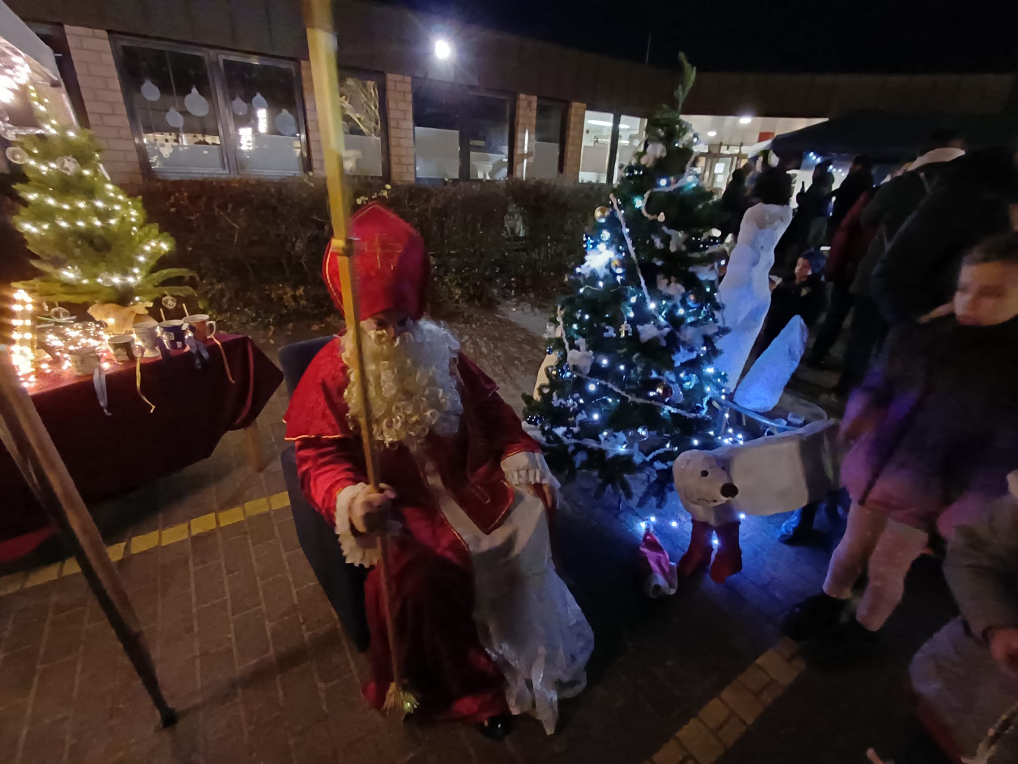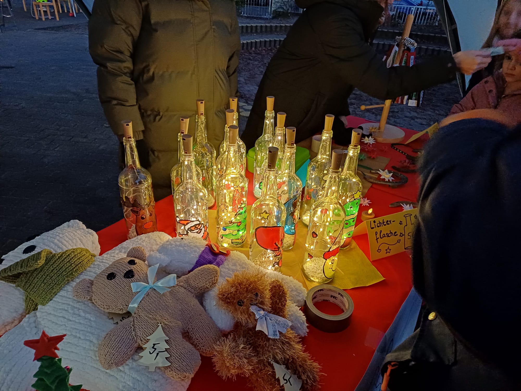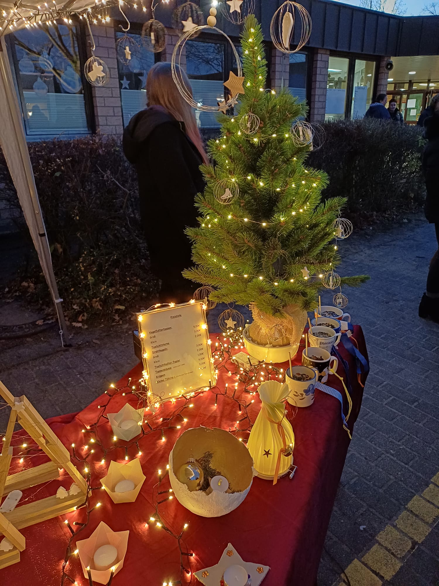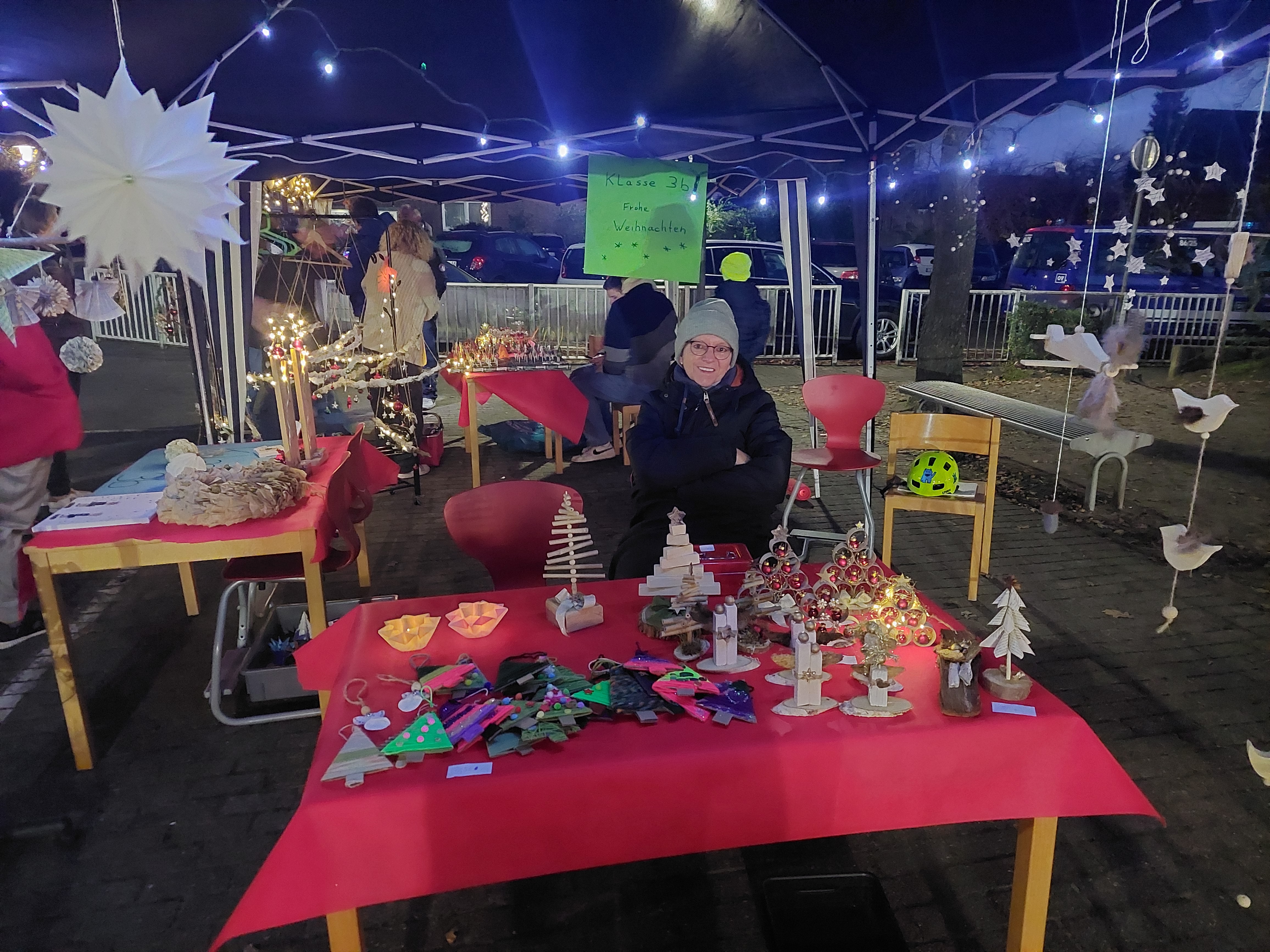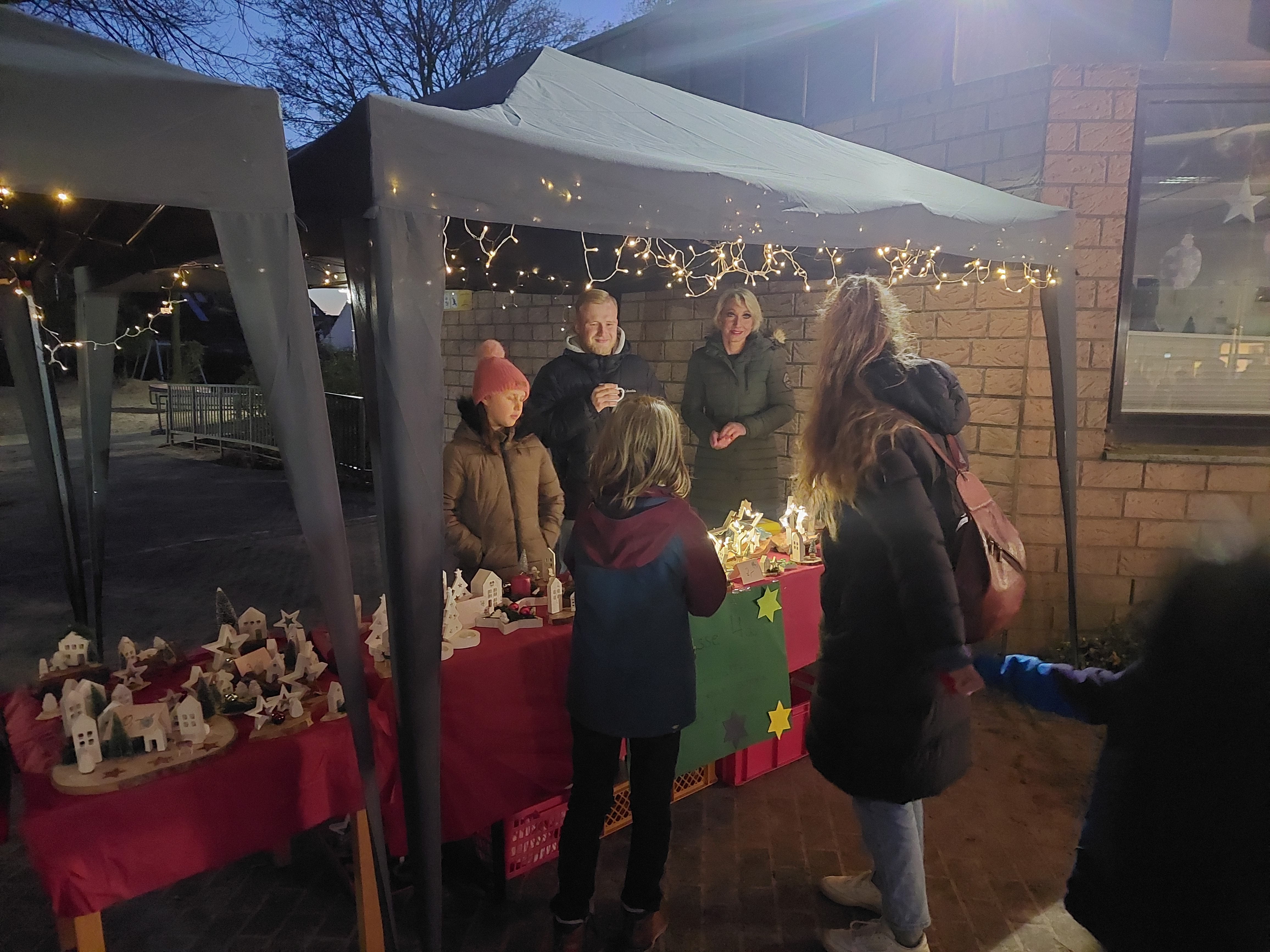 Erstmalig wurden alle Verkaufsstände unter beleuchteten Pavillons auf dem Schulhof aufgebaut. „Wir wollten ein kleines Weihnachtsdorf schaffen. Jede Gruppe schmückte ganz individuell den eigenen Pavillion“, fügte Claudia Püttmann hinzu. Unterstützung gab es auch von der Jugendabteilung des THW, die alle Bäume mit Strahlern leuchten ließen.