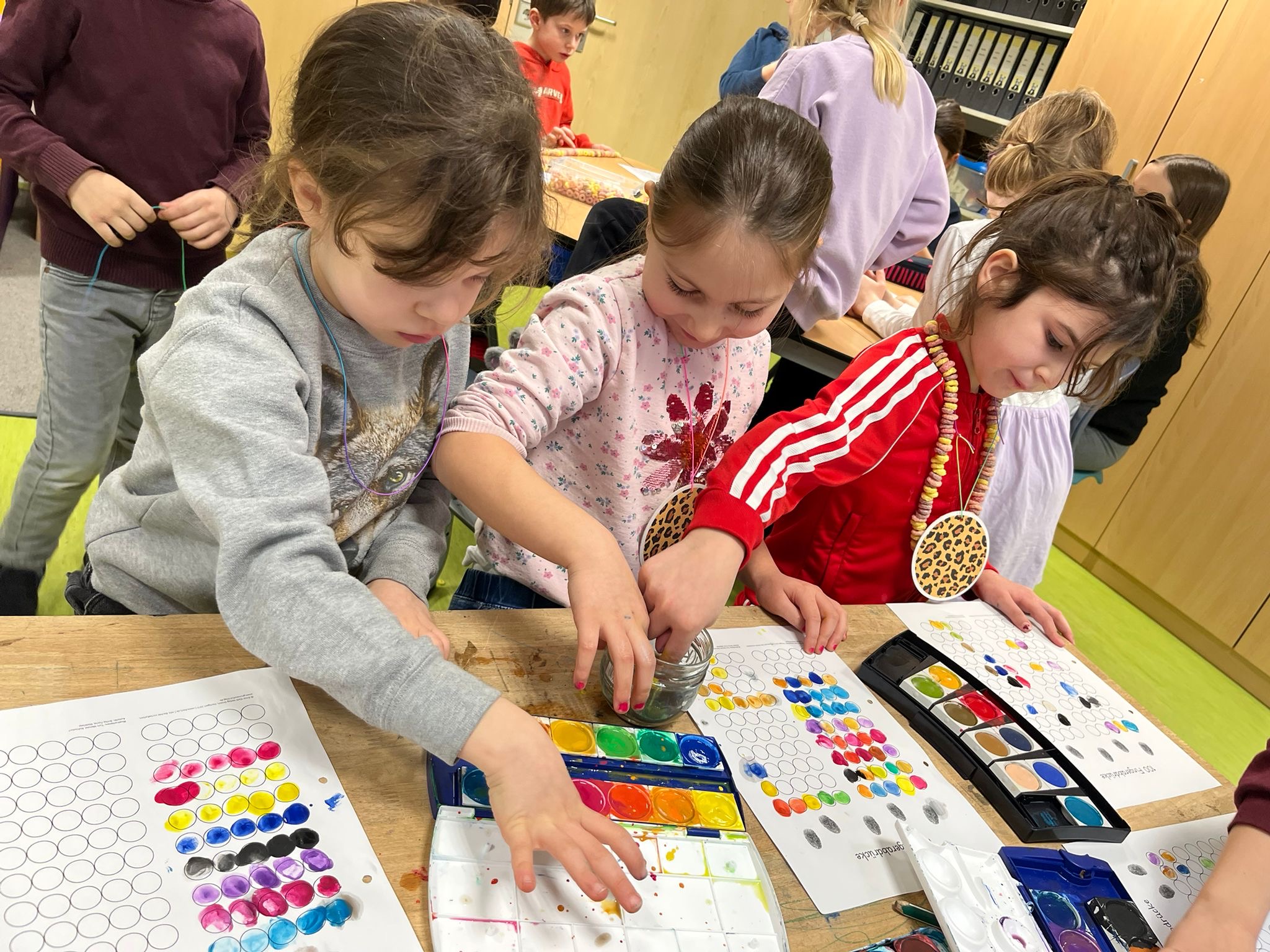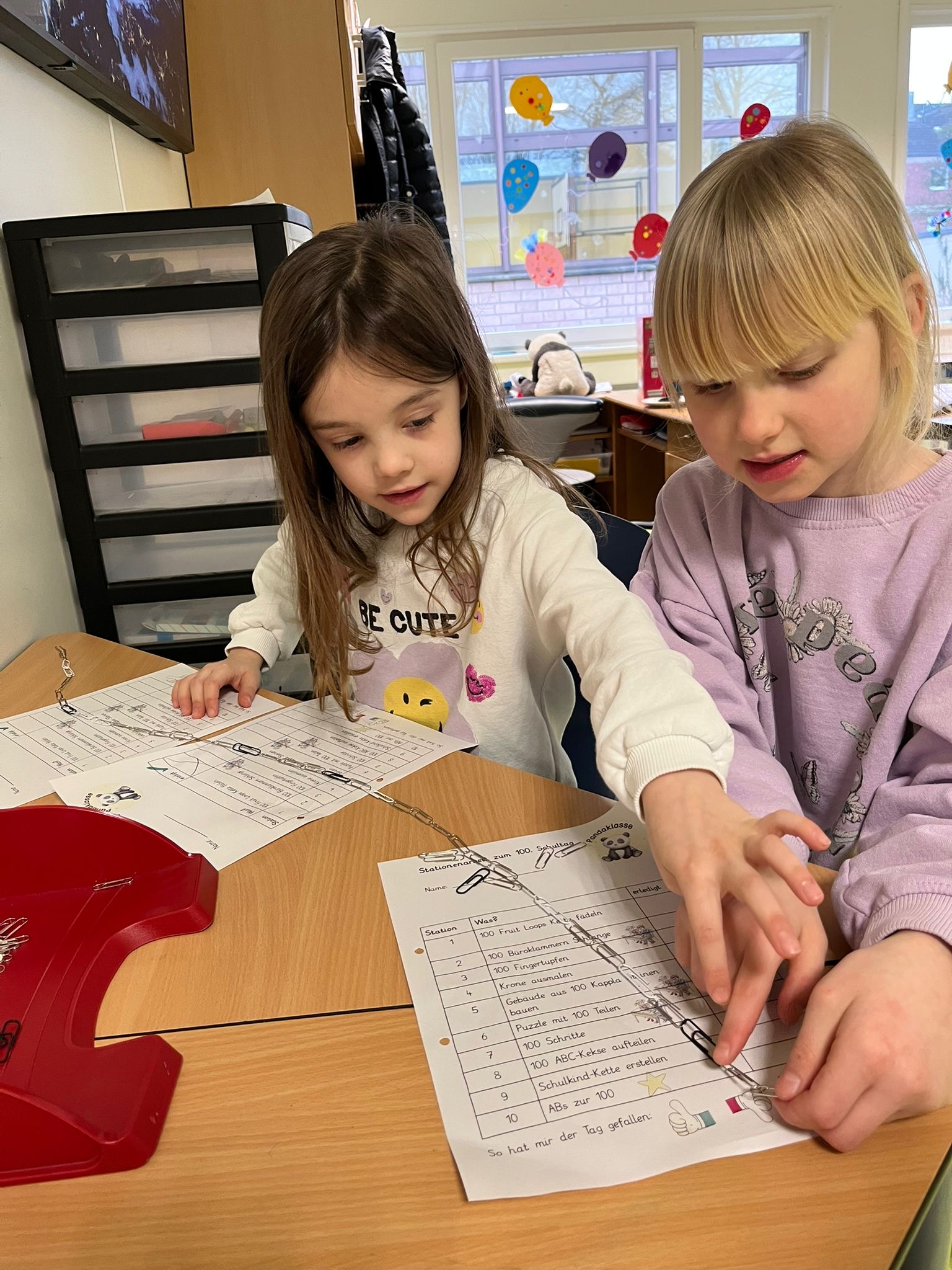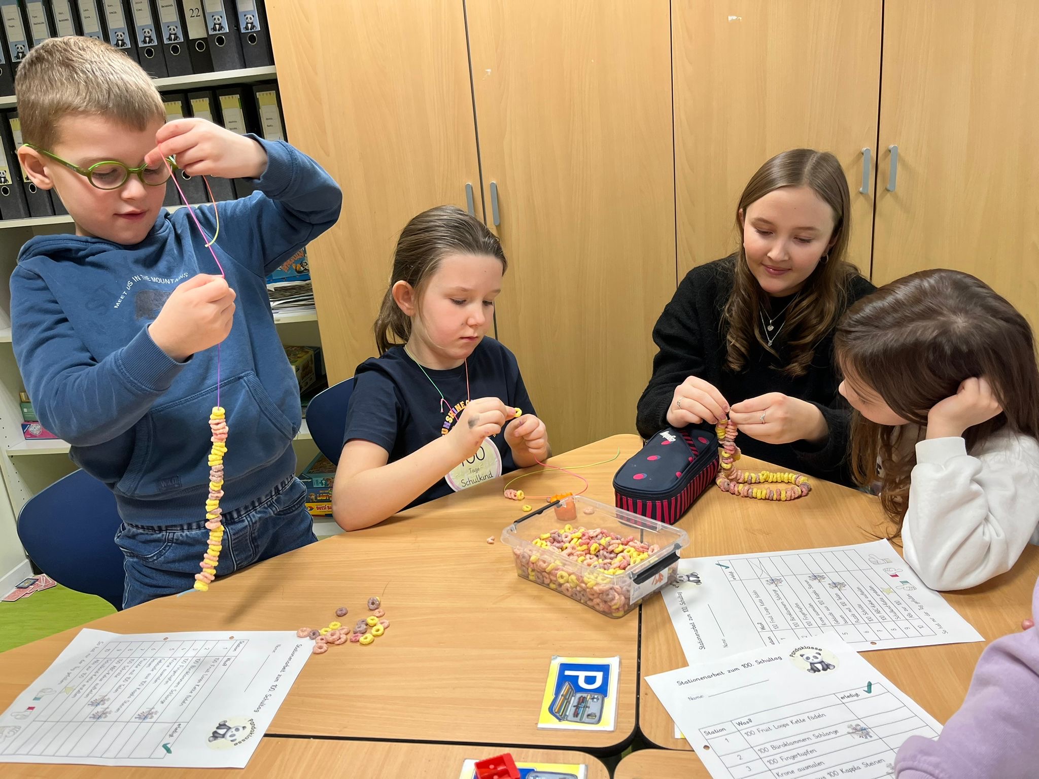 Anschließend begannen die Kinder mit einer Stationenarbeit. Die Mädchen und Jungen bauten Gebäude aus genau 100 Kappla-Steinen, machten eine Schlange aus genau 100 Büroklammern, erstellten sich eine Kette aus genau 100 Fruit-Loops, sind genau 100 Schritte gelaufen, haben ein Puzzle mit 100 Teilen gemacht oder haben ein Bild mit genau 100 Fingertupfen erstellt.