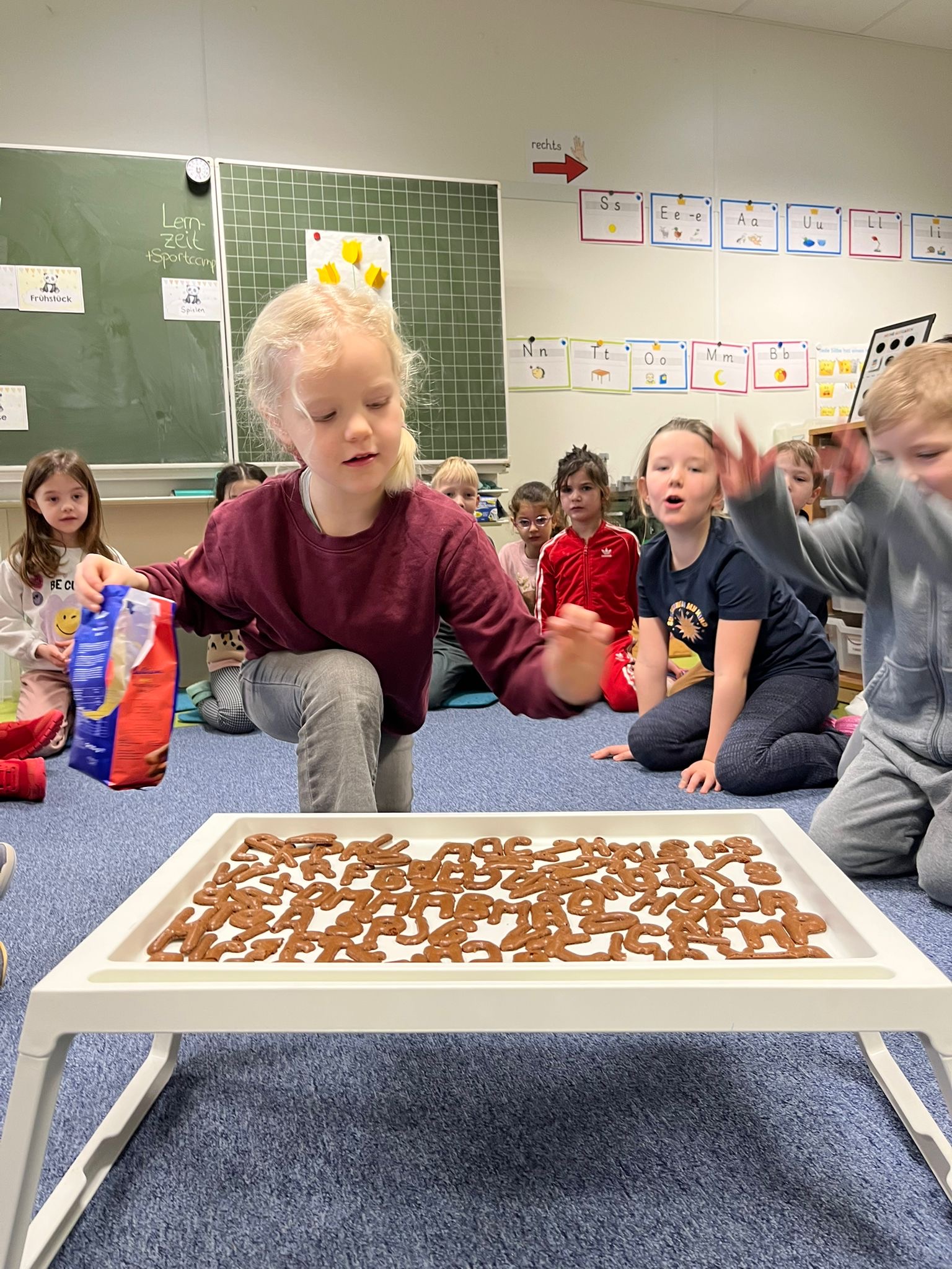 Nachdem die Kinder endlich die Zahl 100 an der Schultagezählmaschine einstellen konnten, teilten sie zuerst 100 Buchstabenkekse gerecht in der Klasse auf.