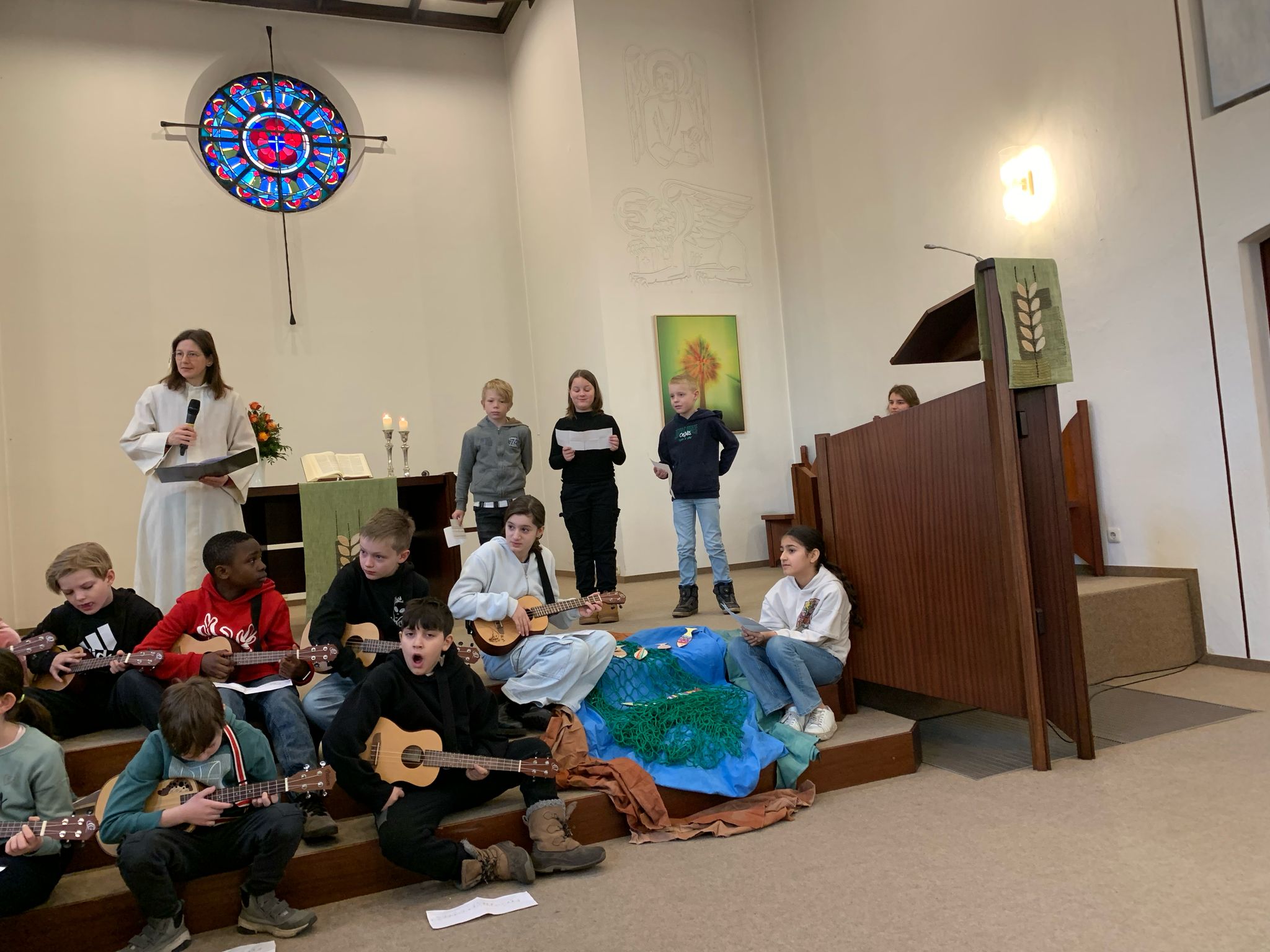Denn auf den Stufen des Altars werden sie bereits von den Kindern der 3a und ihrer Lehrerin Gudrun Nölkenbockhoff erwartet. Diese sitzen aber nicht einfach so auf den Stufen. Jedes Kind hält eine Ukulele in den Händen und wartet konzentriert auf den Beginn des Gottesdienstes, in dem sie die Lieder zum ersten Mal mit ihren Ukulelen begleiten sollen – dafür haben sie unter der Anleitung ihrer Klassenlehrerin lange geübt.