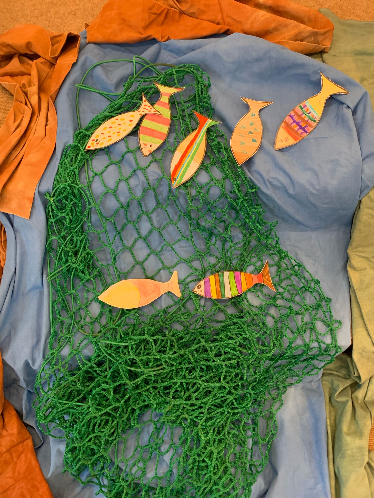 Nun ist auch das Fischernetz auf den Altarstufen mit bunten Fischen gefüllt. Da gibt es Fische mit Schuppen, Streifen und Punkten. Als Zeichen dafür, dass Jesus immer bei uns ist, darf sich jedes Kind einen bunt gestalteten Fisch mitnehmen.