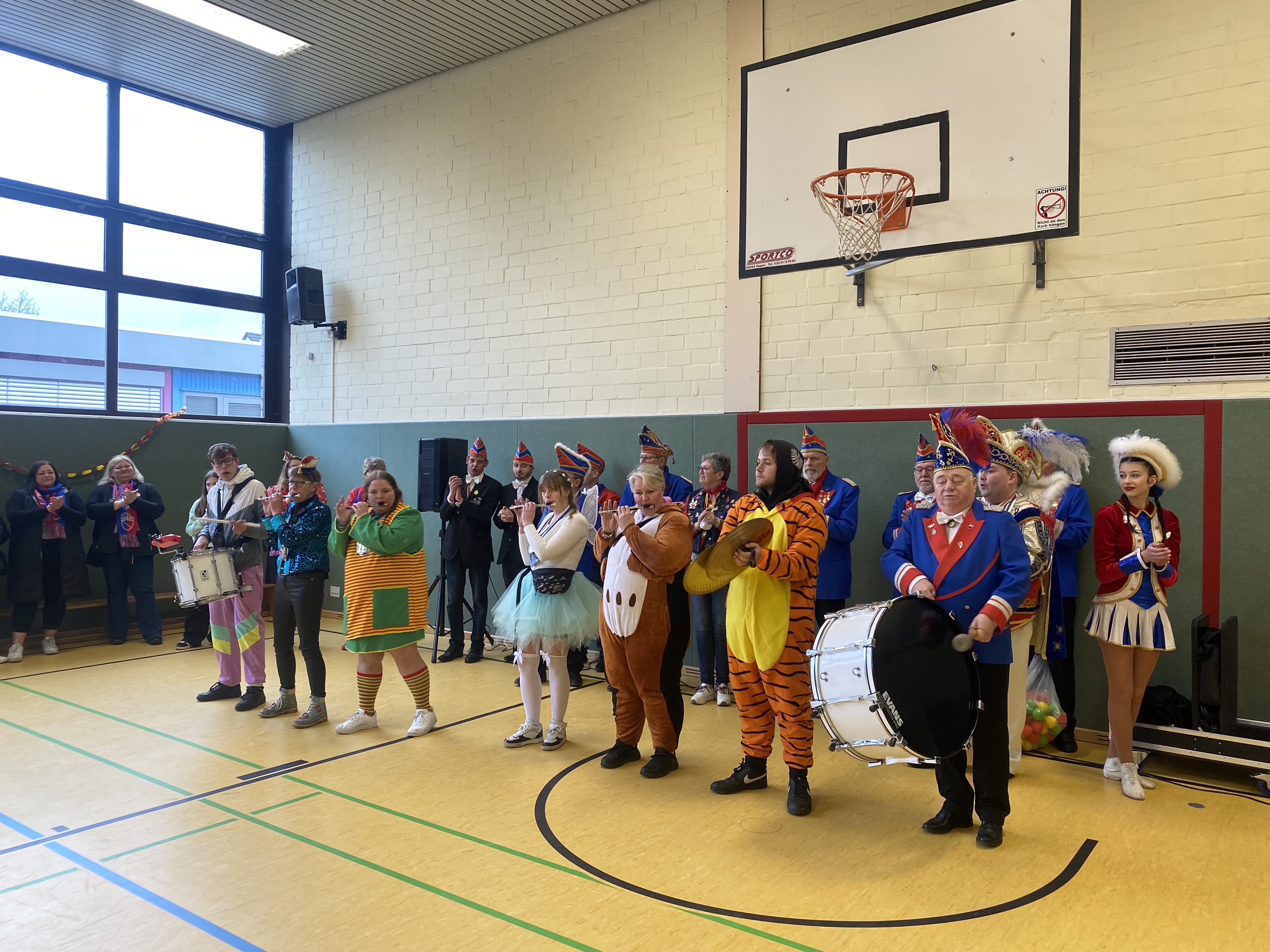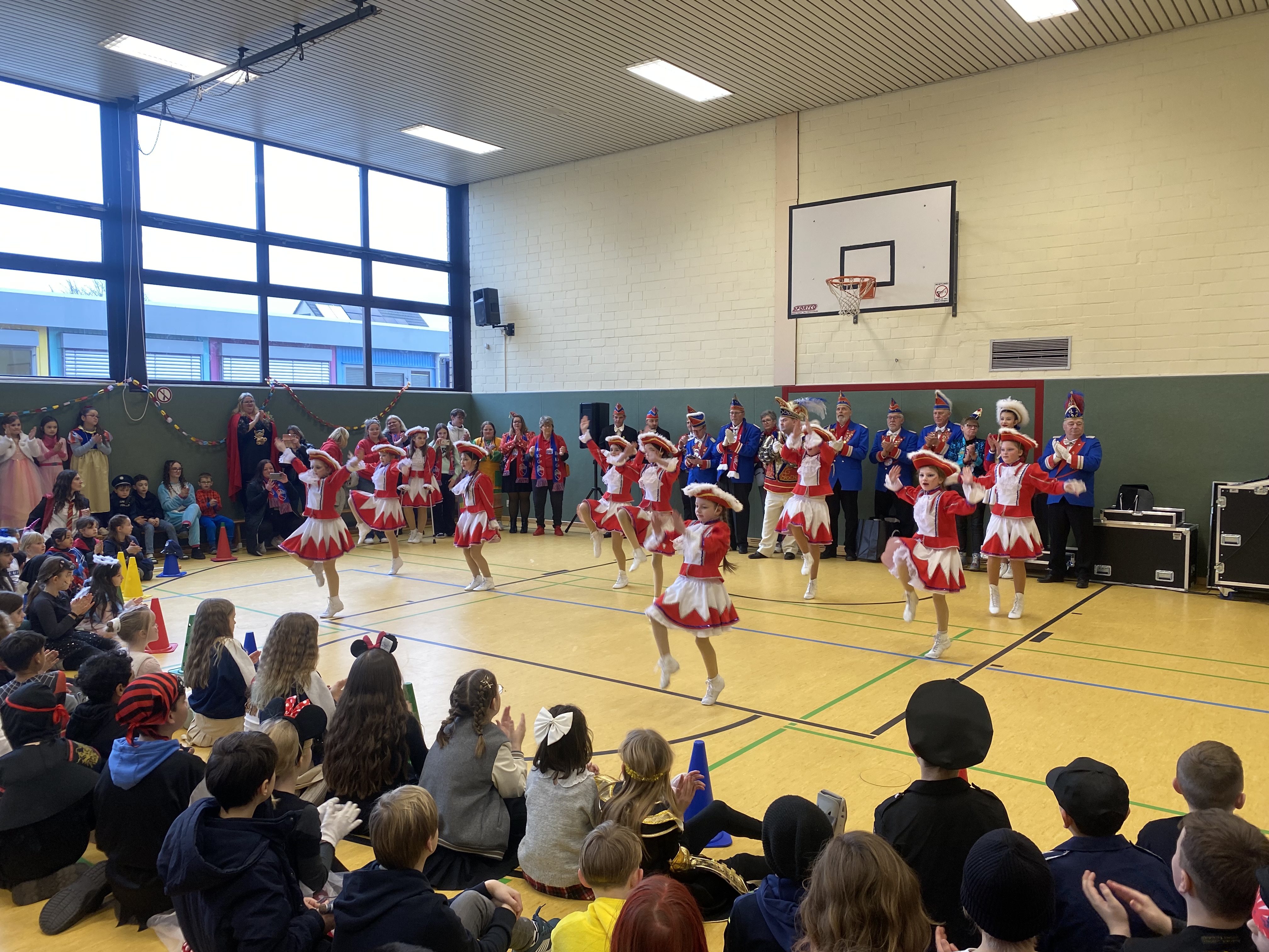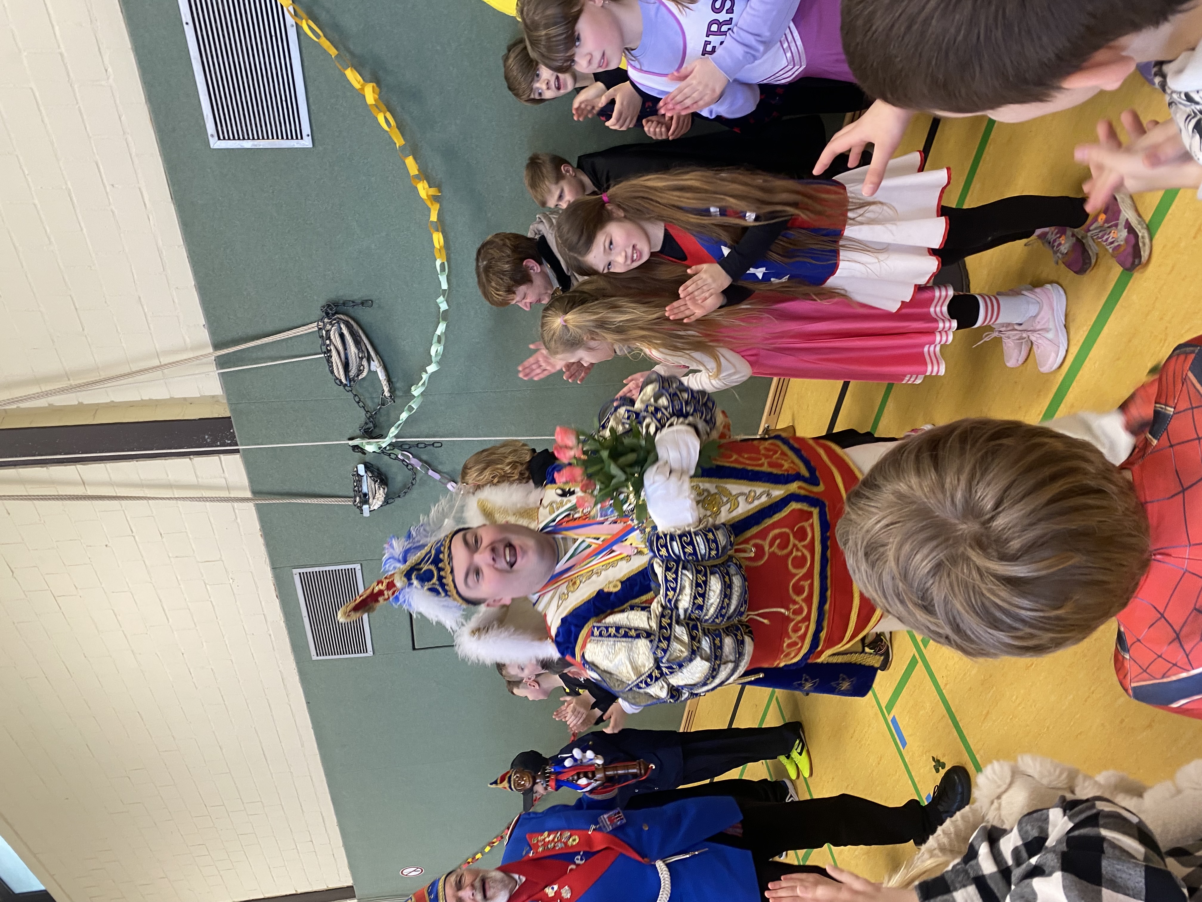 In diesem Jahr feierten wir ein ganz besonderes Karnevalsfest an unserer Schule, denn wir durften Prinz Manska den Ersten mit dem Reckenfelder Karnevals Verein an unserer Schule begrüßen. Aber der Reihe nach: Zunächst feierten alle Klassen mit ihren Lehrern in ihren Klassenräumen mit Spielen, Tanz und leckerem Essen oder einem Frühstück. Anschließend ging es in die Turnhalle wo der Prinz und sein Gefolge mit einem langen Spalier frenetisch begrüßt wurden. Dann zeigten uns die Roten Funken ihren Gardetanz und das Tanzmariechen ihren Solotanz. Das waren schon echte akrobatische und Tanz Highlights die uns da präsentiert wurden. Anschließend wurde dann gemeinsam noch getanzt, gefeiert, geschunkelt und eine große Polonaise durch die Halle veranstaltet. Hier ein Video von den Feierlichkeiten in der Halle. Wer noch mehr Fotos sehen möchte, der klickt hier.