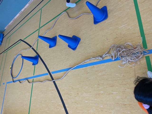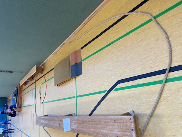 Dann wurde es kreativ: Die Kinder planten und bauten in kleinen Gruppen ihre eigenen Minigolfbahnen. Dabei überlegten sie, welche Hindernisse die Bahn spannend machen, wie zum Beispiel Rampen oder Tunnel. Zudem haben sie vorher überlegt welche Merkmale eine Minigolfbahn haben sollte, damit man am Ende gut darauf spielen kann. Nach dem Bau der eigenen Bahnen, trafen sich die Kinder mit einer anderen Gruppe und überprüften gegenseitig, ob die den vorher gemeinsam festgelegten Merkmalen entsprach. Hat die Bahn einen Startpunkt und ein Ziel? Gibt es eine Begrenzung der Bahn, damit der Ball nicht durch die ganze Halle rollt? Besonders beeindruckend ist der tolle Einsatz und die Teamarbeit der Kinder beim Auf- und Abbau der Minigolfbahnen der vielen Materialien und Geräte.