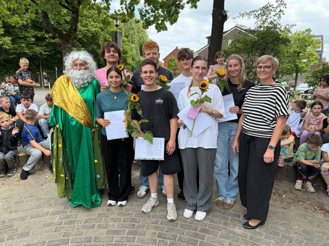 Zum Abschied bedankten sich das Team der OGS, die Kinder der OGS und das gesamte Team der Schule herzlich für die tolle Zusammenarbeit. Als Höhepunkt durften die Bufdis – wie es an der PGS schon gute Tradition ist – ihre wohlverdiente „Taufe“ entgegennehmen. Mit viel Humor, guter Laune und einem Augenzwinkern wurden sie offiziell in die Riege der „ehemaligen Bufdis“ aufgenommen.
