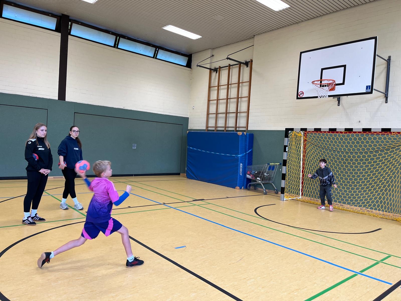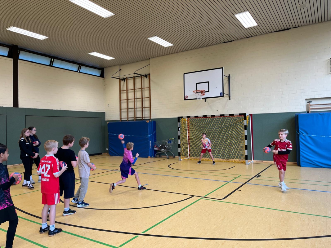 Nach dem Techniktraining folgten kurze Handballspiele in der Turnhalle zwischen den Klassen, bei denen das Gelernte direkt angewendet werden konnte. Lehrkräfte und Trainer lobten die Fairness und den großen Einsatz der Kinder.