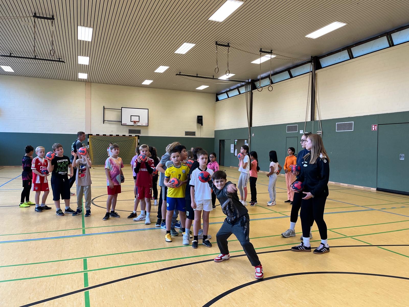 An verschiedenen Übungsstationen konnten die Kinder Passen, Fangen, Prellen und gezieltes Werfen trainieren. Unter Anleitung der Trainerinnen und Trainer und einiger Sporthelferinnen und Sporthelfer von zwei weiterführenden Schulen übten sie spielerisch die Grundlagen des Handballs. Dabei kam der Spaß nie zu kurz – auch kleine Wettkämpfe sorgten für Spannung und Jubel.