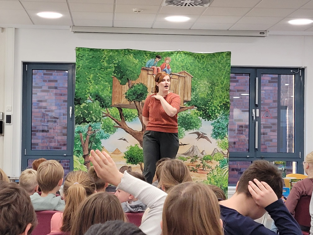 Große Aufmerksamkeit und gespannt-gespannte Gesichter herrschten diese Woche in der Stadtbücherei: Unsere Dritt- und Viertklässler erlebten eine ganz besondere Lesung. Die Schauspielerin Laura Mann las den Kindern aus dem Buch "Das magische Baumhaus – Das verzauberte Spukschloss" vor. Mit ausdrucksstarker Stimme und lebendiger Erzählweise verstand sie es hervorragend, ihre jungen Zuhörer in den Bann zu ziehen. Besonders begeistert waren die Kinder, als sie selbst in die Handlung einbezogen wurden: Sie lieferten passende Geräusche wie knarrende Türen, rauschenden Wind oder das Krähen der Raben und machten die Lesung so zu einem echten Hörerlebnis. Am Ende spendeten Kinder und Lehrkräfte kräftigen Applaus für eine phantastische Darbietung.