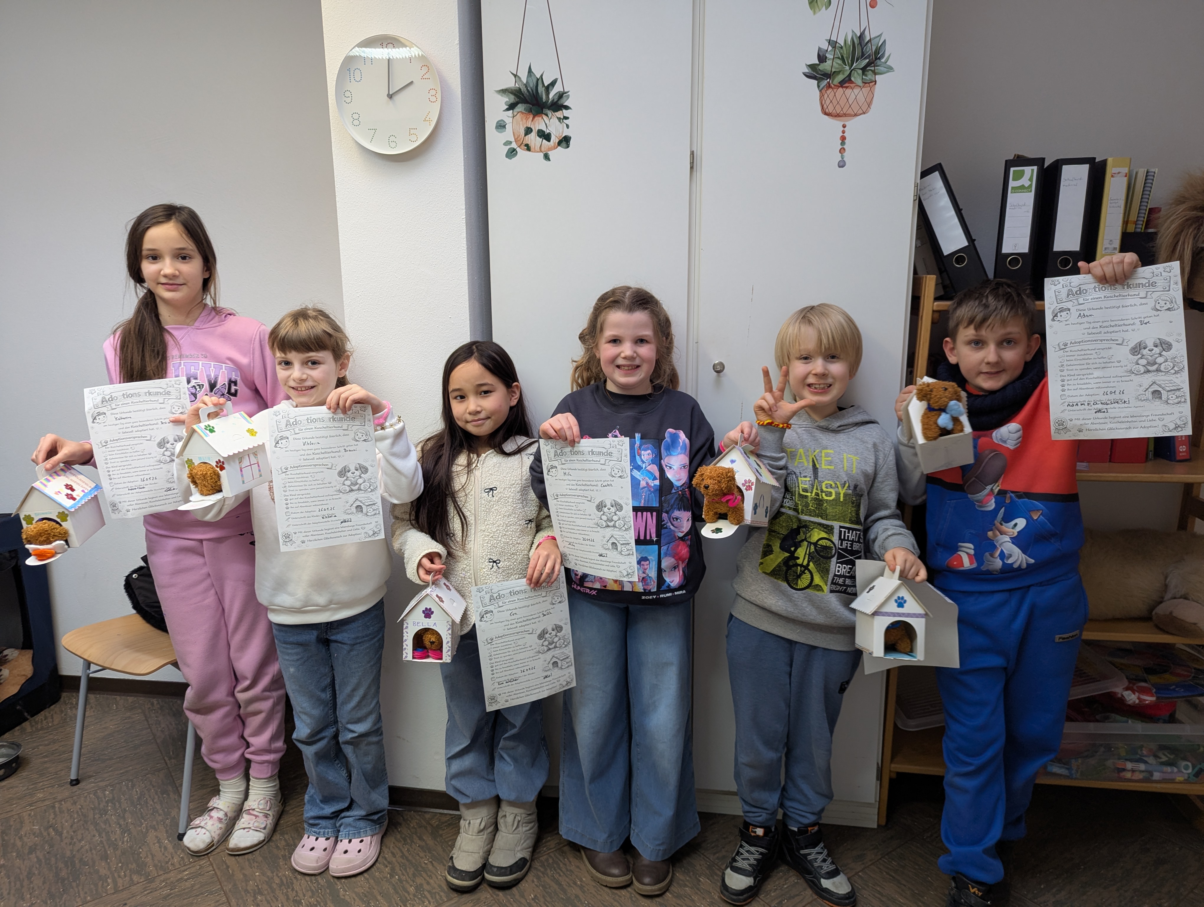 Mit viel Begeisterung gestalteten die Kinder Hundehütten, bastelten individuelle Halsbänder und unterschrieben zum Abschluss feierlich die Adoptionsurkunden für ihre neuen tierischen Begleiter. Die Freude war groß – jedes Kind durfte einen eigenen Kuschelhund adoptieren, der sie auch über das Ende der AG hinaus an die gemeinsame Zeit erinnern wird.