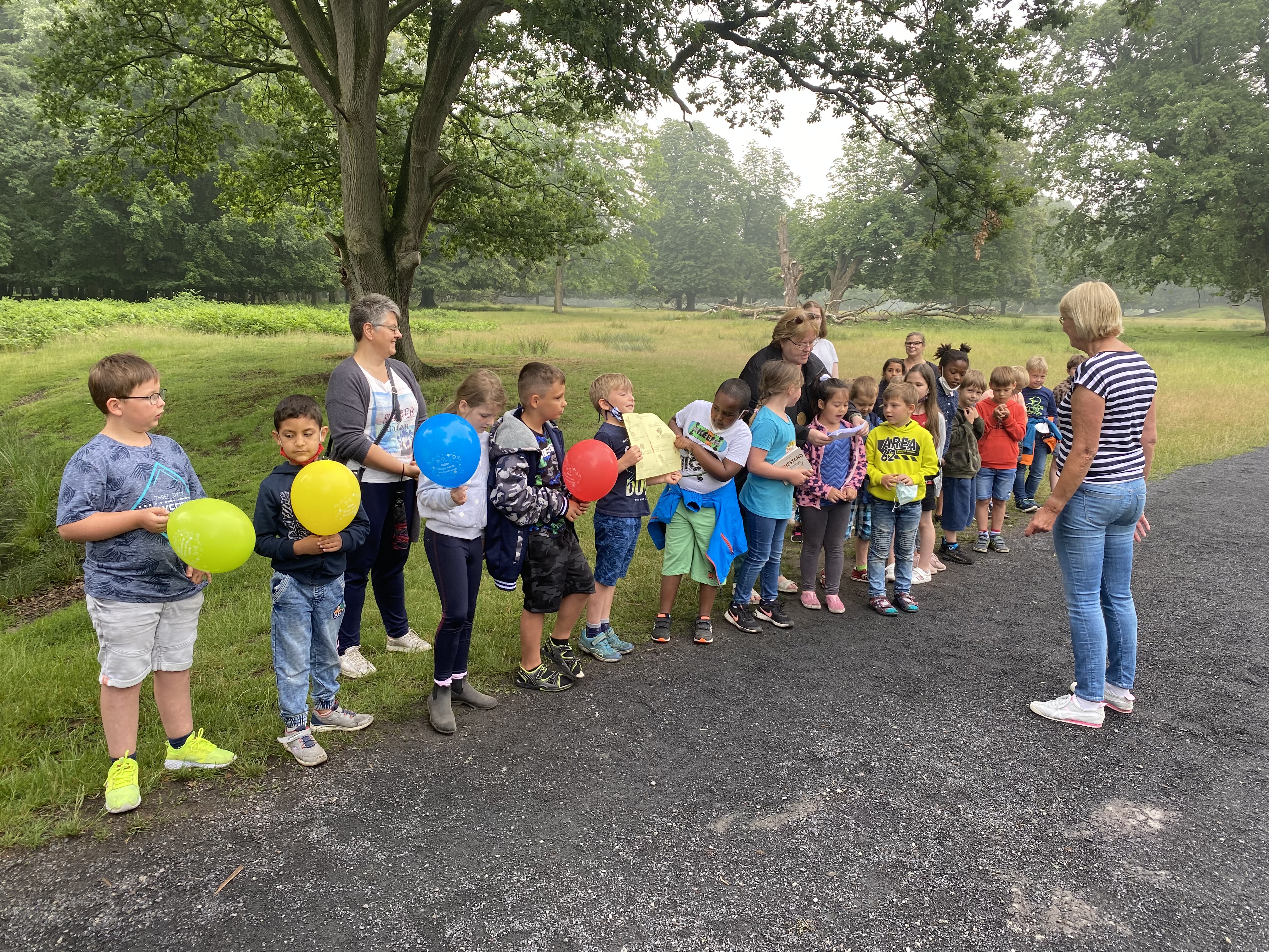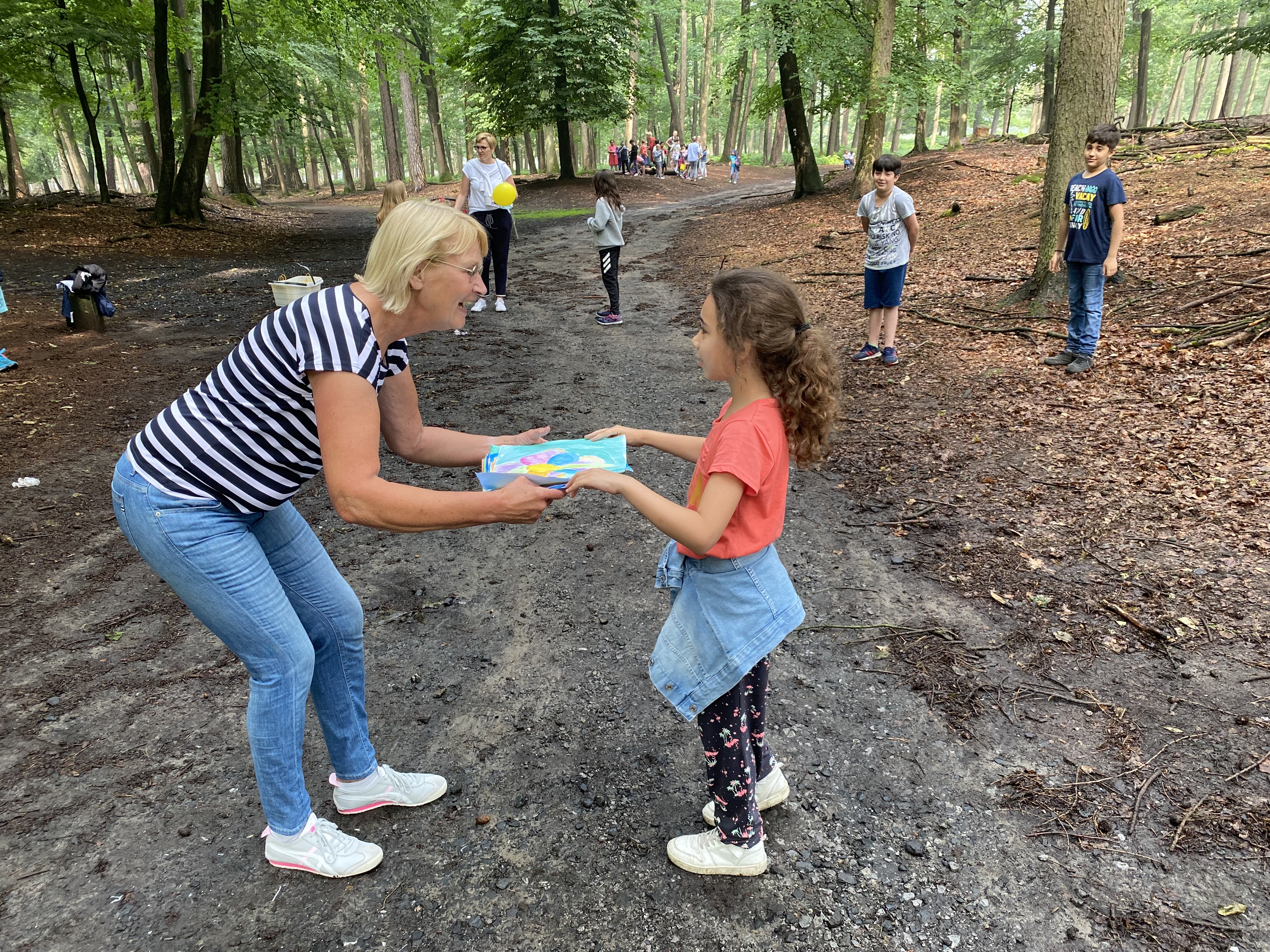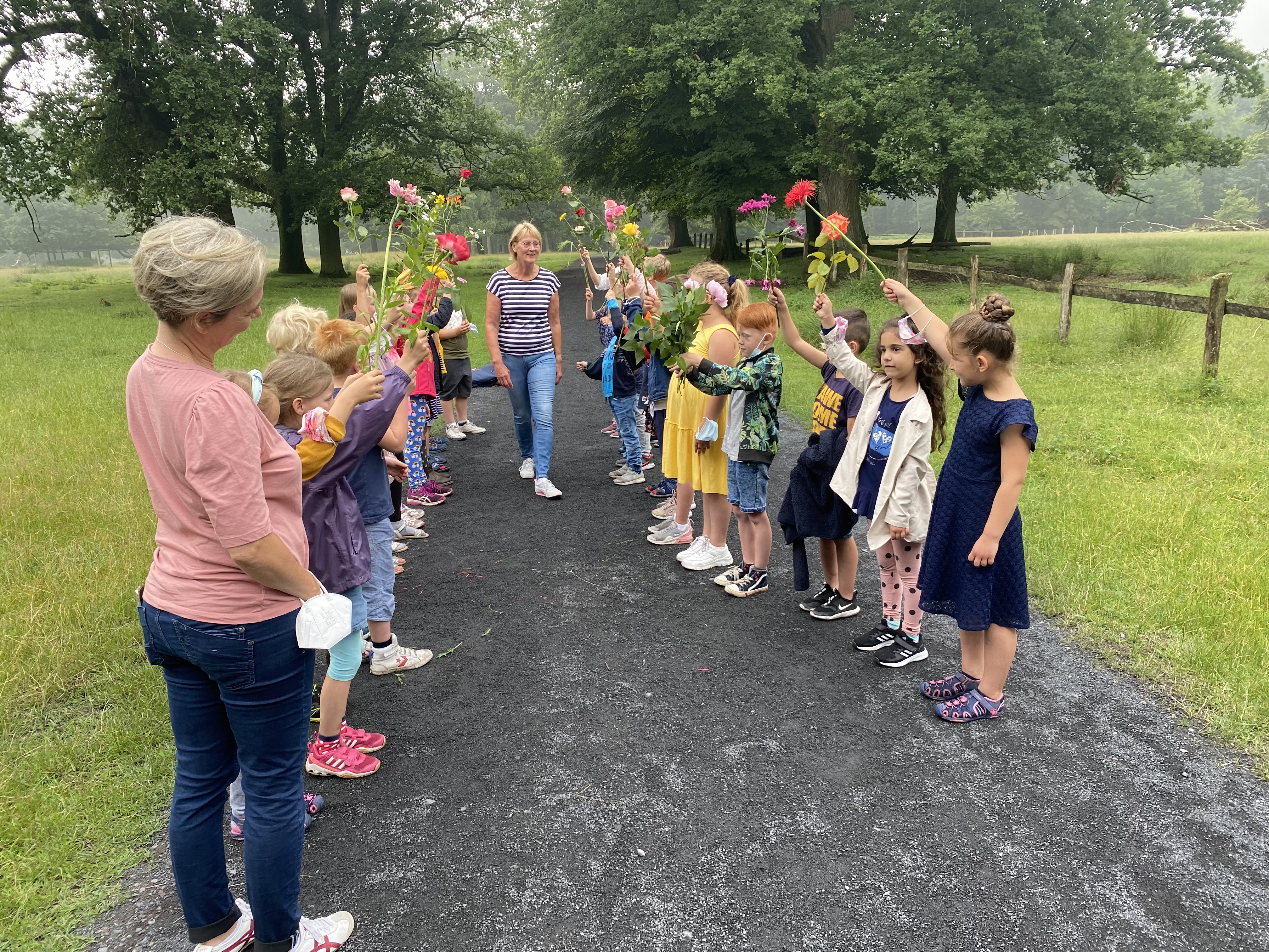 Am 29.06.2021 konnten wir endlich gebührend Frau Stork-Schwabe, unsere ehemalige Schulleiterin mit allen Kindern im Wildpark verabschieden. Das war leider im Januar nicht möglich gewesen. Umso größer war dann die Überraschung, als alle Klassen auf einem Rundweg durch den Wildpark verteilt, Frau Stork-Schwabe erwarteten. Jede Klasse hatte einen kleinen Programmpunkt vorbereitet. So gab es z. B. sportliche, künstlerische und musikalische Beiträge. Frau Stork-Schwabe war total begeistert und konnte sich von jeder Klasse ganz in Ruhe verabschieden. Als Dankeschön erhielten die jeweiligen KlassensprecherInnen eine Tüte voller Süßigkeiten, die dann an den letzten Schultagen geplündert werden konnte. Wir sagen Dankeschön für alles und auf ein baldiges Wiedersehen, Frau Stork-Schwabe!