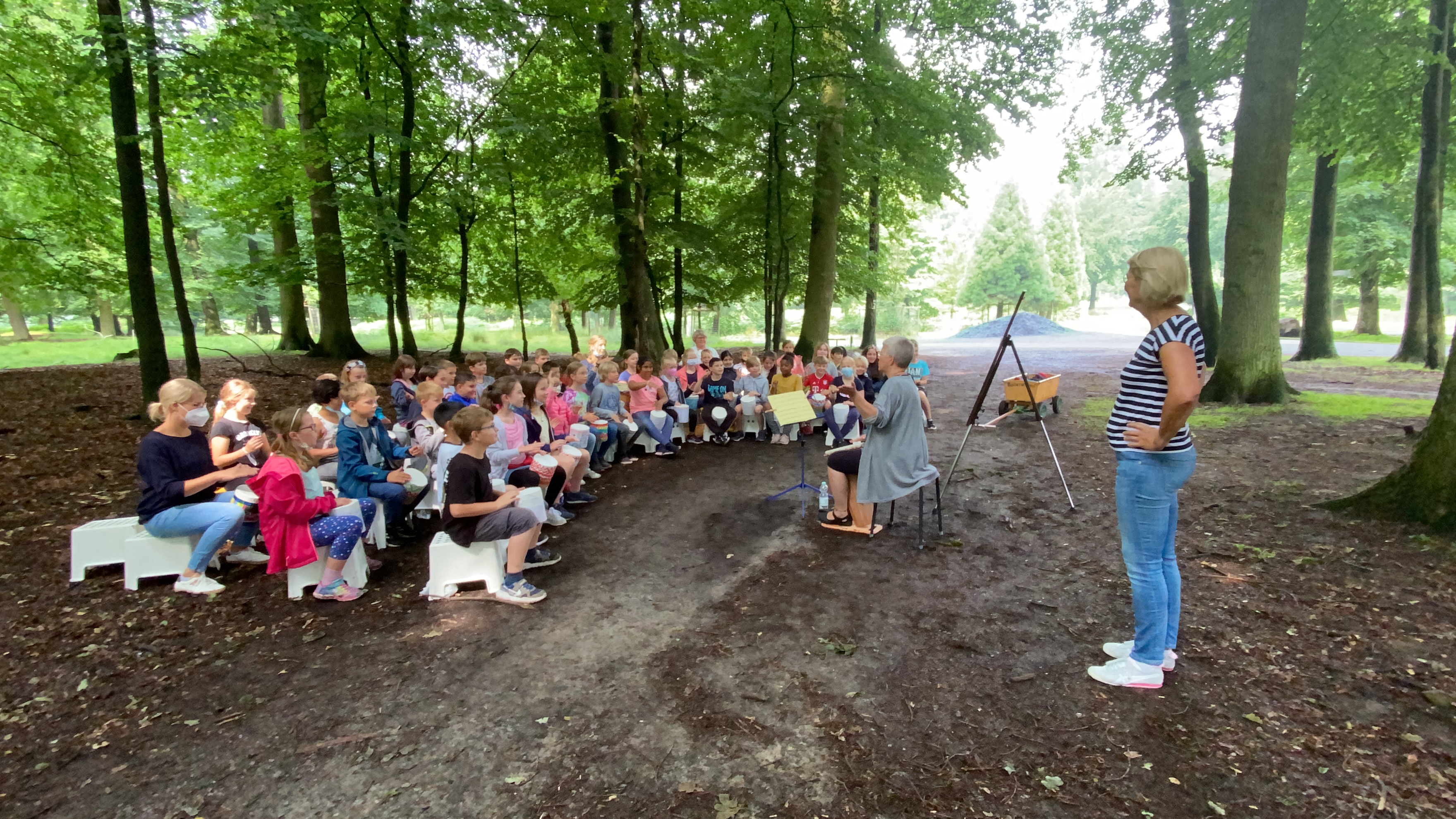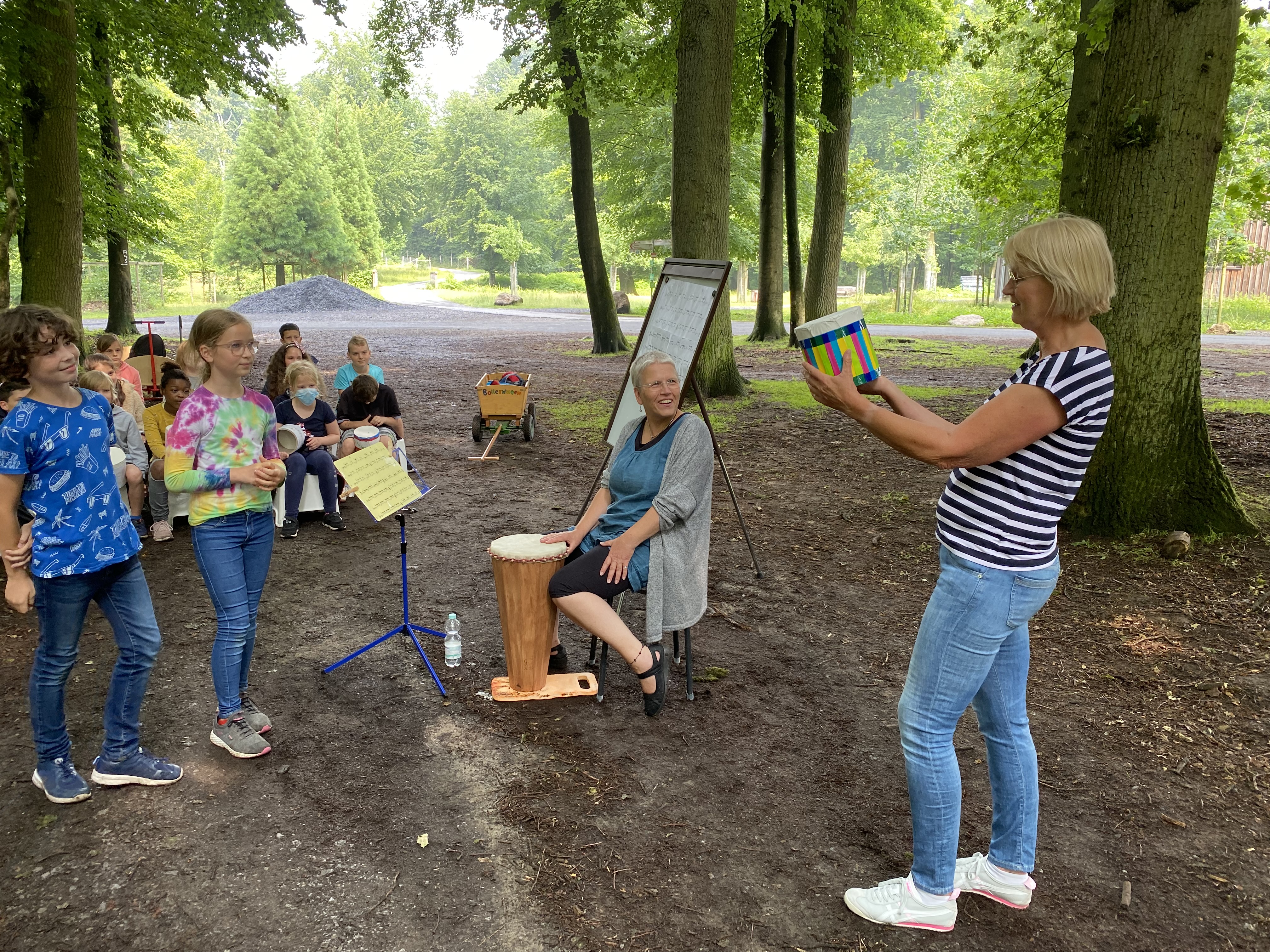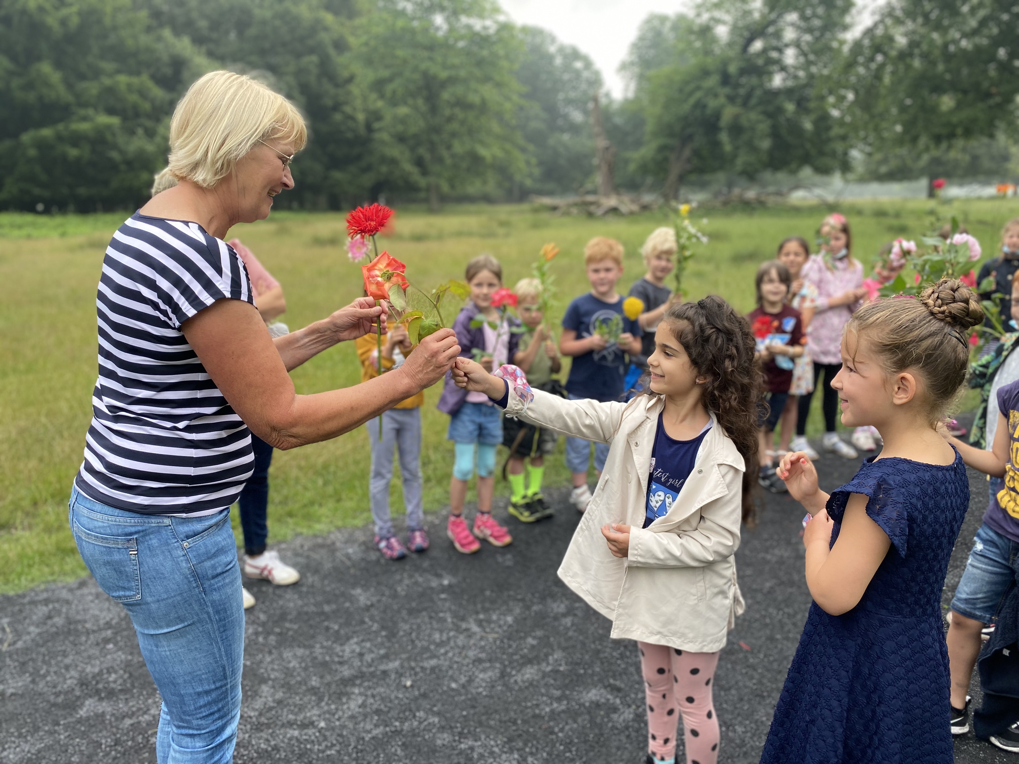 Am 29.06.2021 konnten wir endlich gebührend Frau Stork-Schwabe, unsere ehemalige Schulleiterin mit allen Kindern im Wildpark verabschieden. Das war leider im Januar nicht möglich gewesen. Umso größer war dann die Überraschung, als alle Klassen auf einem Rundweg durch den Wildpark verteilt, Frau Stork-Schwabe erwarteten. Jede Klasse hatte einen kleinen Programmpunkt vorbereitet. So gab es z. B. sportliche, künstlerische und musikalische Beiträge. Frau Stork-Schwabe war total begeistert und konnte sich von jeder Klasse ganz in Ruhe verabschieden. Als Dankeschön erhielten die jeweiligen KlassensprecherInnen eine Tüte voller Süßigkeiten, die dann an den letzten Schultagen geplündert werden konnte. Wir sagen Dankeschön für alles und auf ein baldiges Wiedersehen, Frau Stork-Schwabe!