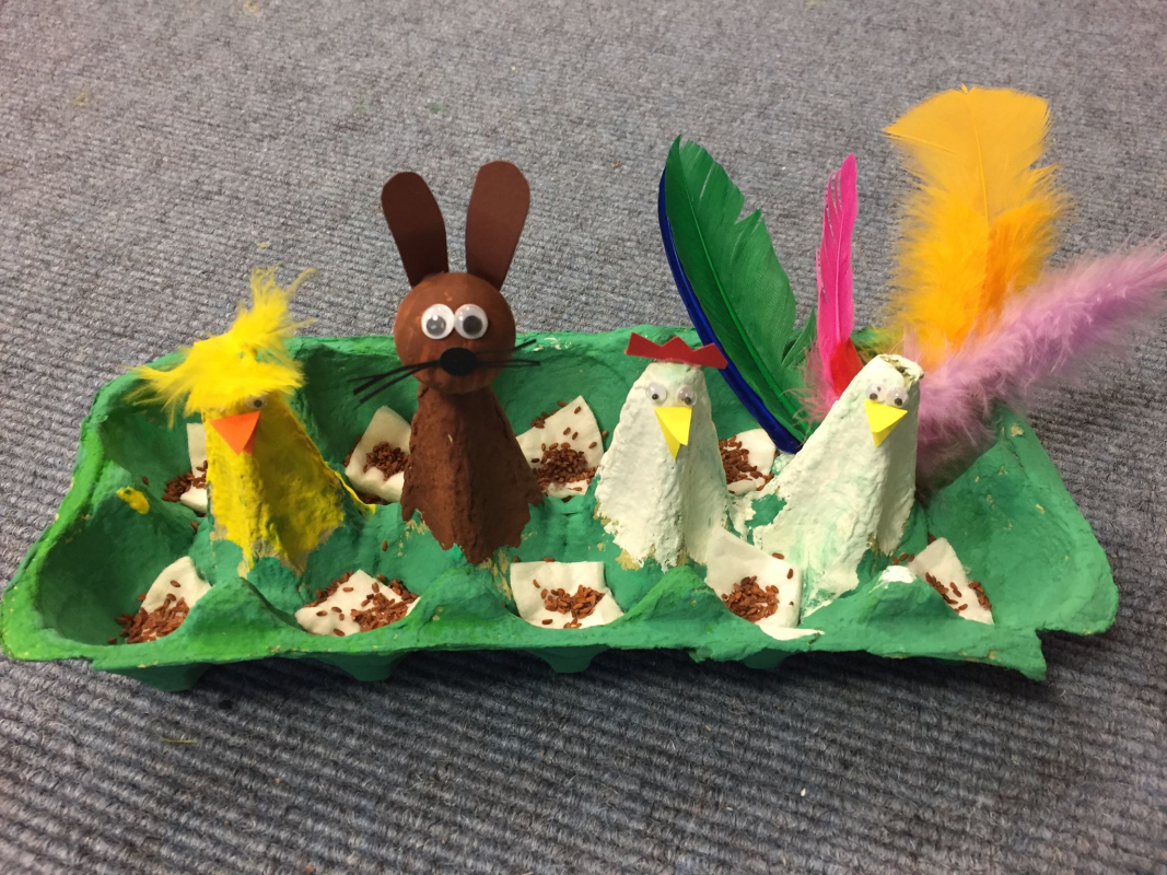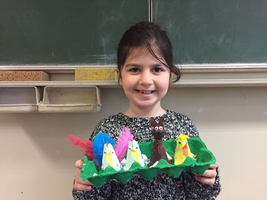 Bereits seit zwei Wochen stecken die Mädchen und Jungen der Klasse 1d in Ostervorbereitungen. Nachdem die Kinder österliche Bräuche kennengelernt, die Bedeutung des Osterfestes im Christentum besprochen und fleißig passende Lieder eingeübt haben, wurde natürlich auch gebastelt. Hier seht ihr drei tolle Ergebnisse. Nun müssen Hase, Hahn, Huhn und Küken noch etwas geduldig sein. In ca. 7 Tagen sitzen die Tiere in einem weichen Nest aus Kresse, welche die Kinder heute gesät haben.