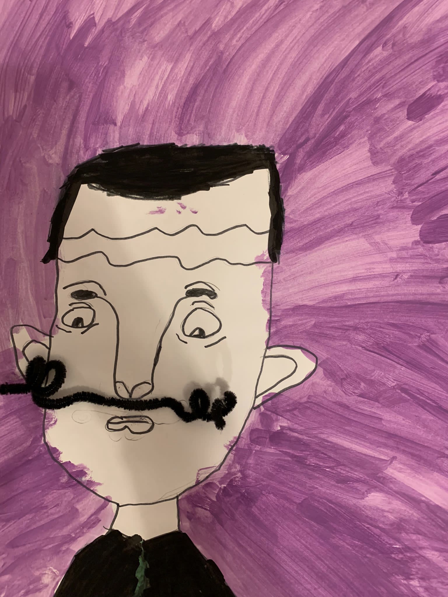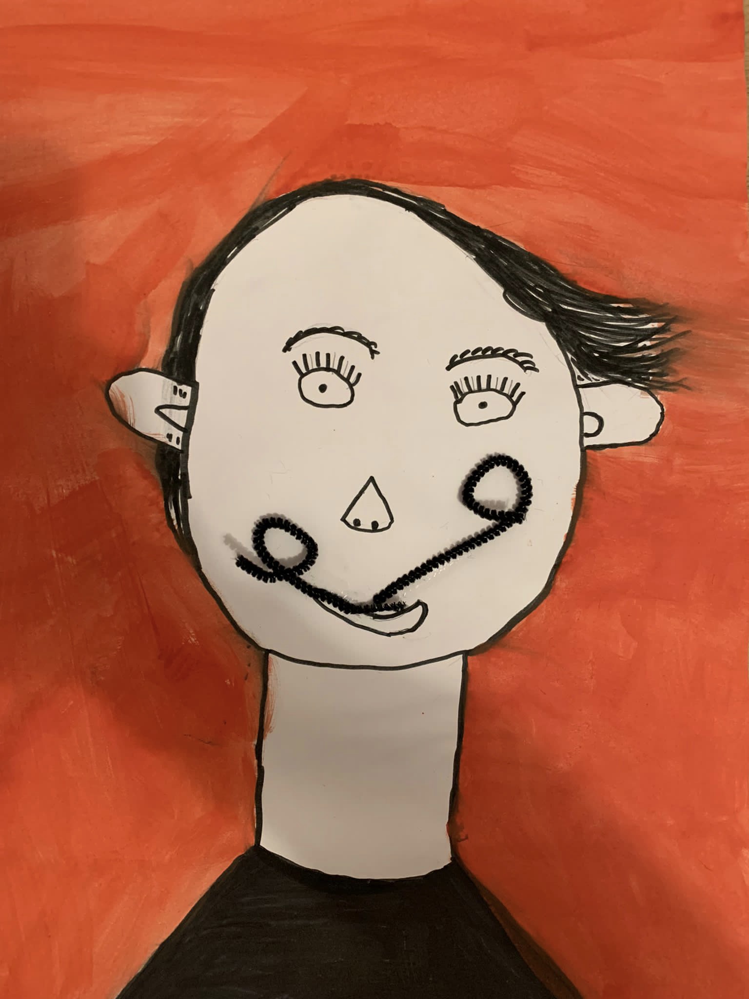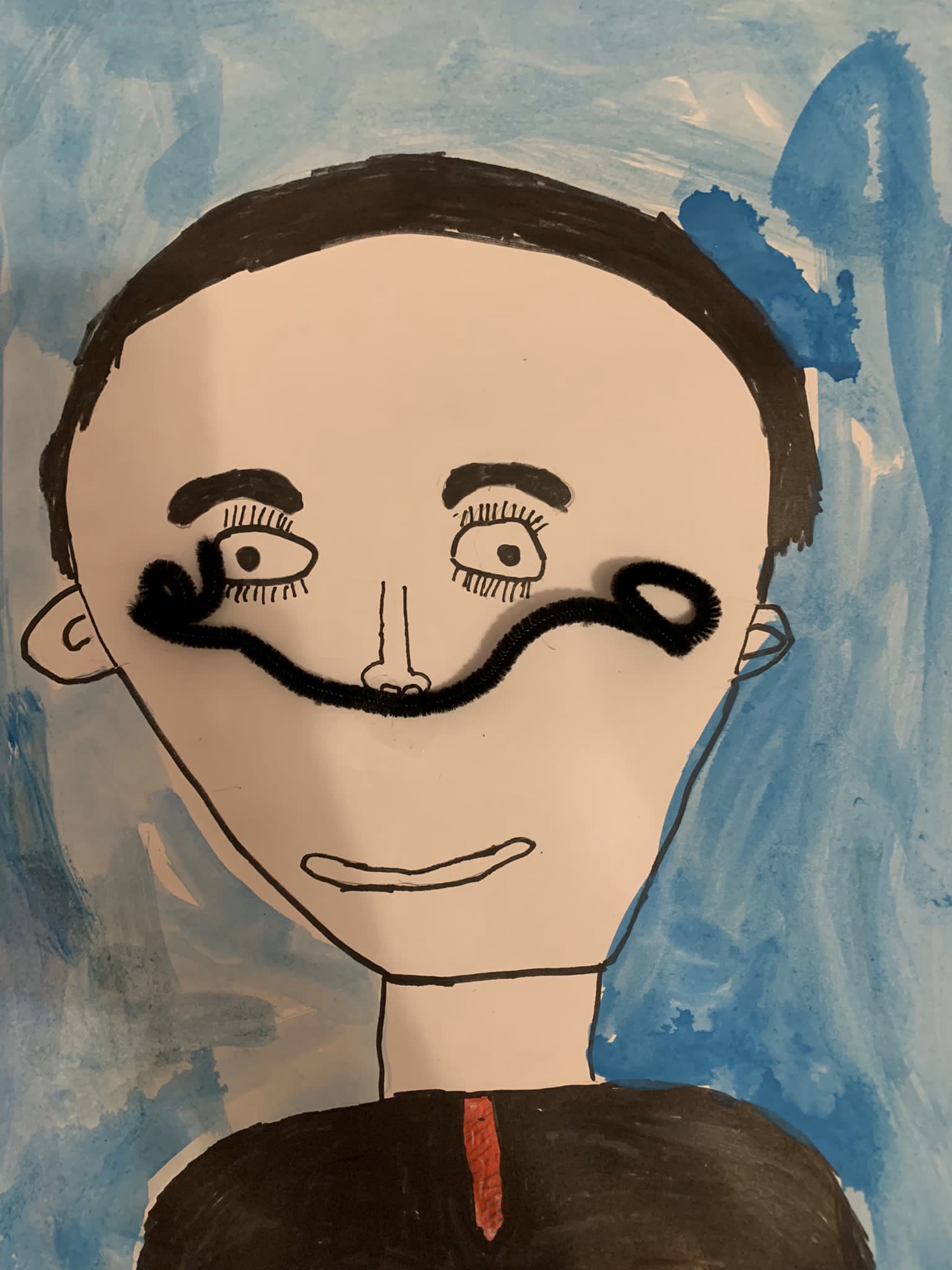 Und genau um diesen Schnurrbart ging es im ersten Bild der Kinder. Nachdem erarbeitet wurde, wie man ein gelungenes Portrait zeichnet, so dass die Augen nicht in der Stirn und der Mund nicht im Kinn sitzen, erstellten die Kinder mit schwarzem Fineliner Zeichnungen dieses berühmten Malers. Der Clou – sein Schnurrbart ist nicht einfach gezeichnet, sondern ein gebogener Pfeifenputzer.