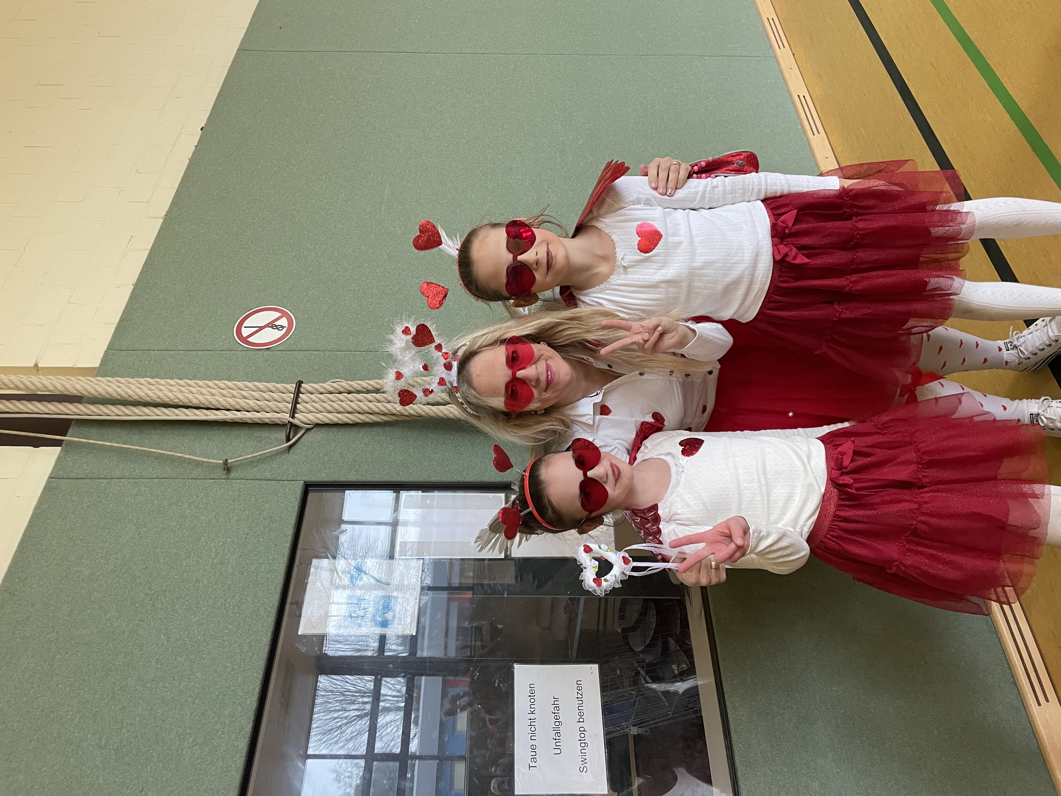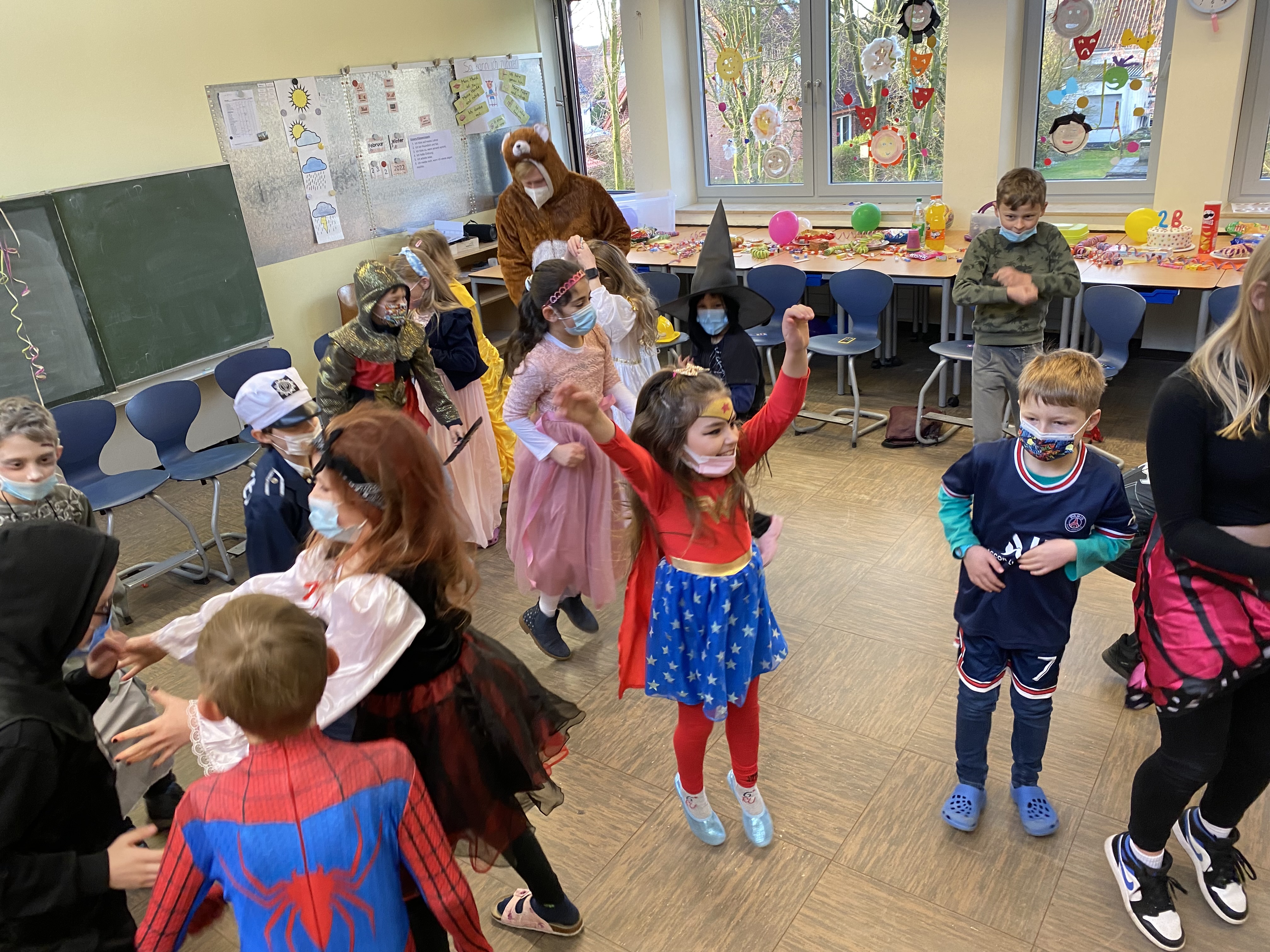 Immer freitags vor Rosenmontag feiern wir in der Schule Karneval. Zunächst feiern die Kinder und die Lehrer in ihren Klassen. Dann gibt es eine große gemeinschaftliche Feier mit vielen Aktionen und Musik in der Turnhalle.