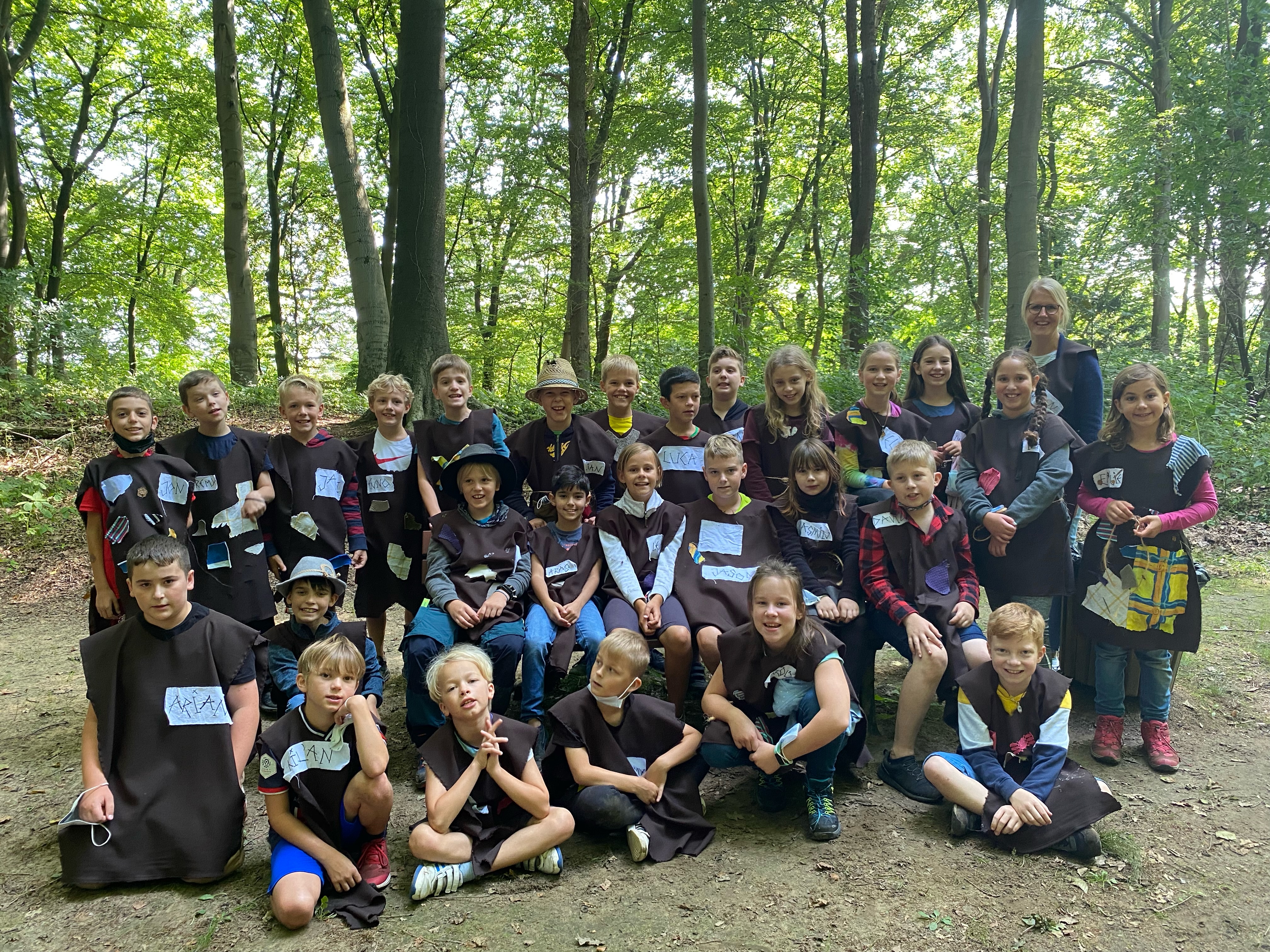 Morgens ist Herr Pennekamp mit einer großen Musikbox über die Flure gelaufen und hat uns geweckt. Danach haben wir uns fertig gemacht und sind zum Frühstücken gegangen. Anschließend sind die Räuberhauptleute gekommen und wir haben einen Waldspaziergang gemacht, bei dem wir Fragen beantworten mussten, Tiere gesucht und Spiele gespielt haben. Als wir fertig waren, sind wir wieder zurück gelaufen und zum Mittagessen gegangen. Danach kamen wieder die Räuberhauptleute und wir haben „Wilddruden-Alarm“ gespielt. Nachmittags sind wir indem Wald gegangen und haben kleine Häuser für die Rumpelwichte gebaut. Zum Abschluss des Tages haben wir ein Räuberfest gefeiert. Dann konnten wir wieder frei spielen. Am nächsten Morgen sind wir nach dem Frühstück wieder mit dem Bus nach Hause gefahren.
