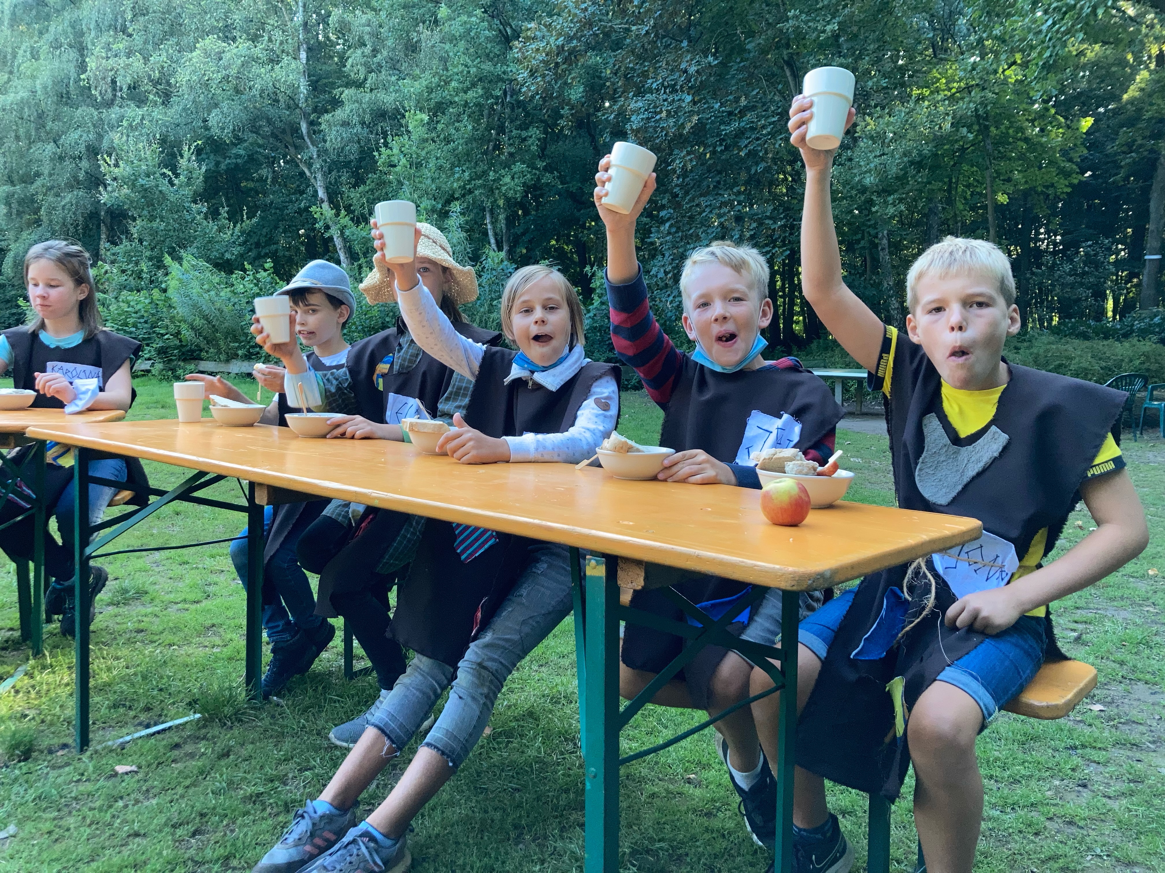 Außerdem hatten wir ein richtig tolles Programm: Der erste Tag startete mit einer Prüfung die uns zu Räubern machte. Nachdem wir die Koffer ausgepackt und die Betten bezogen hatten, bekamen wir von unseren Räuberhauptmännern eine Führung über das Gelände. Danach hatten wir freie Spielzeit, die wir auf der Wiese oder auf einem Kletterparcour, den Frau Leifken gebucht hatte, verbracht haben. Nach der Spielzeit hatten wir einen Räubertreff in dem wir nochmal über alles gesprochen haben. Als wir damit fertig waren, gab es Mittagessen und zwar Reis mit Paprikasoße oder Geschnetzeltem. Nach dem Essen hatten wir wieder freie Spielzeit, doch diesmal konnten wir nicht auf den Parcour gehen, weil er ja nicht mehr für uns reserviert war. Später hatten wir wieder einen Räubertreff und danach gab es Abendbrot und es gab, wie der Name schon sagt, ein Butterbrot mit verschiedenen Belägen. Am Ende des Abends haben wir die Regeln, wann wir ins Bett müssen und wann wir aufstehen dürfen, besprochen und dann ging es ins Bett.