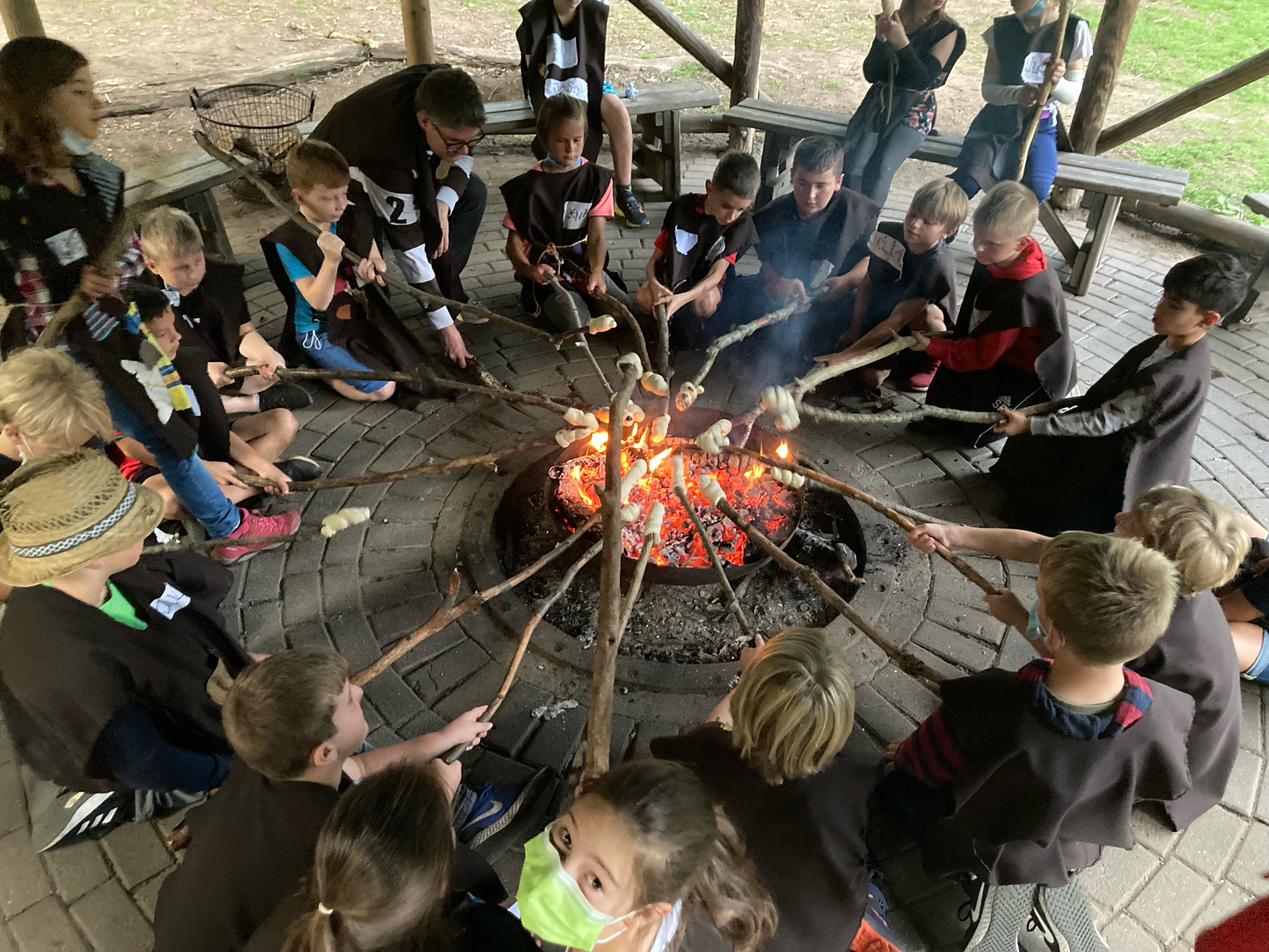 Erst als wir die drei Prüfungen bestanden hatten, sind wir ins Haus gegangen und konnten unsere Sachen auf den Zimmern auspacken. Als alle fertig waren, sind wir Mittagessen gegangen. Danach hatten wir freie Spielzeit. Als die Spielzeit zu Ende war, sind die drei Räuberhauptleute wieder gekommen und wir haben Räuberkutten aus Stoff gebastelt. Danach gab es Abendessen. Anschließend haben wir „Wo ist mein Huhn?“ gespielt und die Räuberhauptleute haben noch ein Lagerfeuer angezündet. Wir haben Stockbrot und Marshmallow gegrillt und gegessen. Im Anschluss hatten wir noch ein bisschen freie Spielzeit. Um 21:15 Uhr mussten wir immer reingehen und uns bettfertig machen. Wir durften noch bis 22:00 Uhr in unseren Zimmern spielen. Dann mussten wir schlafen.