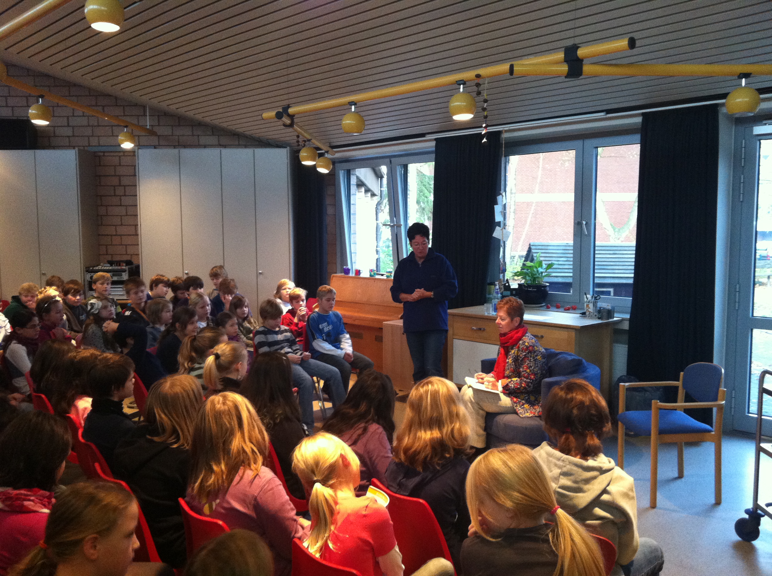 So besuchte uns anlässlich des 8. bundesweiten Vorlesetages die Ministerin für Bundesangelegenheiten, Europa und Medien, Frau Dr. Angelica Schwall-Düren. Spannend trug sie Auszüge aus Erich Kästners Buch "Pünktchen und Anton" vor und animierte die Kinder der Klassen 4 zum Weiterlesen. Anschließend beantwortete die Ministerin noch viele Fragen, verteilte Autogramme und erlaubte einen Blick in ihr Dienstfahrzeug.