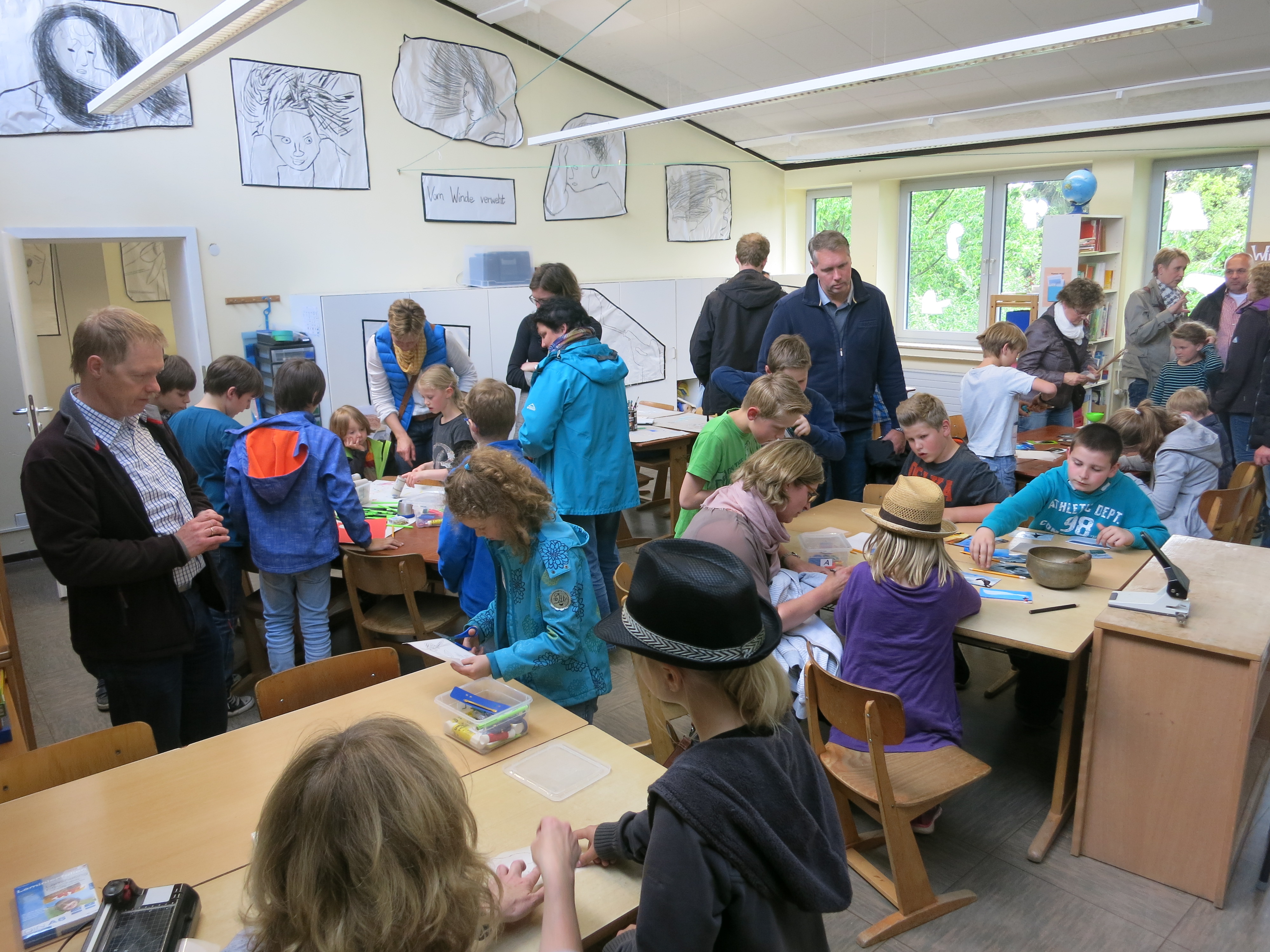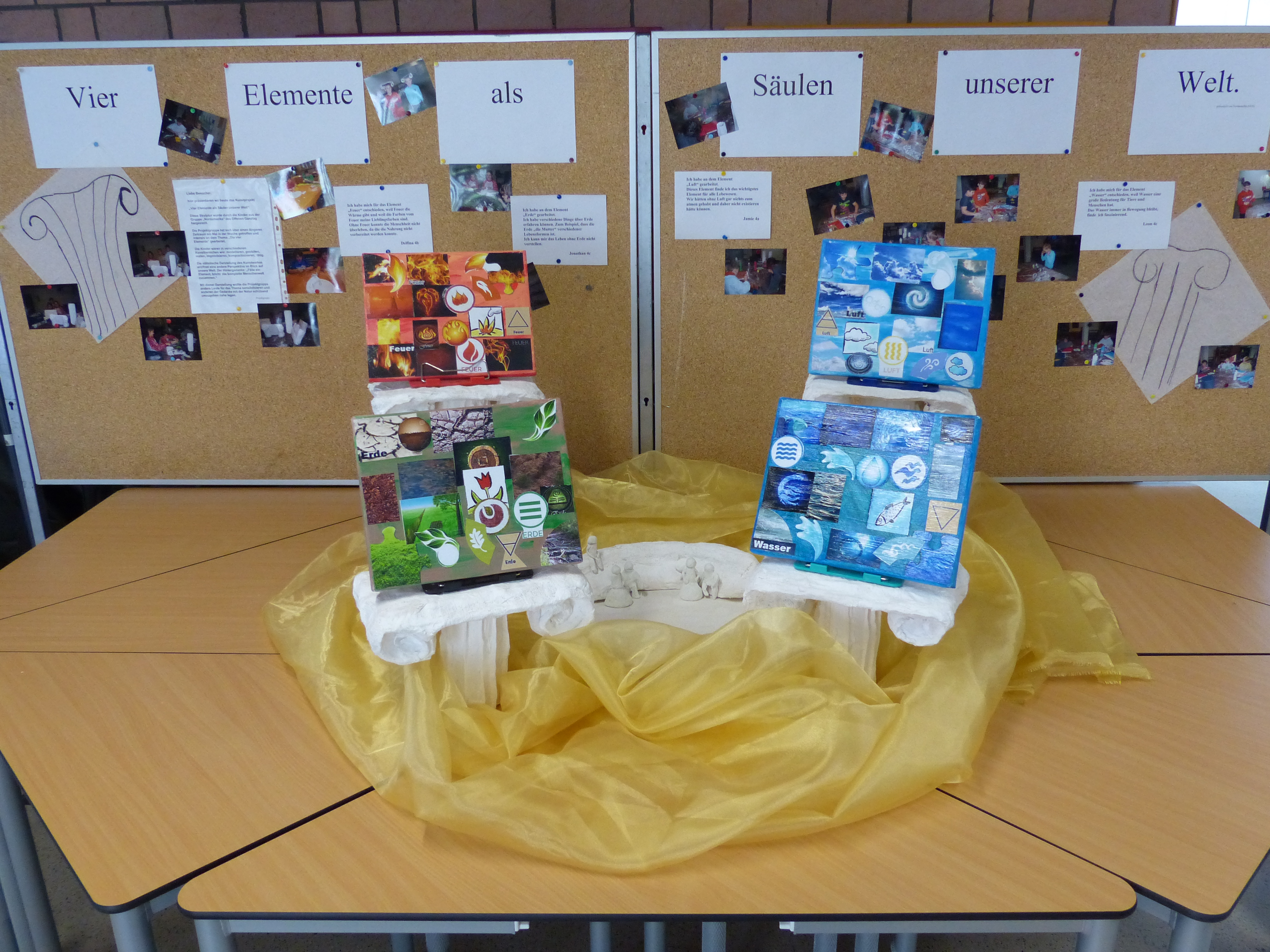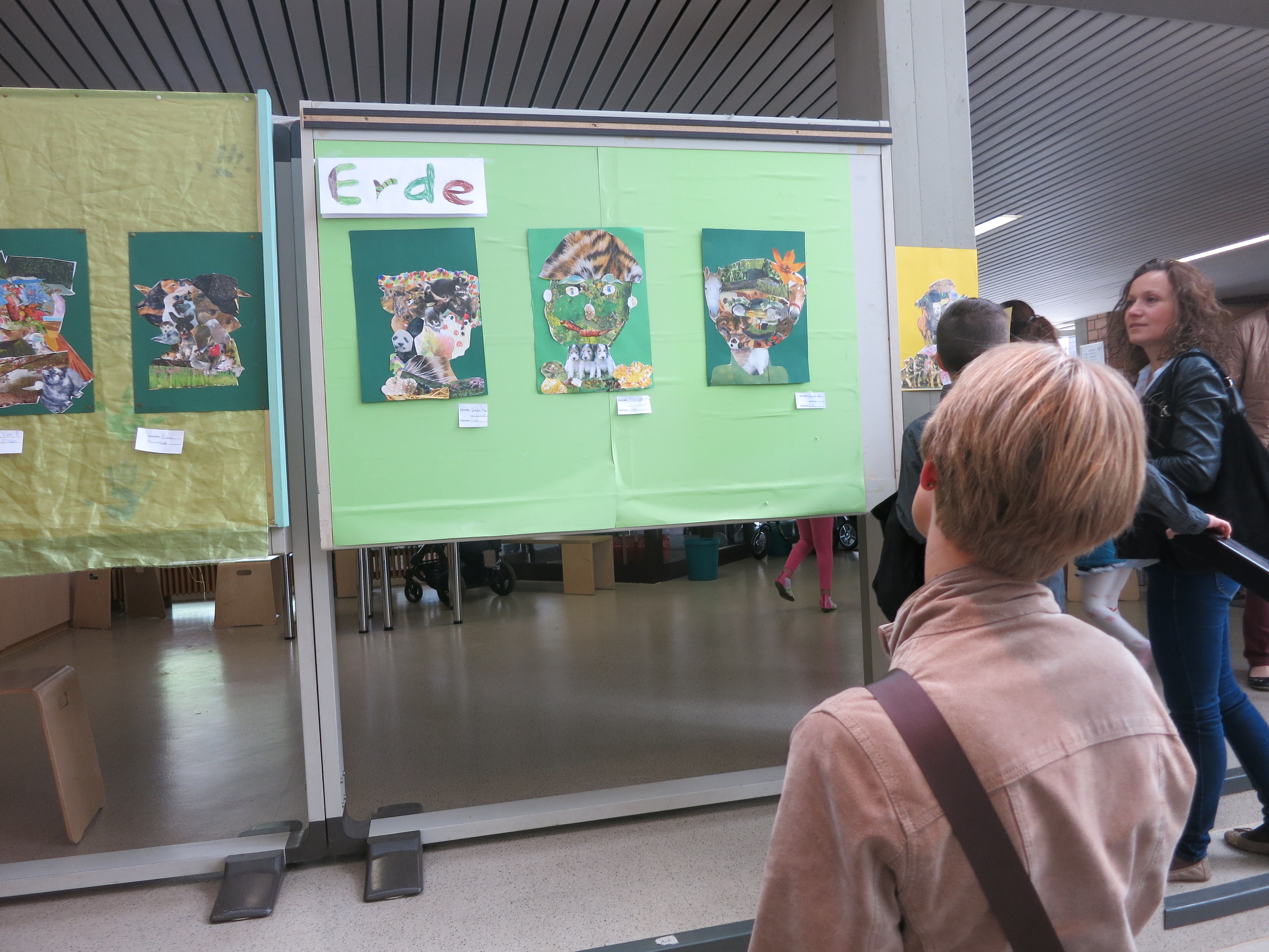 Im Jahr 2015 stand die Kunstausstellung unter dem Motto "Feuer, Wasser, Erde, Luft - die vier Elemente". Die Kinder haben dazu gemalt, gebastelt, modelliert und installiert. Unser damaliger Jahrespraktikant Herr Dittmann und Frau Wigger haben extra für die Kunstausstellung das "Lied der Elemente" geschrieben. Neben den Kunstwerken gab es noch jede Menge Mitmachangebote. So konnte man Windmühlen basteln, Pustebilder erstellen, Malen mit einem Strich wie Picasso, Steine bemalen usw.. Der Förderverein sorgte mit dem Grillstand und der Cafeteria für das leibliche Wohl.